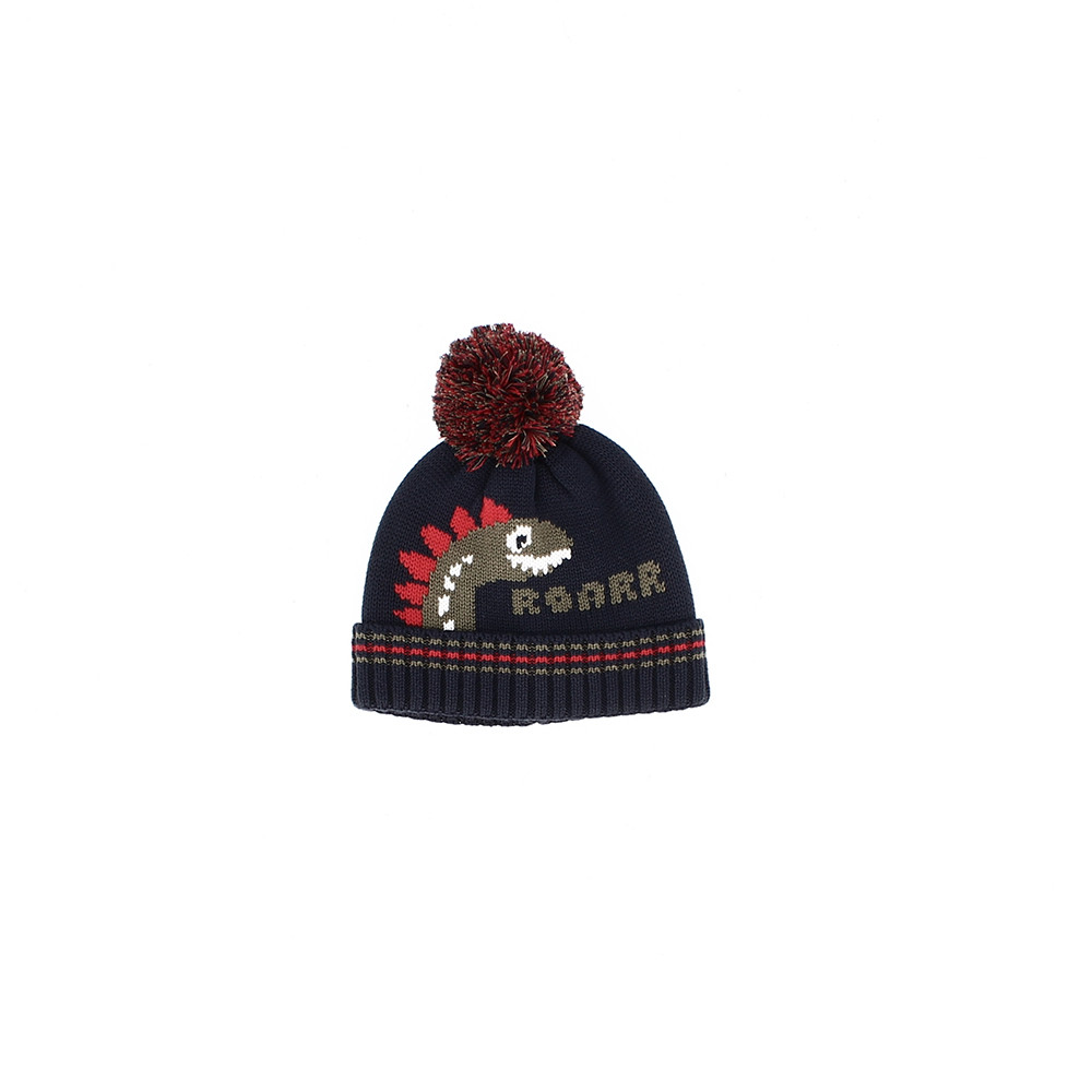 Weiche Strickmütze mit Dinosaurier- Motiv und Bommel. Innenfutter aus Jersey.