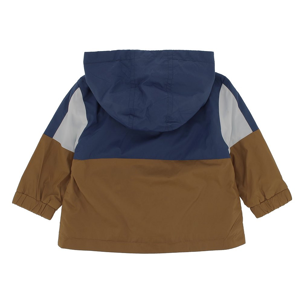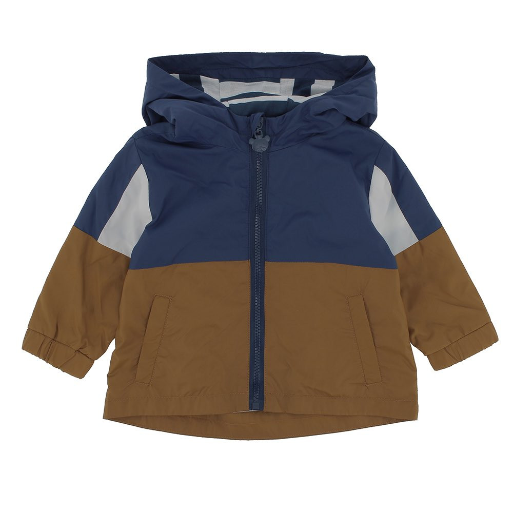 Nylonjacke, mit Kapuze, mit langen Ärmeln. Frontverschluss mit Reißverschluss. Fake-Fronttaschen, G ummizug an der Unterseite des Ärmels, gestreiftes Jersey-Innenfutter.