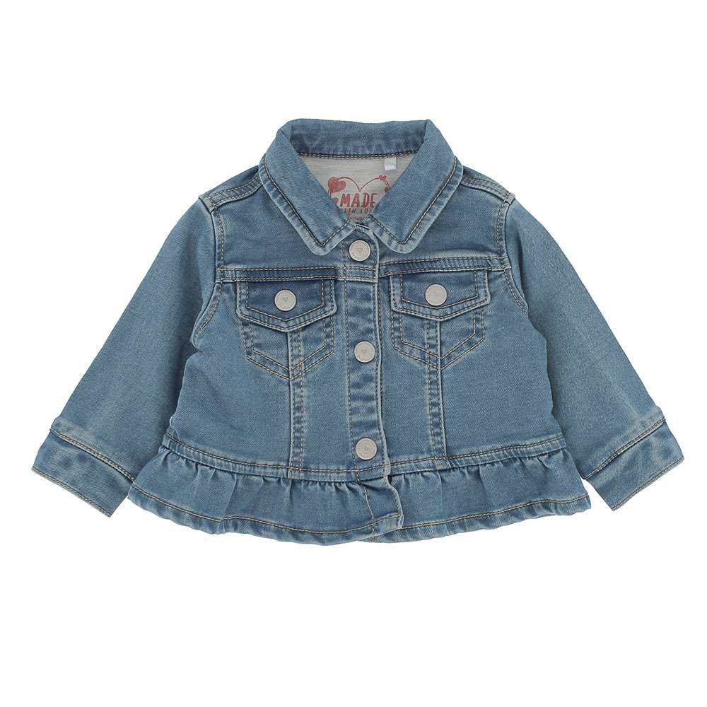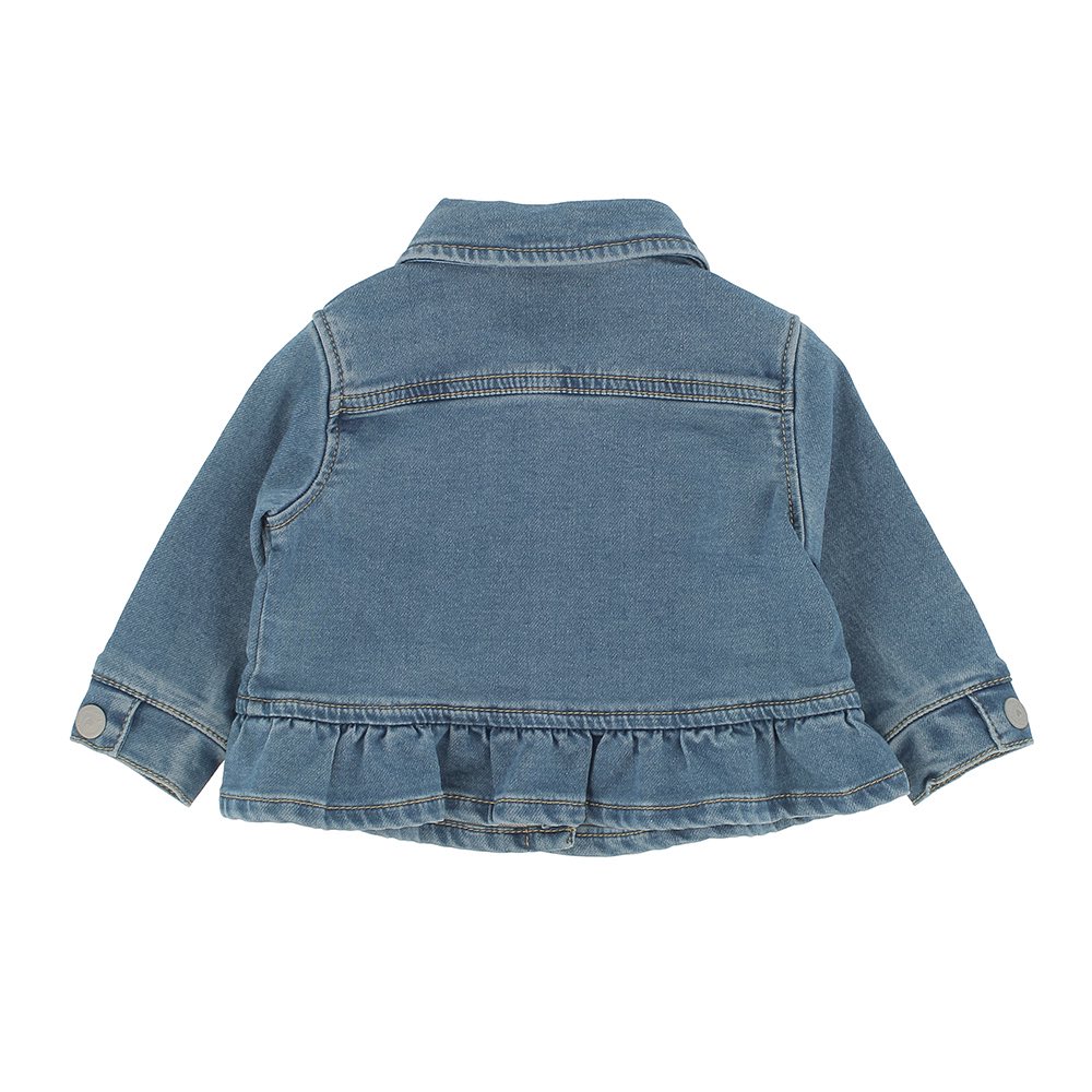 Gestrickte Jeansjacke, mit Kragen, mit langen Ärmeln. Frontverschluss mit Metallknopfknöpfen. Front taschen mit Knöpfen. Boden mit Rüschen.