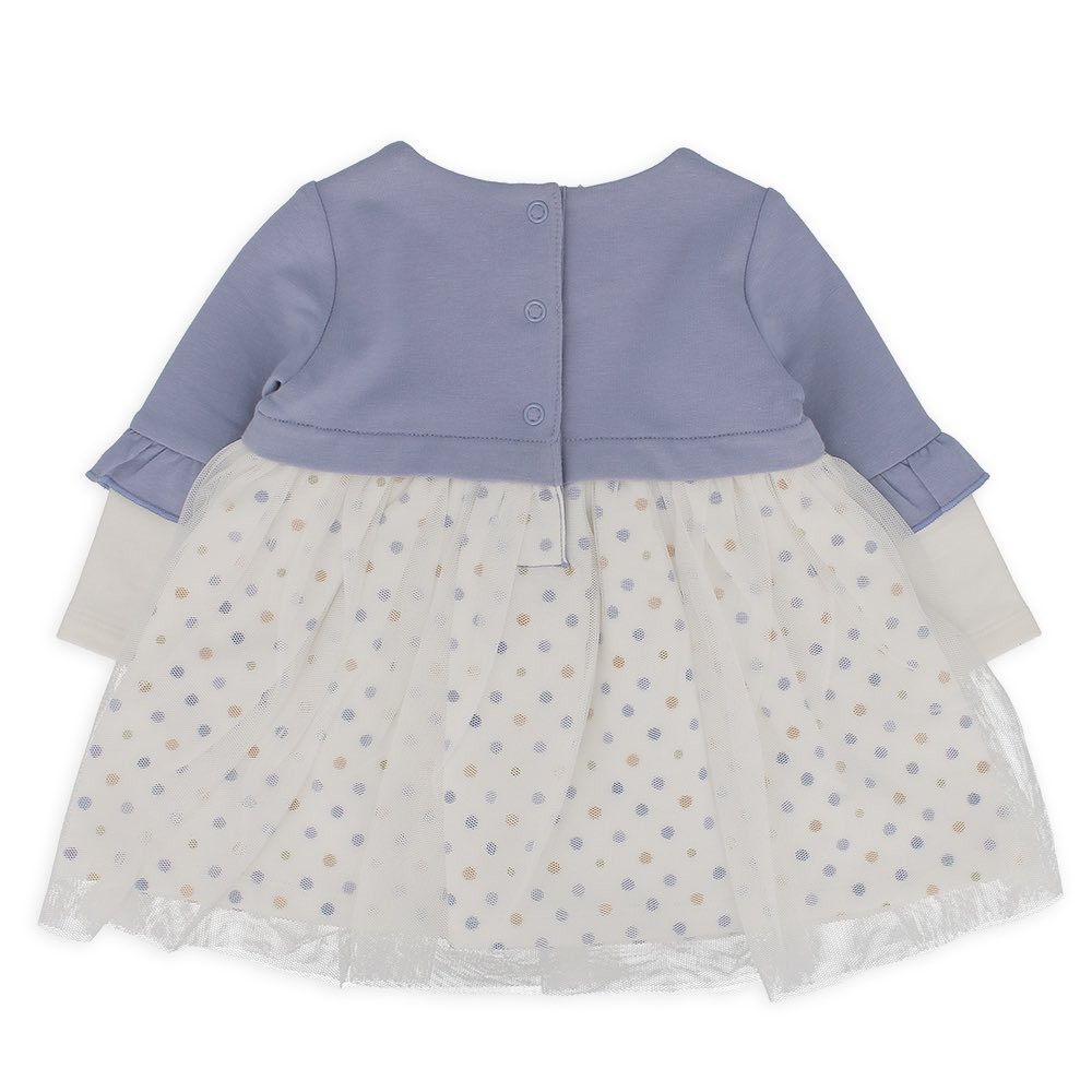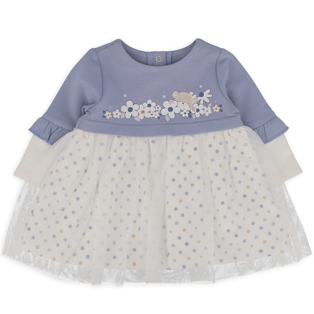Sweatshirtkleid mit Rundhalsausschnitt, lange Ärmel mit Rüschen. Rückenverschluss mit Druckknöpfen. Rock mit oberer Tüllschicht. Frontprint mit Bär.