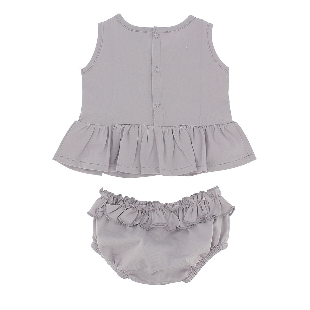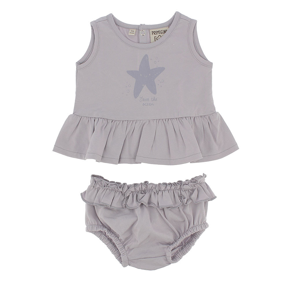 Komplett bestehend aus zwei Teilen. Jersey Tank Top mit Rüschen. Rückenverschluss mit Druckknöpfen. Frontprint mit Seestern. Jersey-Coulottes mit elastischer Taille und Rüschen. Dieses Kleidungsstück ist ökologisch nachhaltig, da es aus reiner Bio-Baumwolle besteht.