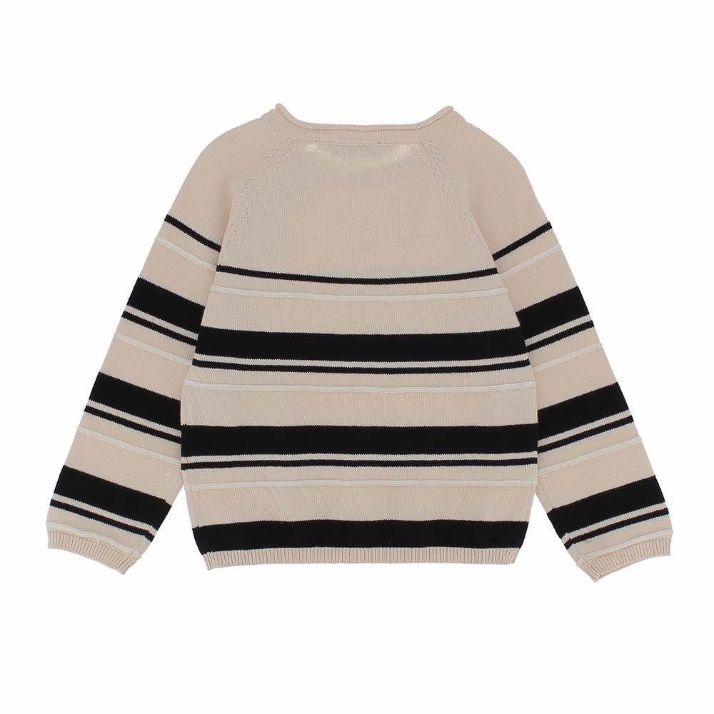 Pullover mit Rundhalsausschnitt und langen Ärmeln. Knopfverschluss an der Schulter. Kontrastierende s Streifenmuster.