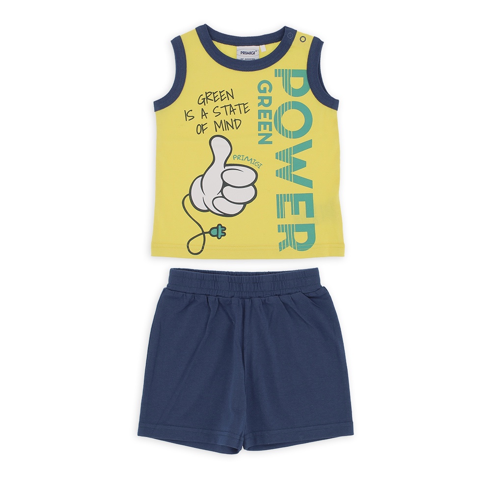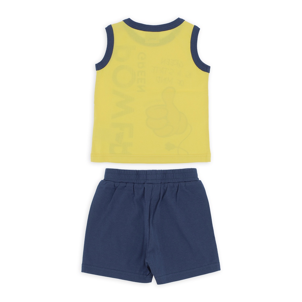 Komplett bestehend aus zwei Teilen. Jersey Tank Top Rundhalsausschnitt. Druckknopfverschluss an der Schulter. Frontdruck. Jersey Bermuda Shorts mit elastischer Taille.