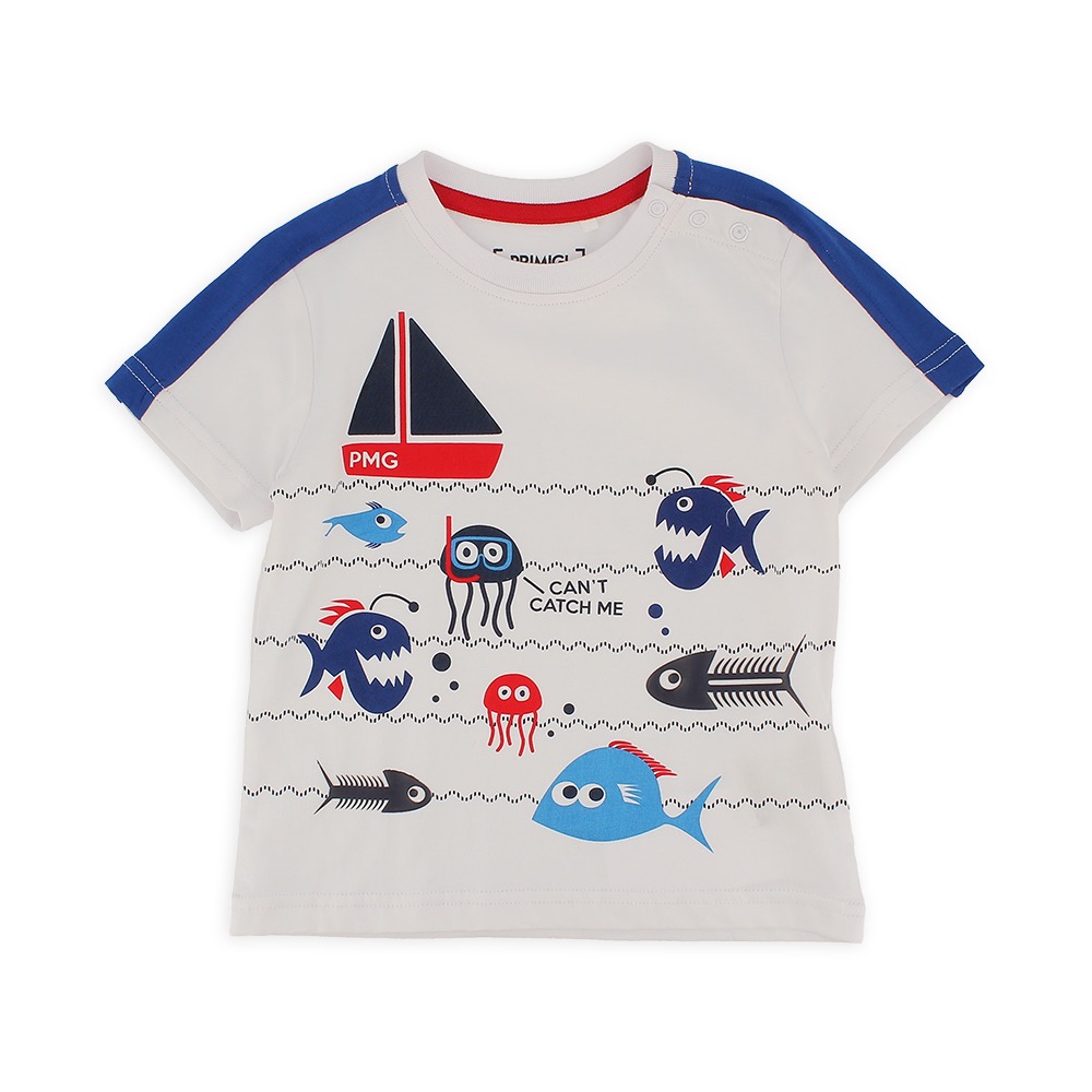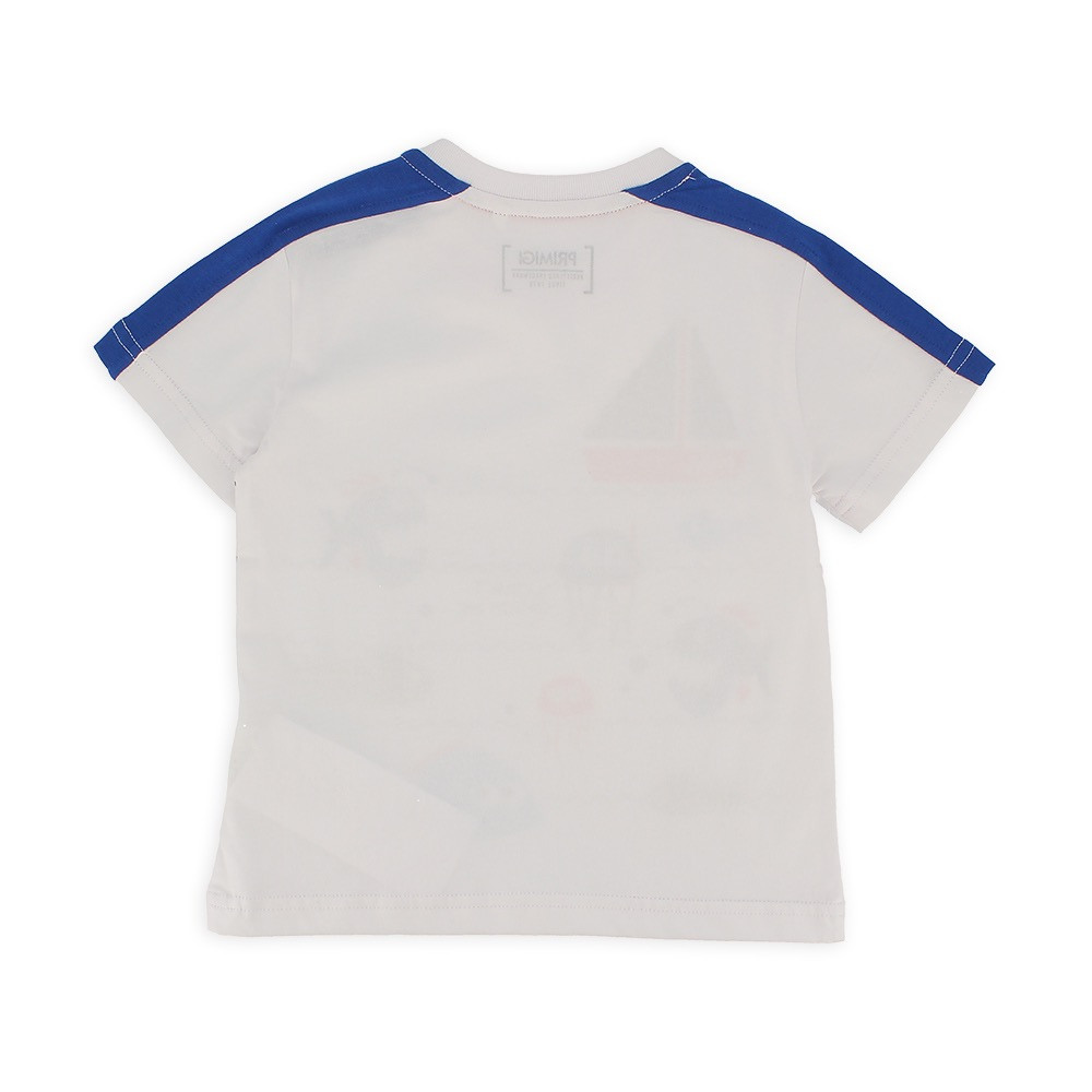 Jersey kurzärmeliges T-Shirt mit Rundhalsausschnitt und kontrastierenden Bändern. Druckknopfverschl uss an der Schulter. Frontdruck.