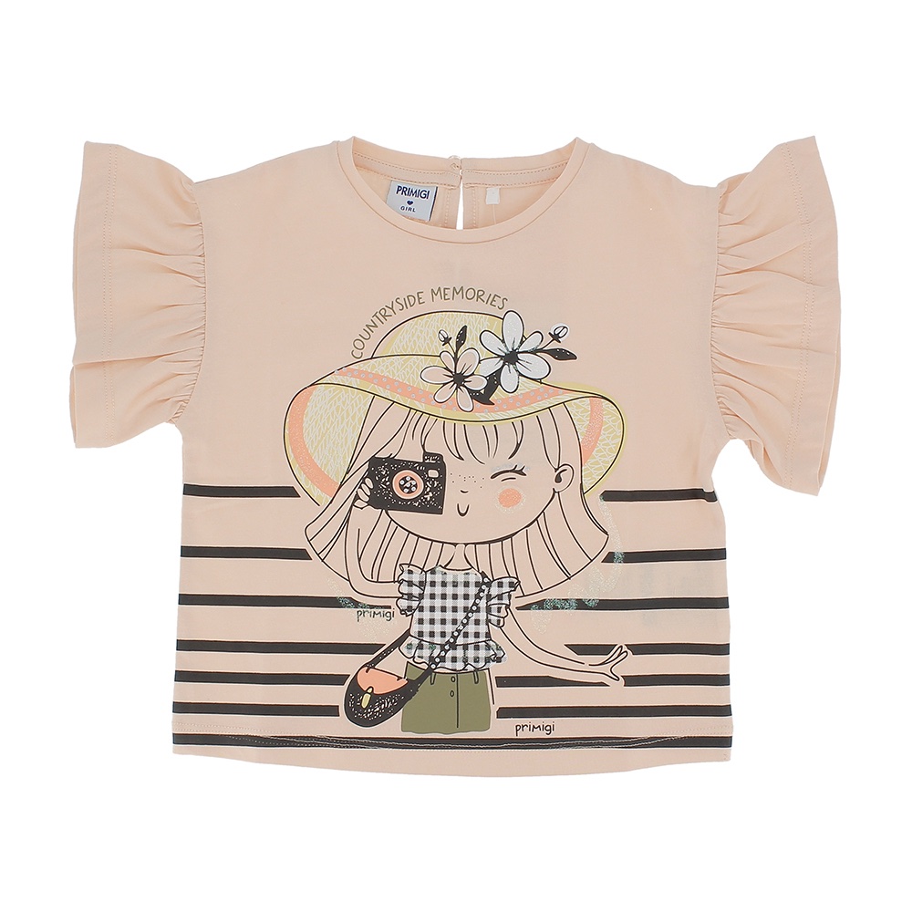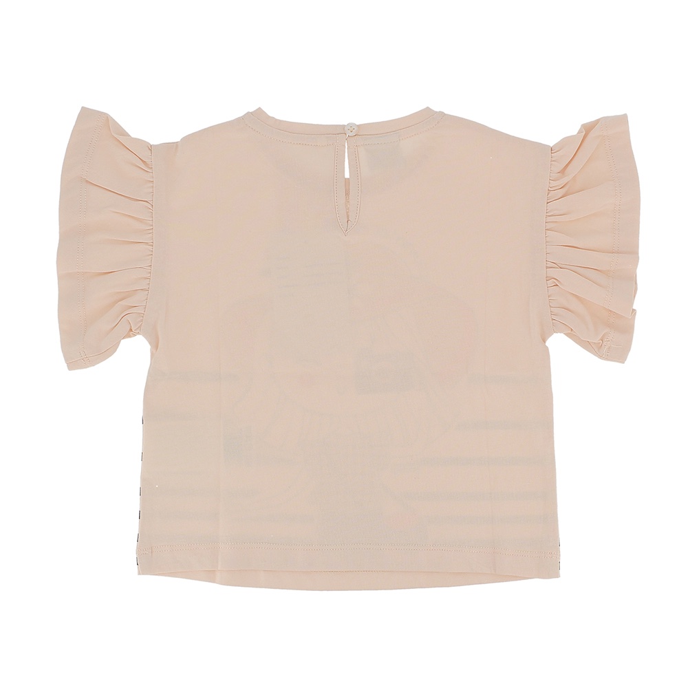 Kurzärmeliges T-Shirt mit Rundhalsausschnitt und Rüschen aus Jersey. Teardrop-Verschluss mit Knopf auf dem Ruecken. Frontdruck.