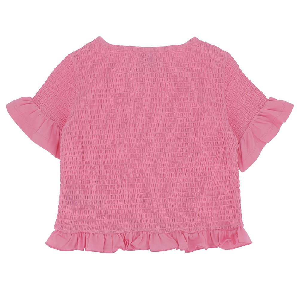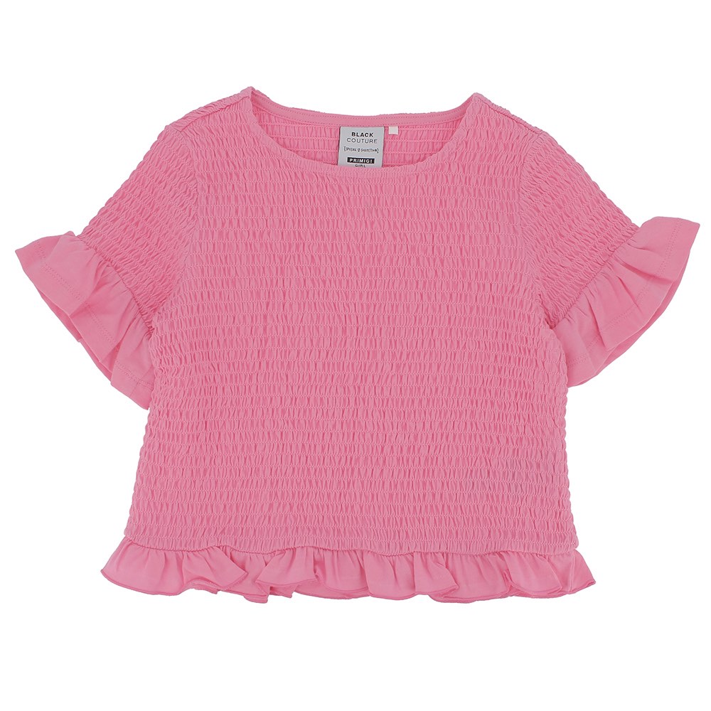 Geprägtes Jersey-T-Shirt mit Rundhalsausschnitt, kurzärmelig. Rüschen an der Unterseite und Unterse ite der Ärmel.