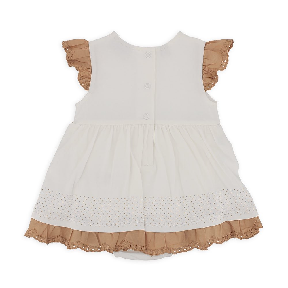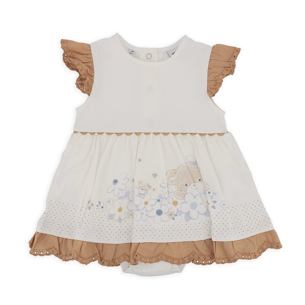 Jersey Body mit kurzärmeligem Kleid mit Rundhalsausschnitt. Verschluss auf der Rückseite und am Sch ritt mit Druckknöpfen. Rüschen an den Ärmeln und am gewellten Saum. Druck mit Teddybär und Blumen auf dem Rock.