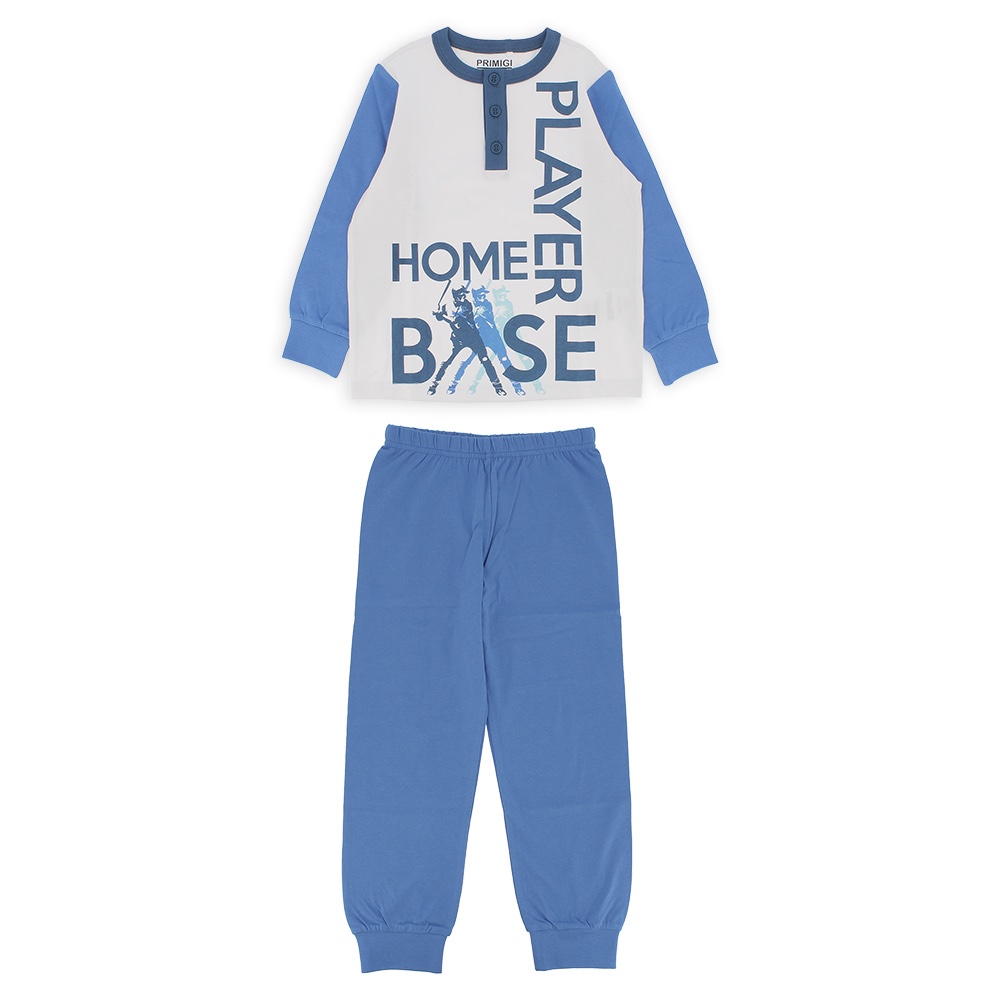 Completo pigiama in jersey. Maglia girocollo a maniche lunghe, chiusura con bottoni sullo scollo. Pantalone con vita elasticizzata.