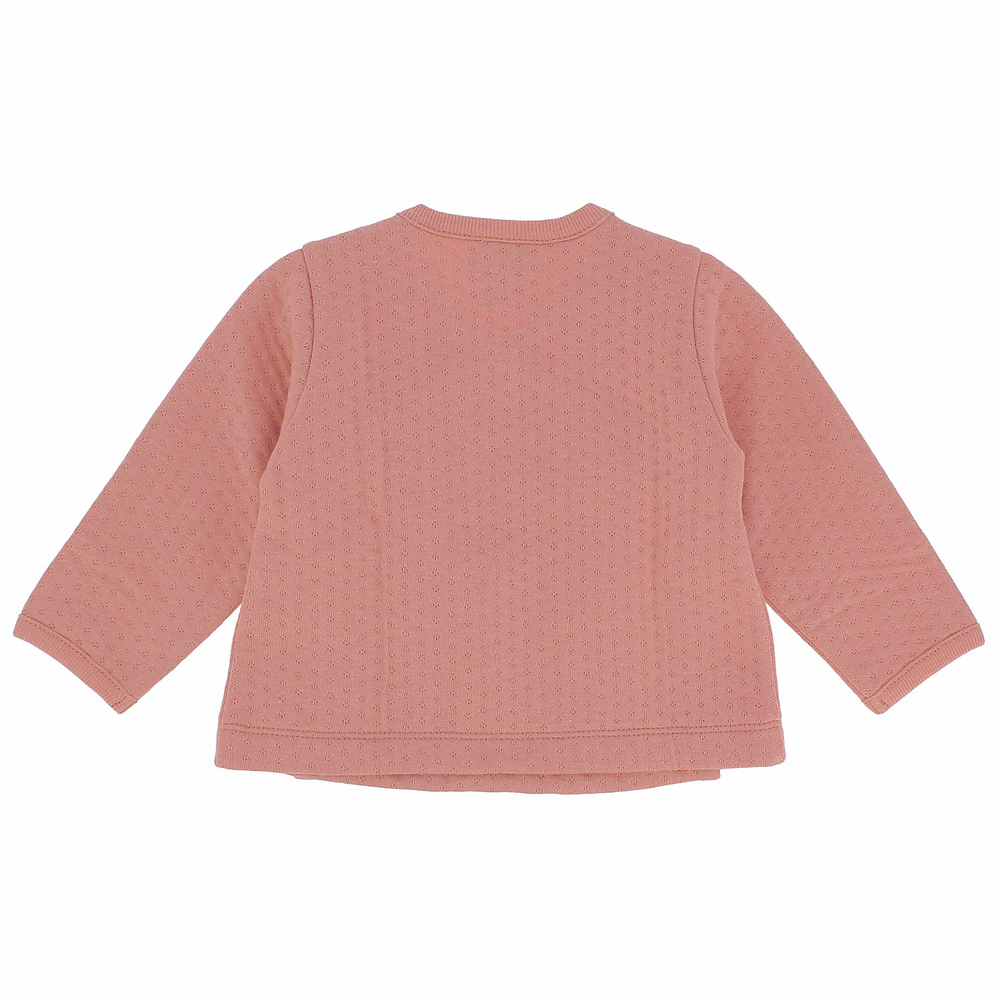 Bolero Jäckchen mit langen Ärmeln. Druckknopfverschluss. Matelassé-Textil und applizierte Schleife. Dieses Kleidungsstück ist umweltfreundlich, da es überwiegend aus nachhaltigen Fasern hergestellt wird.