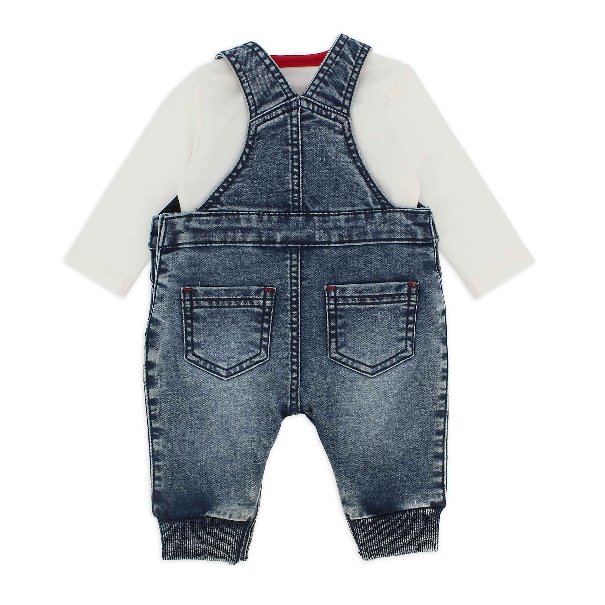 Zweiteiler. Body aus warmer Baumwolle, mit Rundhalsausschnitt und langen Ärmeln. Latzhose aus .Jeansstoff. Druckknöpfe an den Schultern und im Schritt. Hinten Taschen. Gesticktes Hündchen auf der Vorderseite und Druck mit Aufschrift an der Seite.
