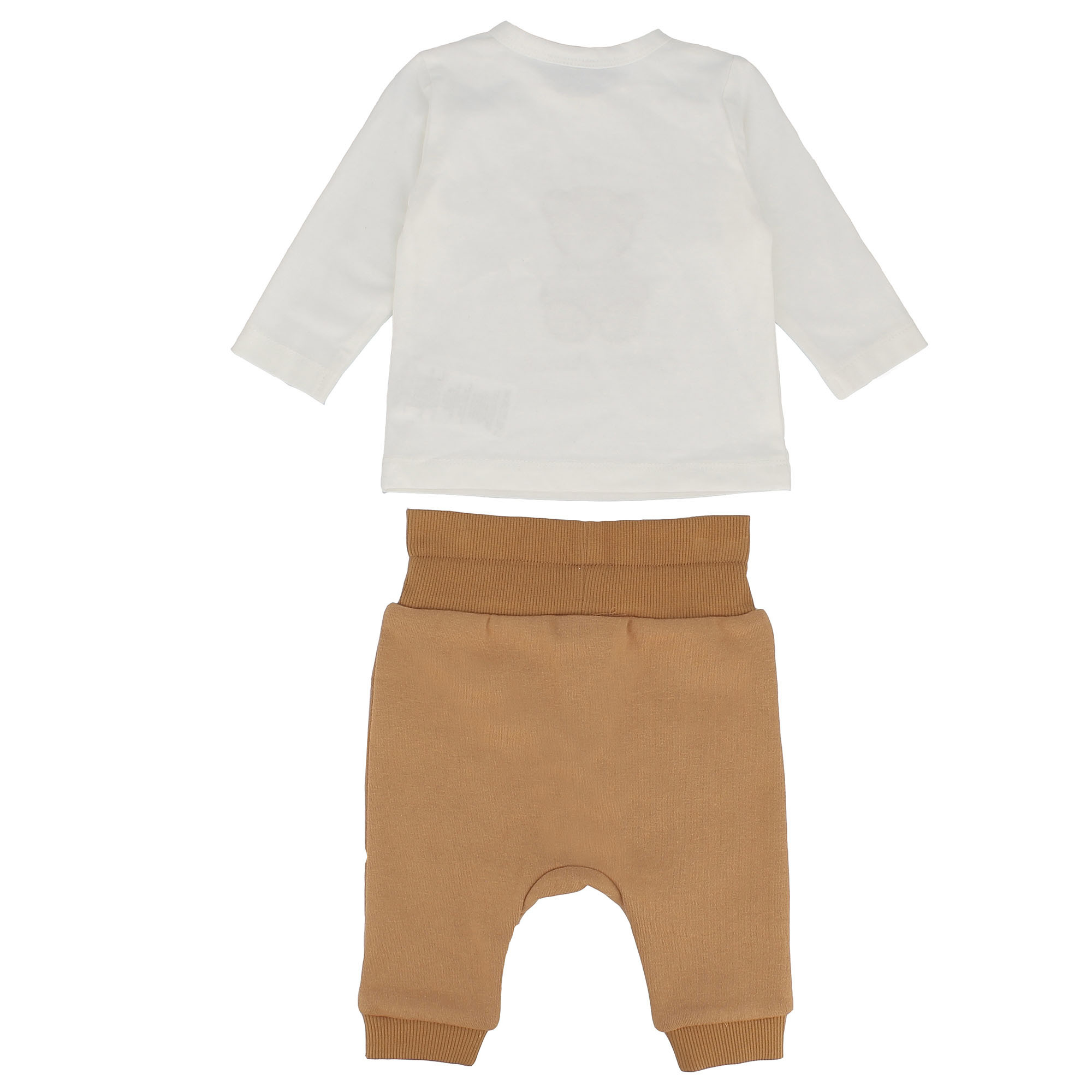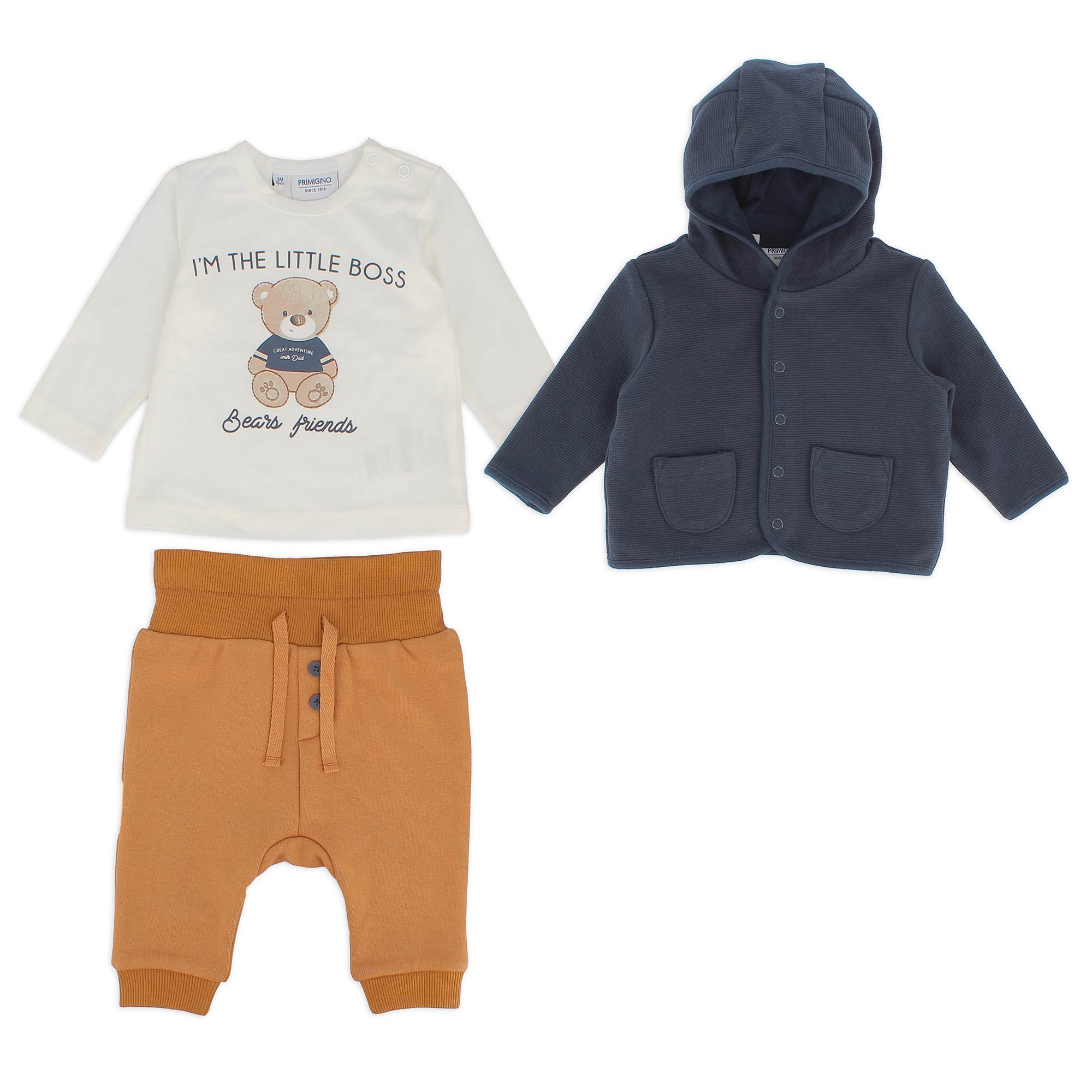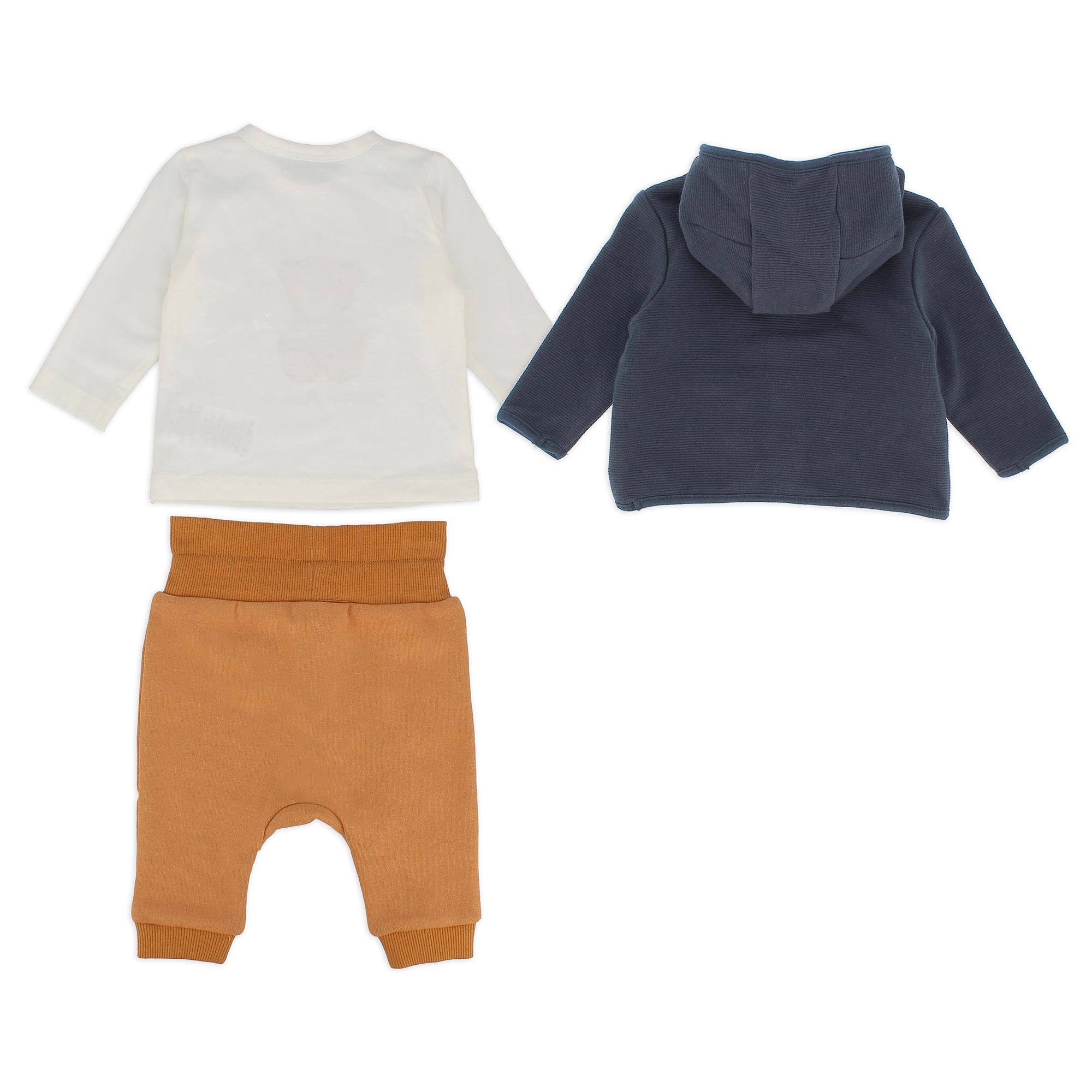 Dreiteiler. Offenes Sweatshirt mit Kapuze und langen Ärmeln. Druckknopfverschluss auf der Vorderseite und aufgesetzte Taschen. Langärmeliges Jersey-Shirt mit Rundhalsausschnitt. Druckknopfverschluss an der Schulter. Teddybär-Aufdruck auf der Vorderseite. Plüschhosen mit Gummizug in der Taille und Bindebändern auf der Vorderseite. Knöpfe auf der Vorderseite und gerippter Saum.