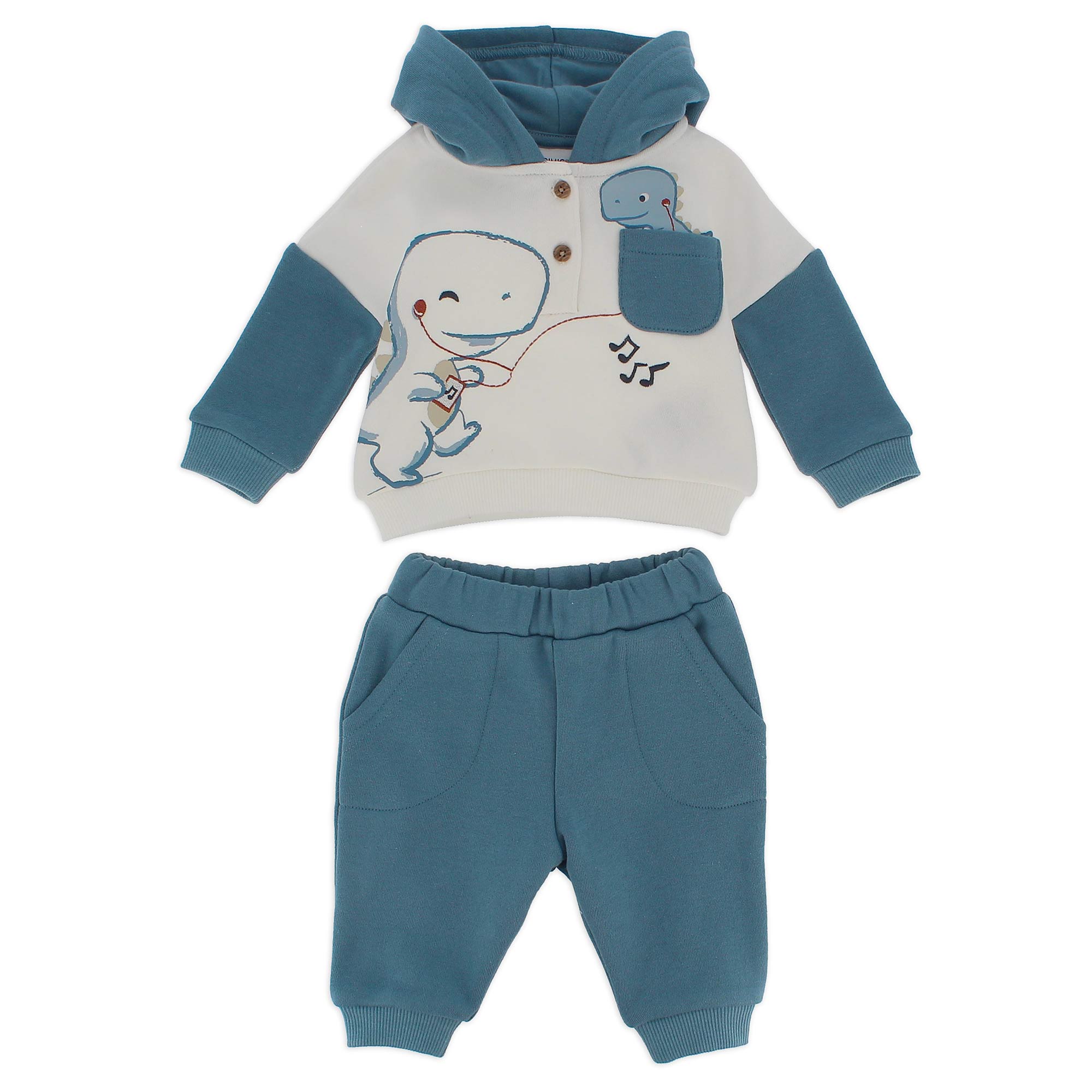 Zweiteiler. Sweatshirt mit Kapuze und langen Ärmeln. Knopfverschluss auf der Vorderseite. Aufgedruckte Dinosaurier und Stickerei auf der Vorderseite. Plüschhose mit Gummizug in der Taille und Seitentaschen.