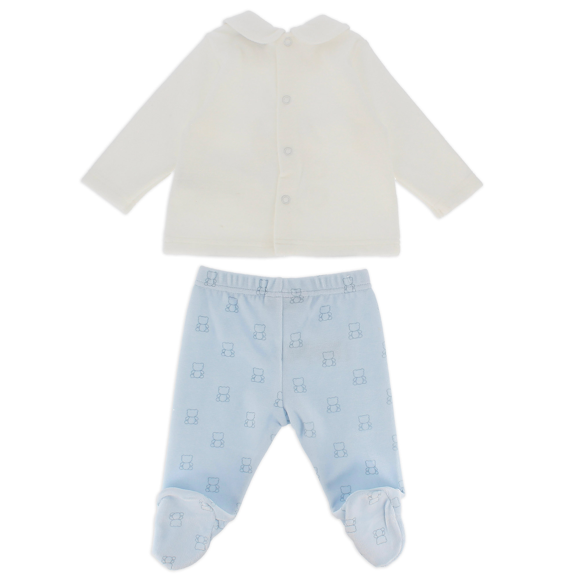Zweiteiliges Outfit. Chenille-Shirt mit Kragen und langen Ärmeln. Rückenverschluss mit Druckknöpfen. Teddybär-Aufdruck auf der Vorderseite. Strampelhosen aus Chenille mit Gummizug in der Taille.