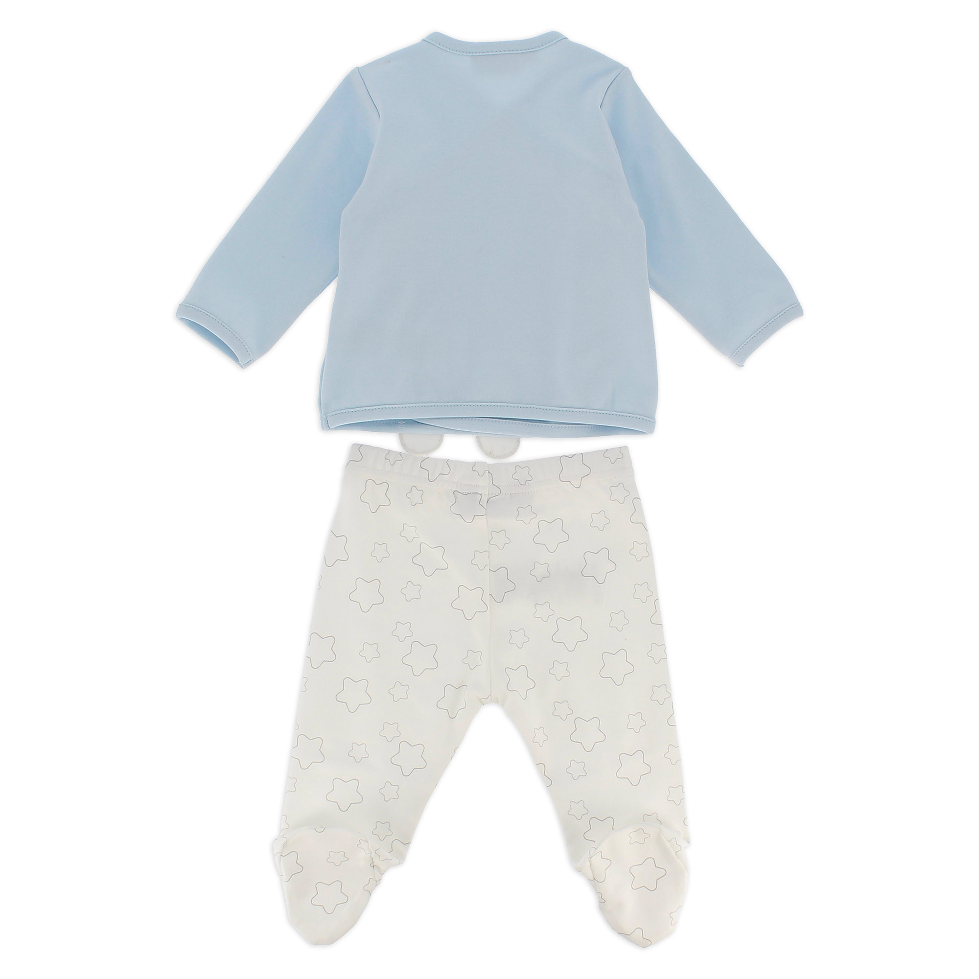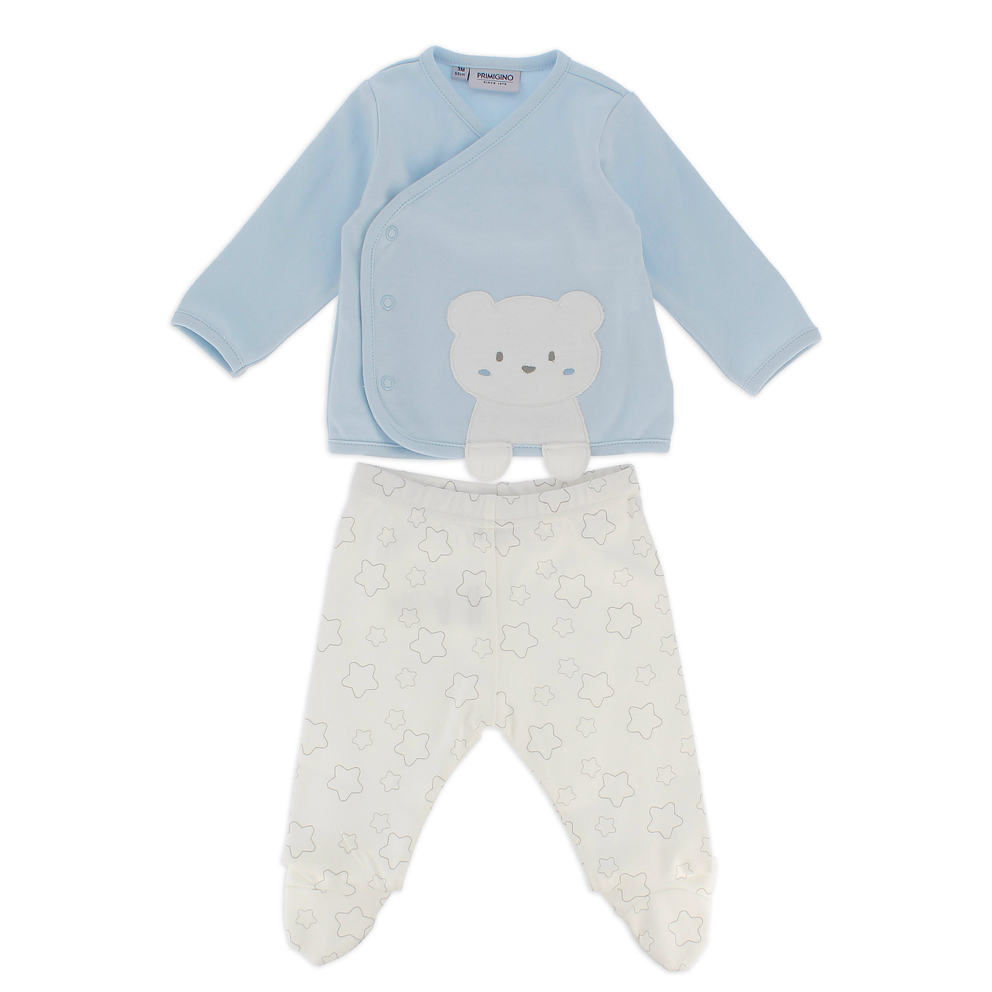 Zweiteiler. Interlock-Shirt mit V-Ausschnitt und langen Ärmeln. Kimono-Verschluss mit Druckknöpfen an der Seite. Gestickter Teddybär auf der Vorderseite. Interlock-Strampelhosen mit Gummizug in der Taille. Allover-Print mit Sternen.