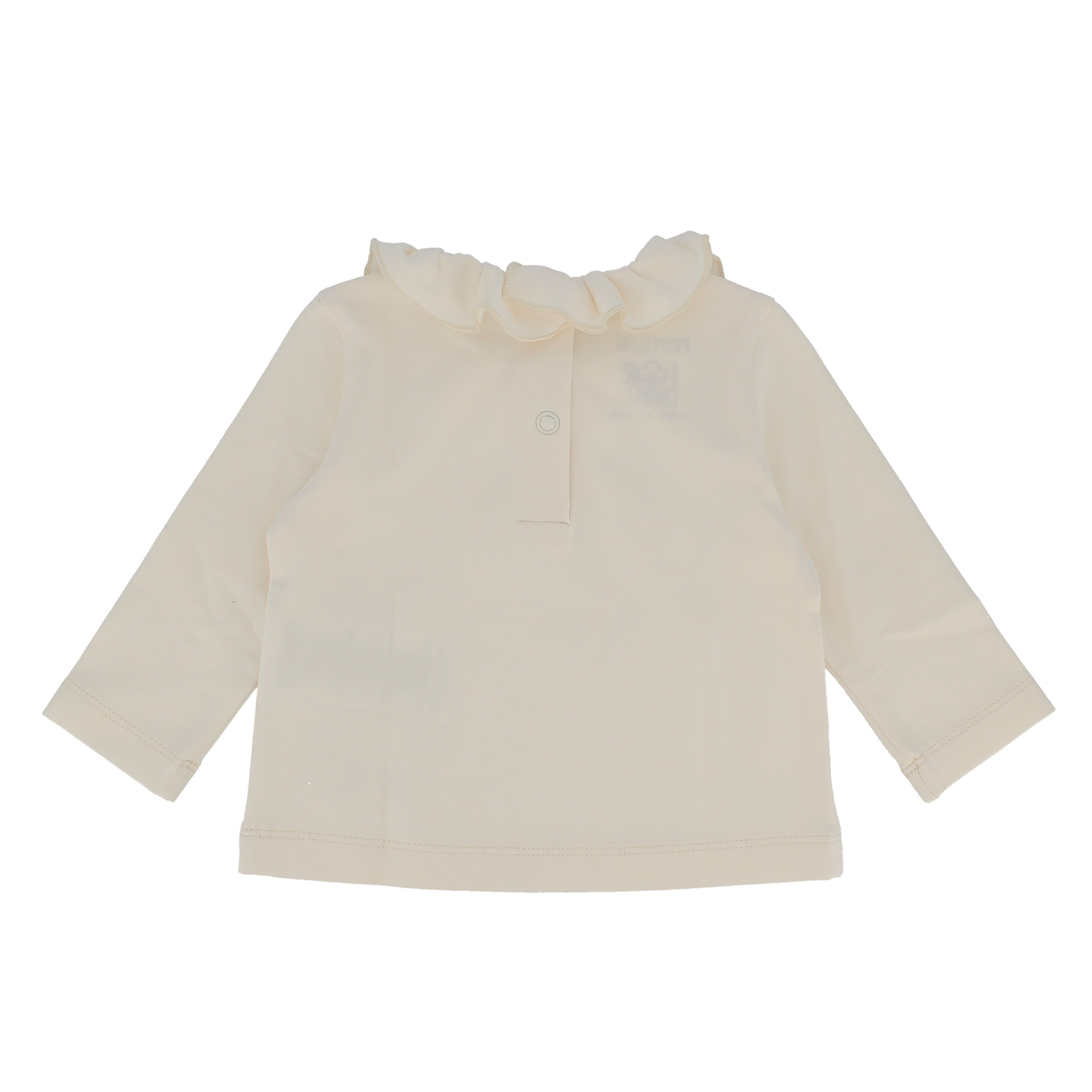 Jersey-T-Shirt mit Rundhalsausschnitt und langen Ärmeln. Druckknopfverschluss auf der Rückseite. Angesetzte Rüschen am Halsausschnitt und an den Manschetten. Kleine Drucke an der Seite. Dieses Kleidungsstück ist umweltfreundlich, da es überwiegend aus Bio-Baumwolle hergestellt wird.