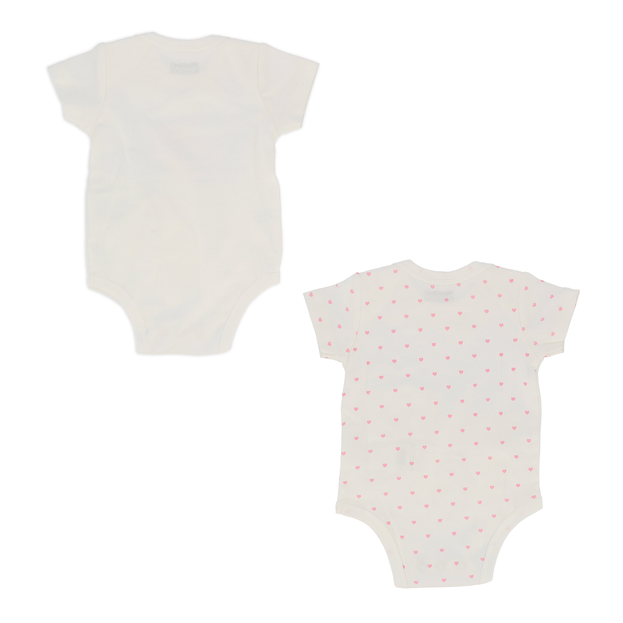Doppelpack mit zwei Jersey-Bodys mit Rundhalsausschnitt und kurzen Ärmeln. Knopfverschluss an der Unterseite. Ein Body mit All-Over-Druck und ein Body mit Druck auf der Vorderseite.
