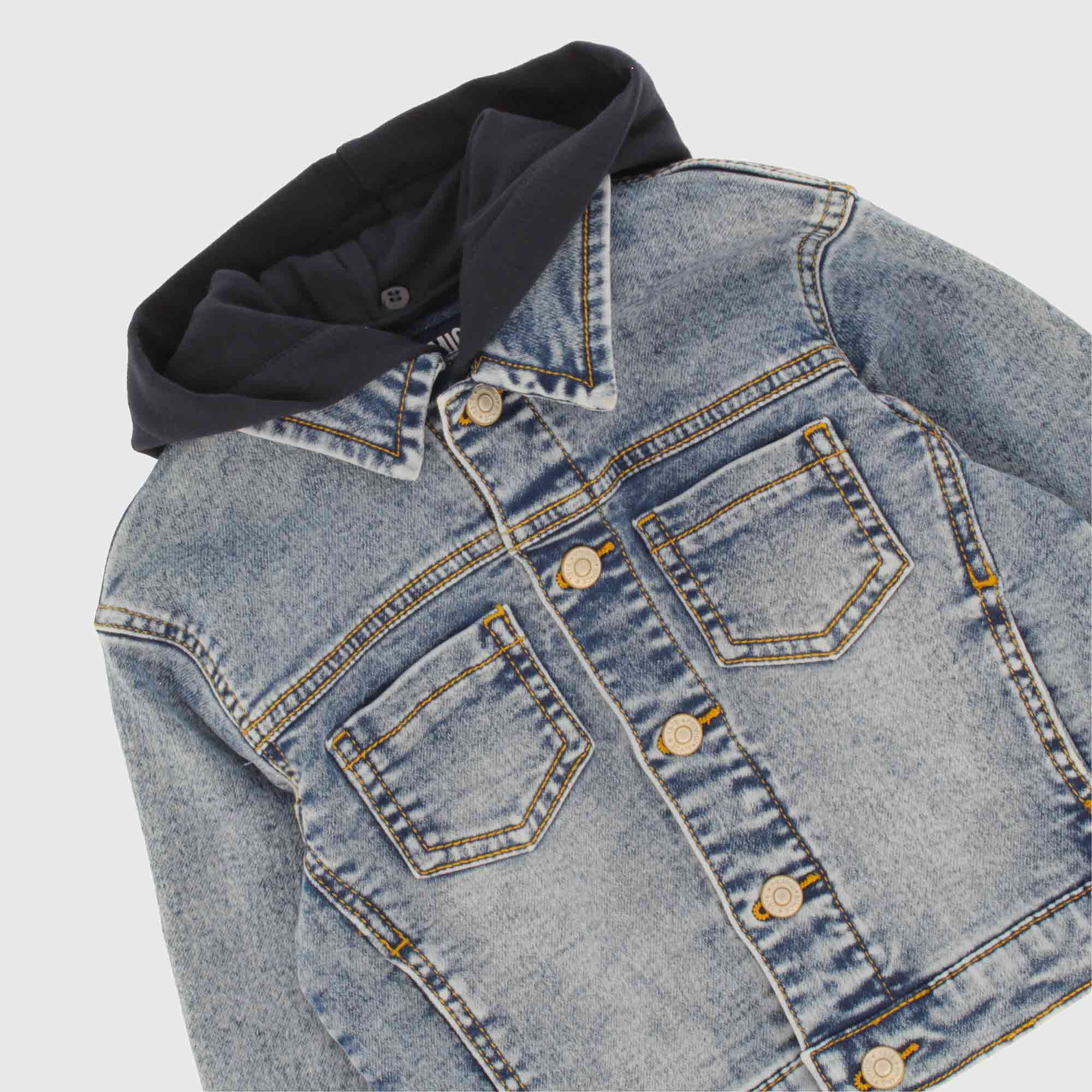 Strickeffekt Jeansjacke mit abnehmbarer Fleece-Kapuze und langen Ärmeln. Frontverschluss mit Knöpfen. Fronttaschen.