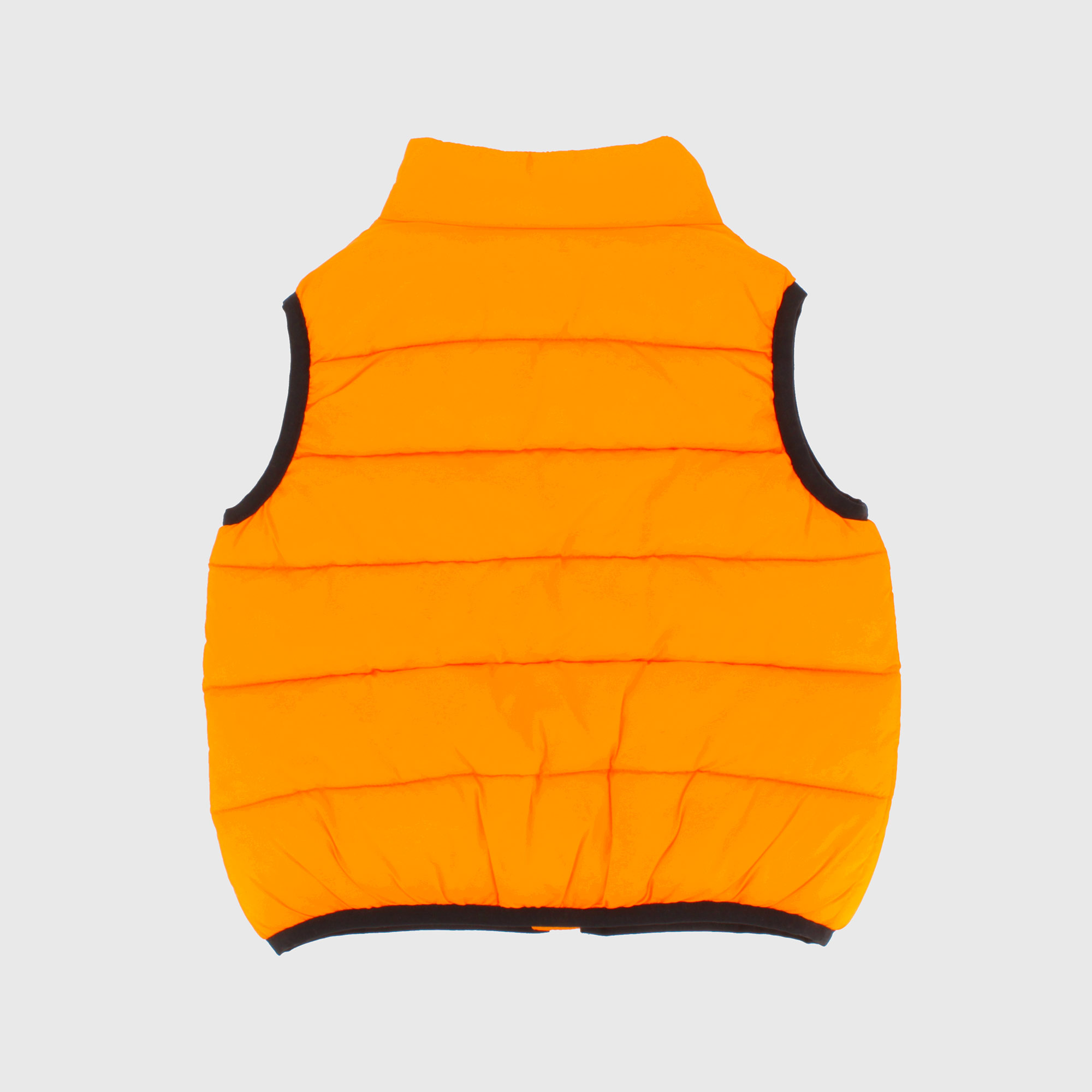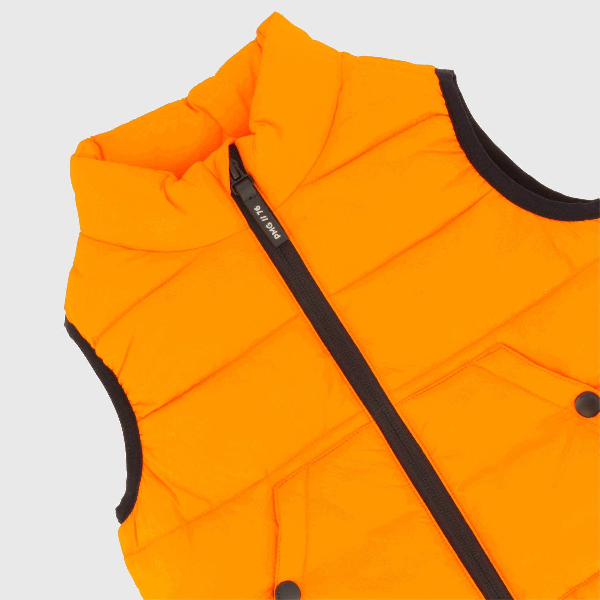 Nylonweste mit hohem Kragen. Kontrastierender Reißverschluss an der Vorderseite. Hüfttaschen mit Druckknopf. Kontrastierende Profile.