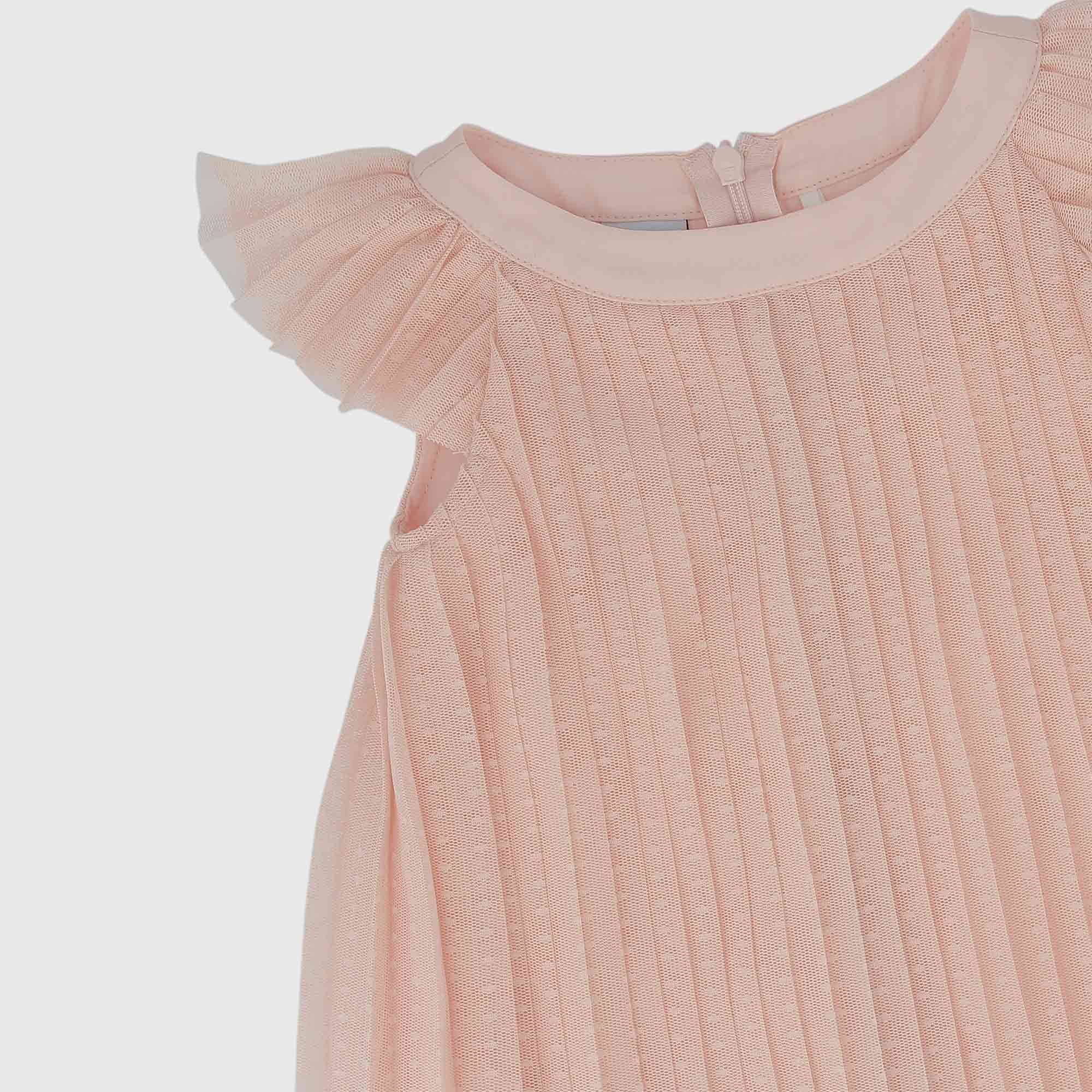 Tüllkleid mit plissierten Micro-Polka Dots, Rundhalsausschnitt und Klappenärmeln. Rückenverschluss mit Reißverschluss und Innenfutter.
