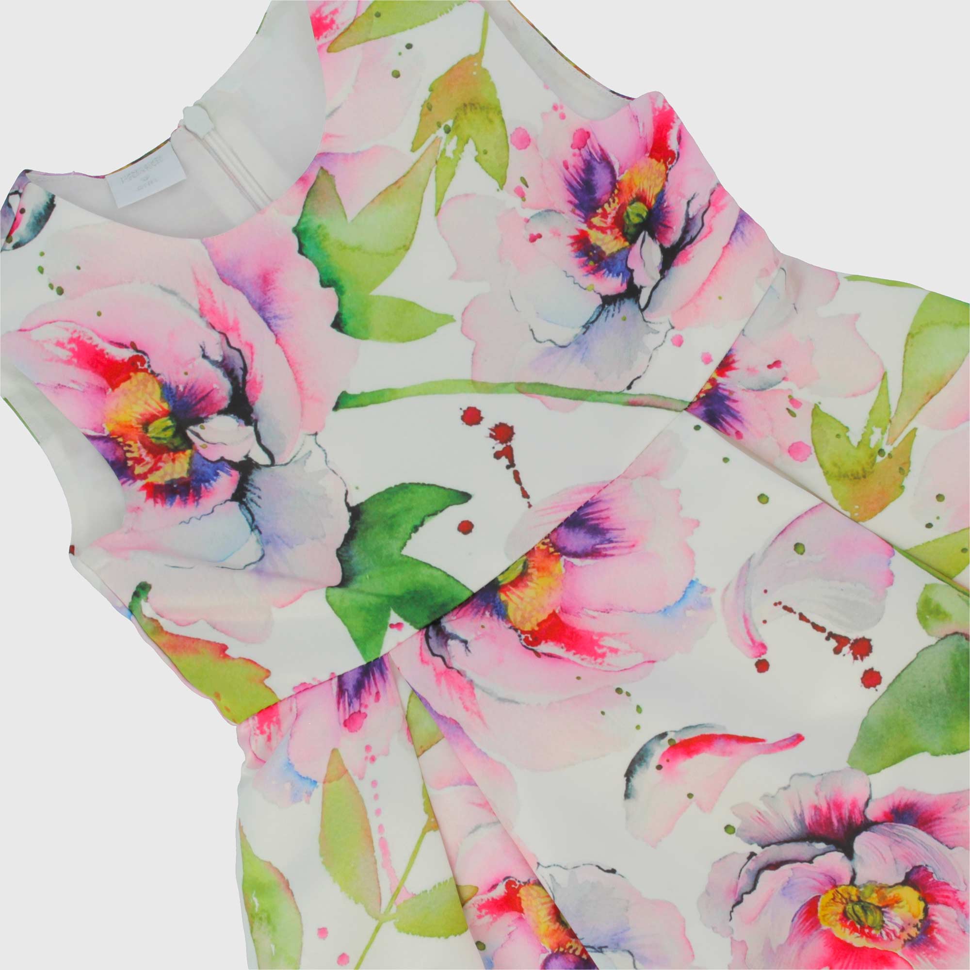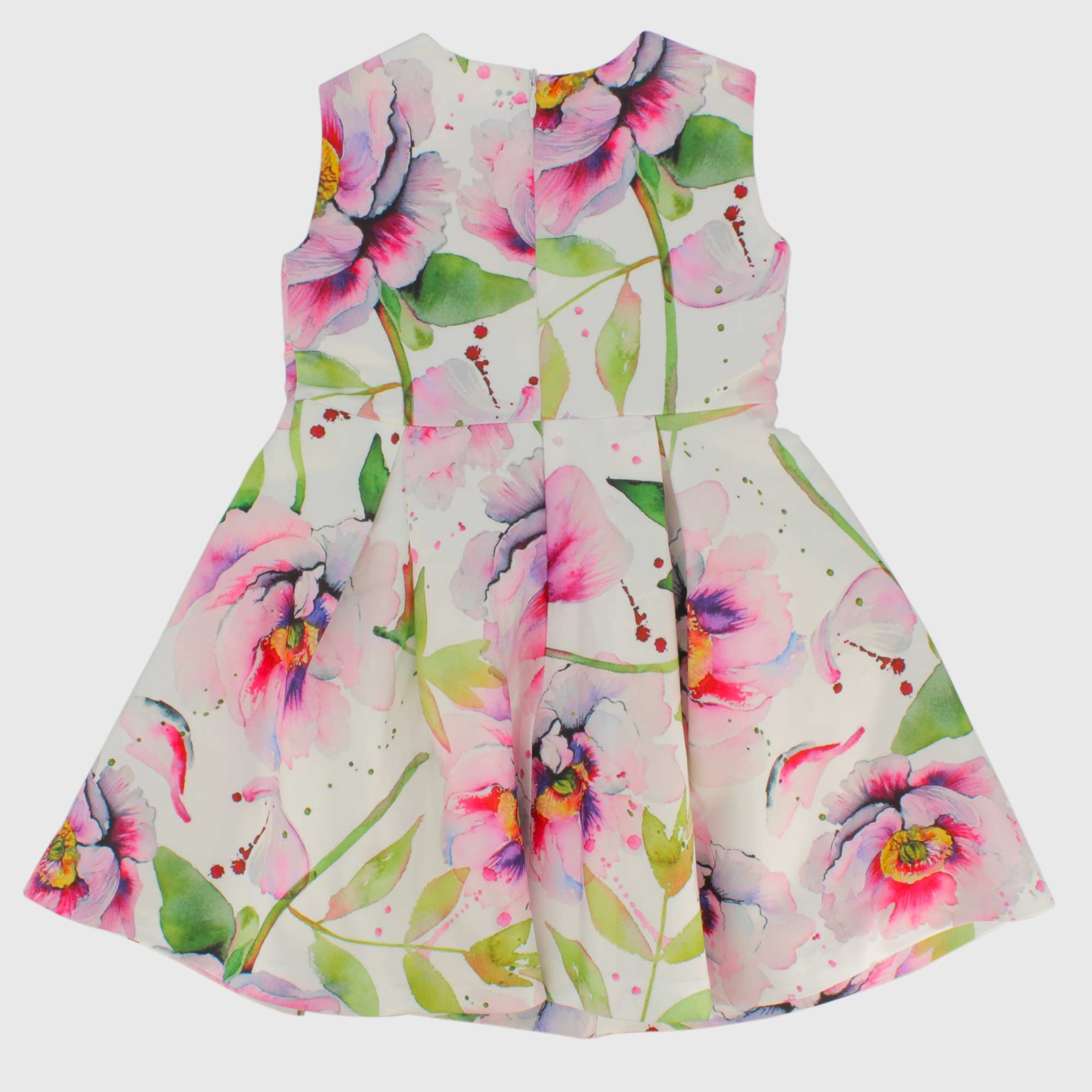 Kleid aus bedrucktem Stoff mit Blumenmuster, Armlöchern. Rückenverschluss mit unsichtbarem Reißverschluss. An der Taille geschnitten, vorne und hinten gefaltet. Futter und Underrock aus Tüll.