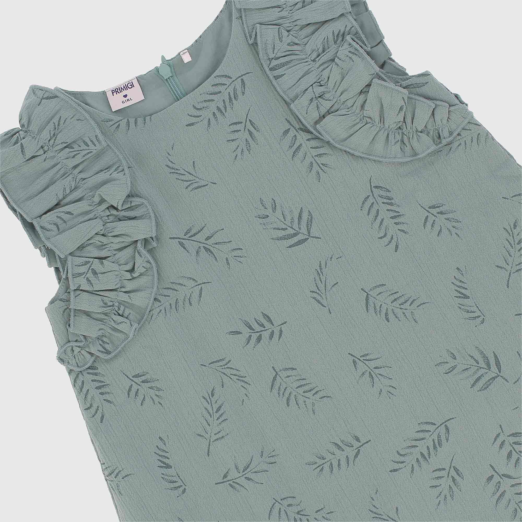 Bedrucktes Baumwollkleid, Rundhalsausschnitt, ärmellos. Reißverschluss hinten. Volants an Armlöchern.