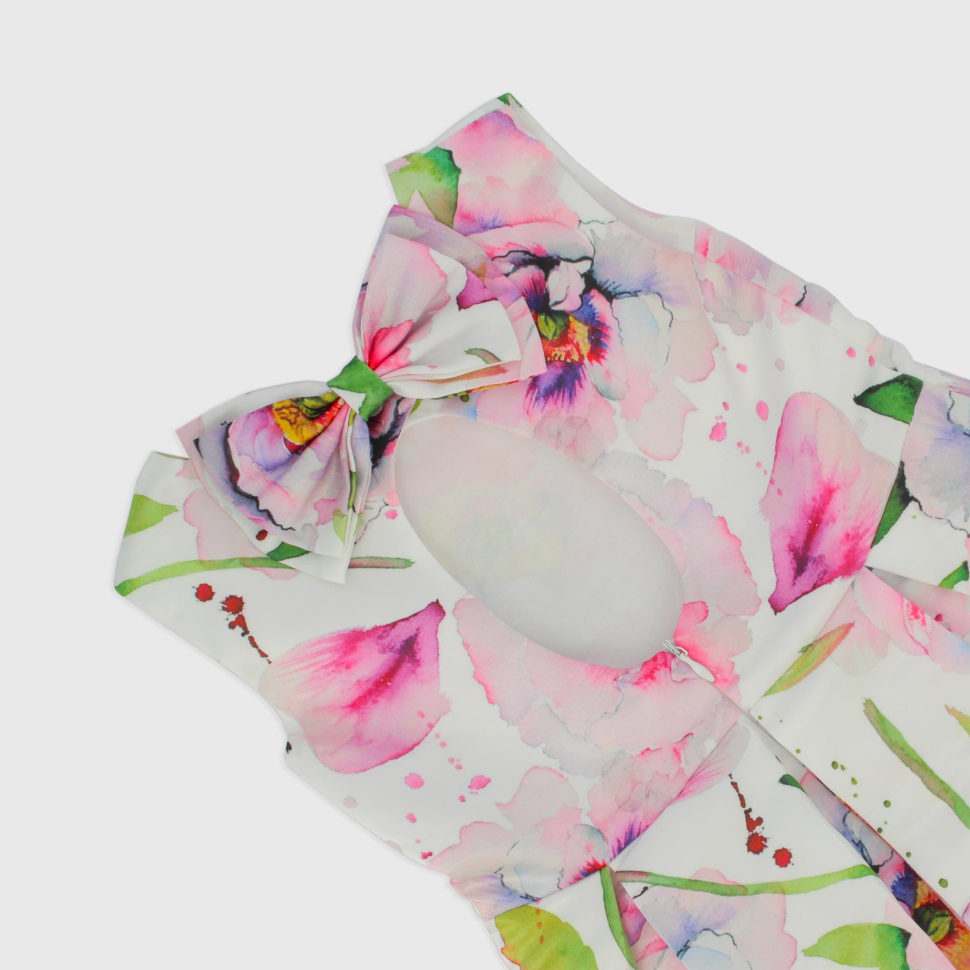 Kleid aus bedrucktem Stoff mit Blumenmuster, Armlöchern. Rückenverschluss mit unsichtbarem Reißverschluss. An der Taille geschnitten, vorne und hinten gefaltet. Tropfenöffnung auf dem Rücken und abnehmbarer Bogen. Futter und Underrock aus Tüll.