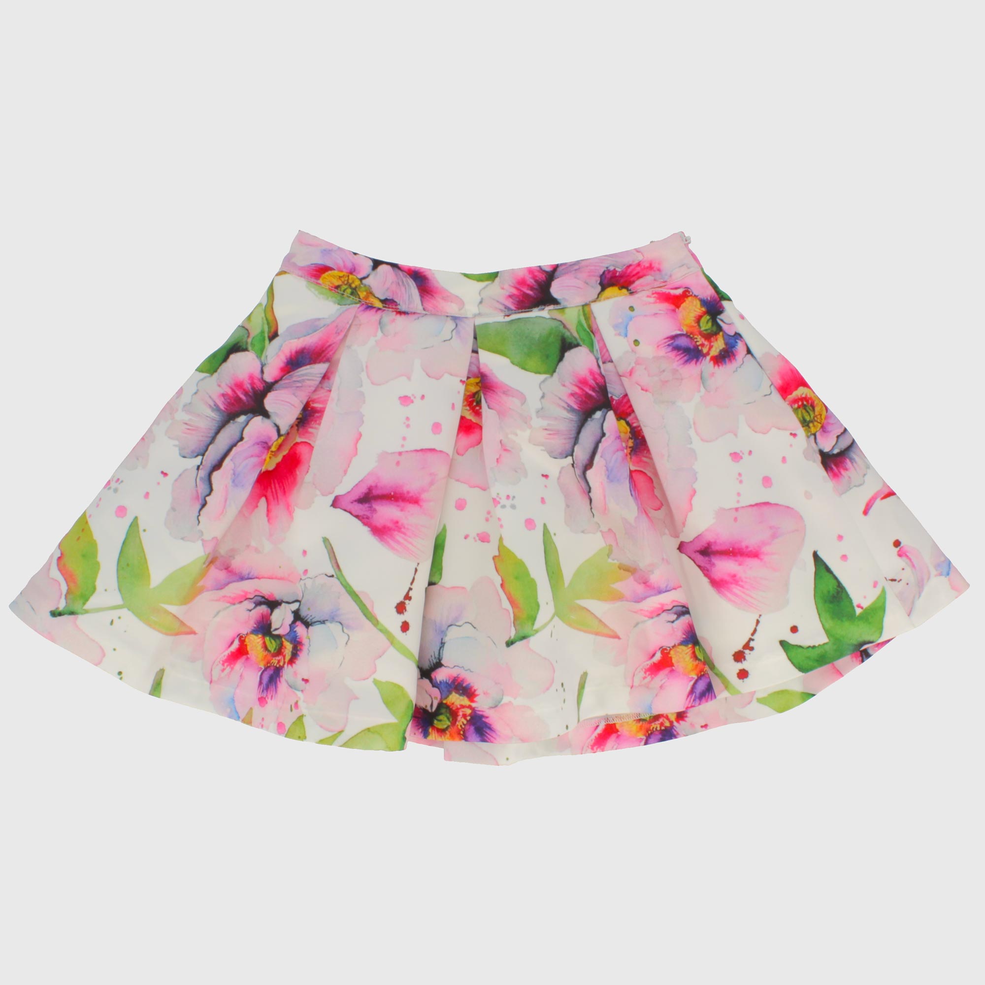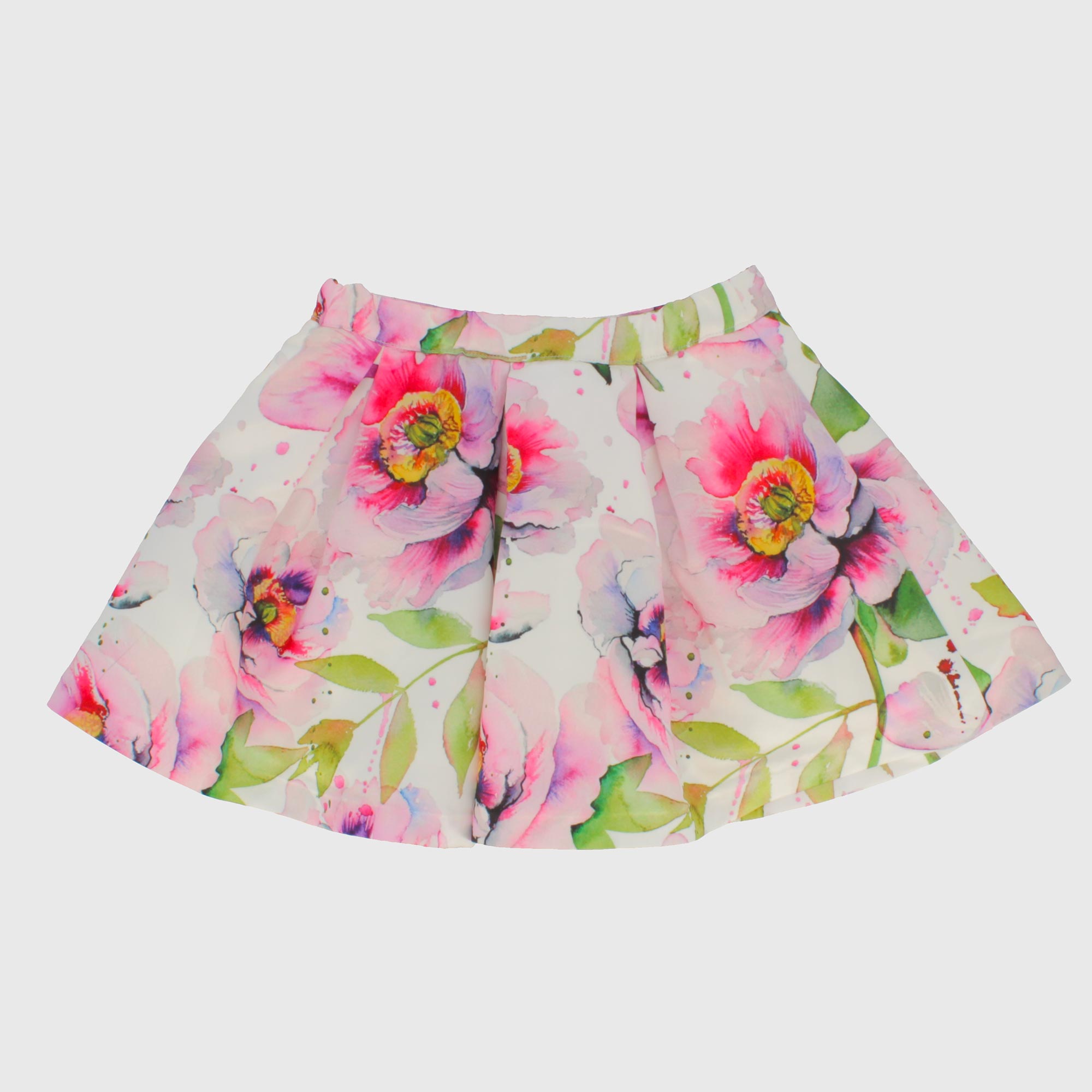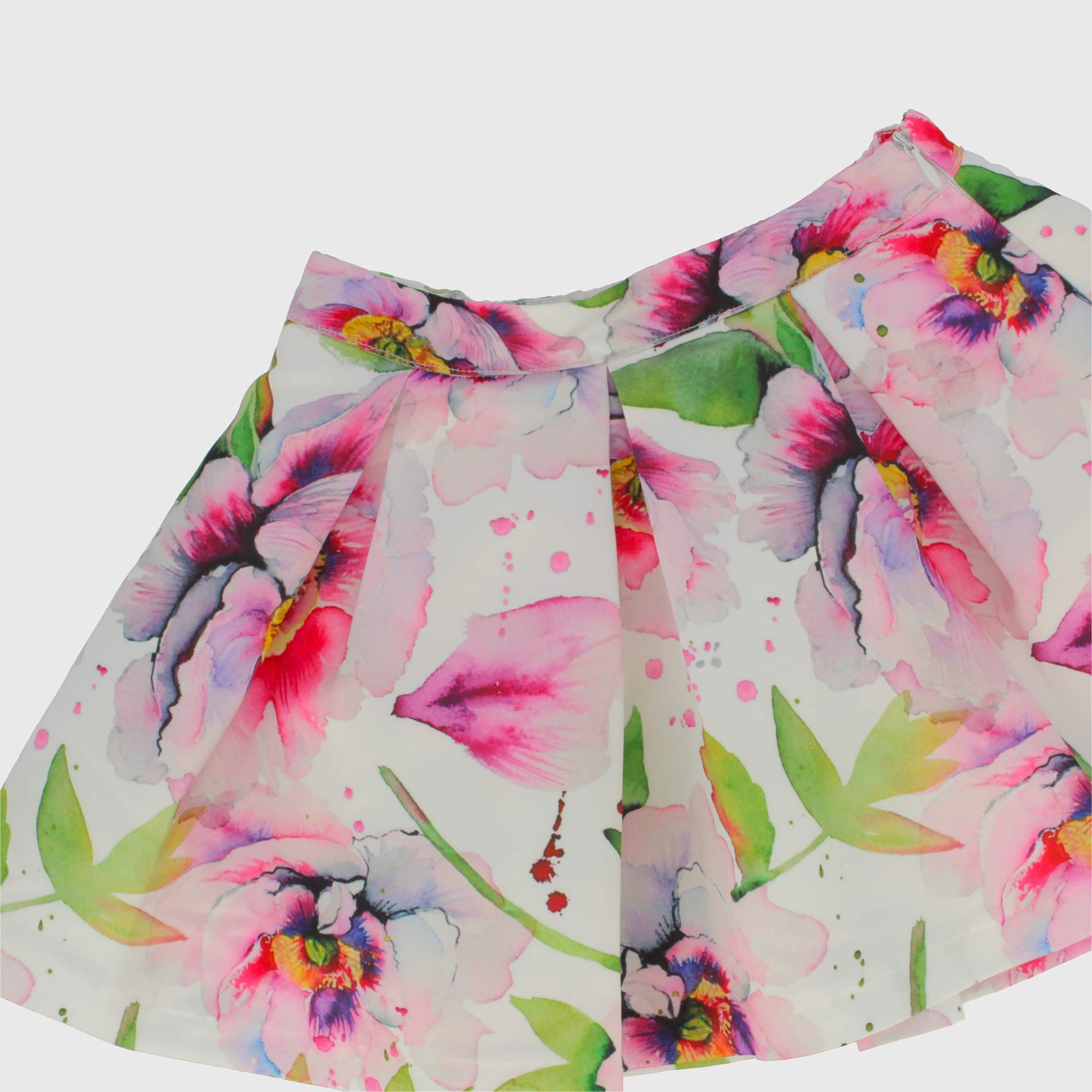Rock aus floral gemustertem bedrucktem Stoff. Breite Falten. Elastischer Regler im Inneren. Verschluss an der Seite mit unsichtbarem Reißverschluss. Futter und Underrock in Tüll.