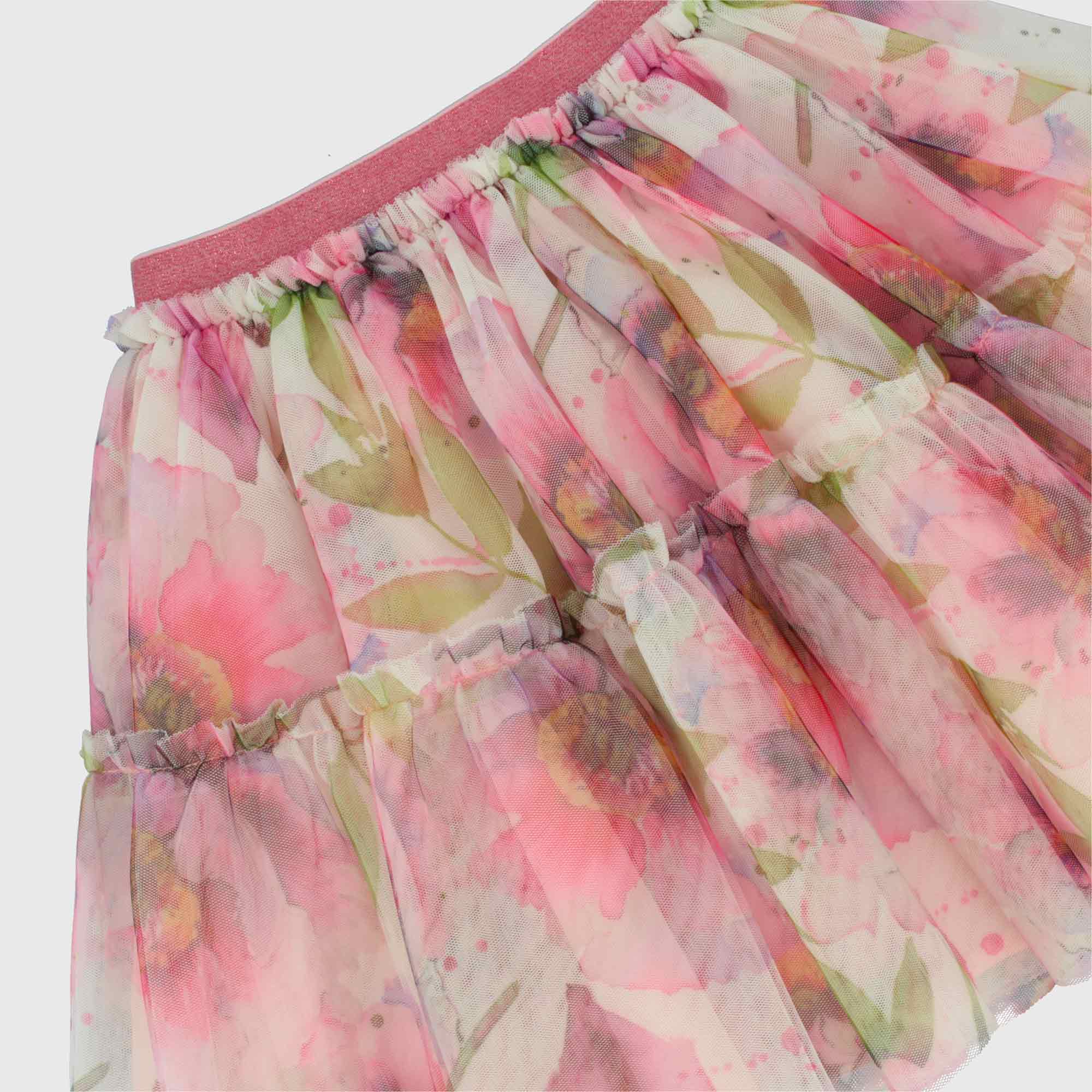 Blumengemusterter Tüllrock mit Volants. Lurex elastischer Bund und Innenfutter.