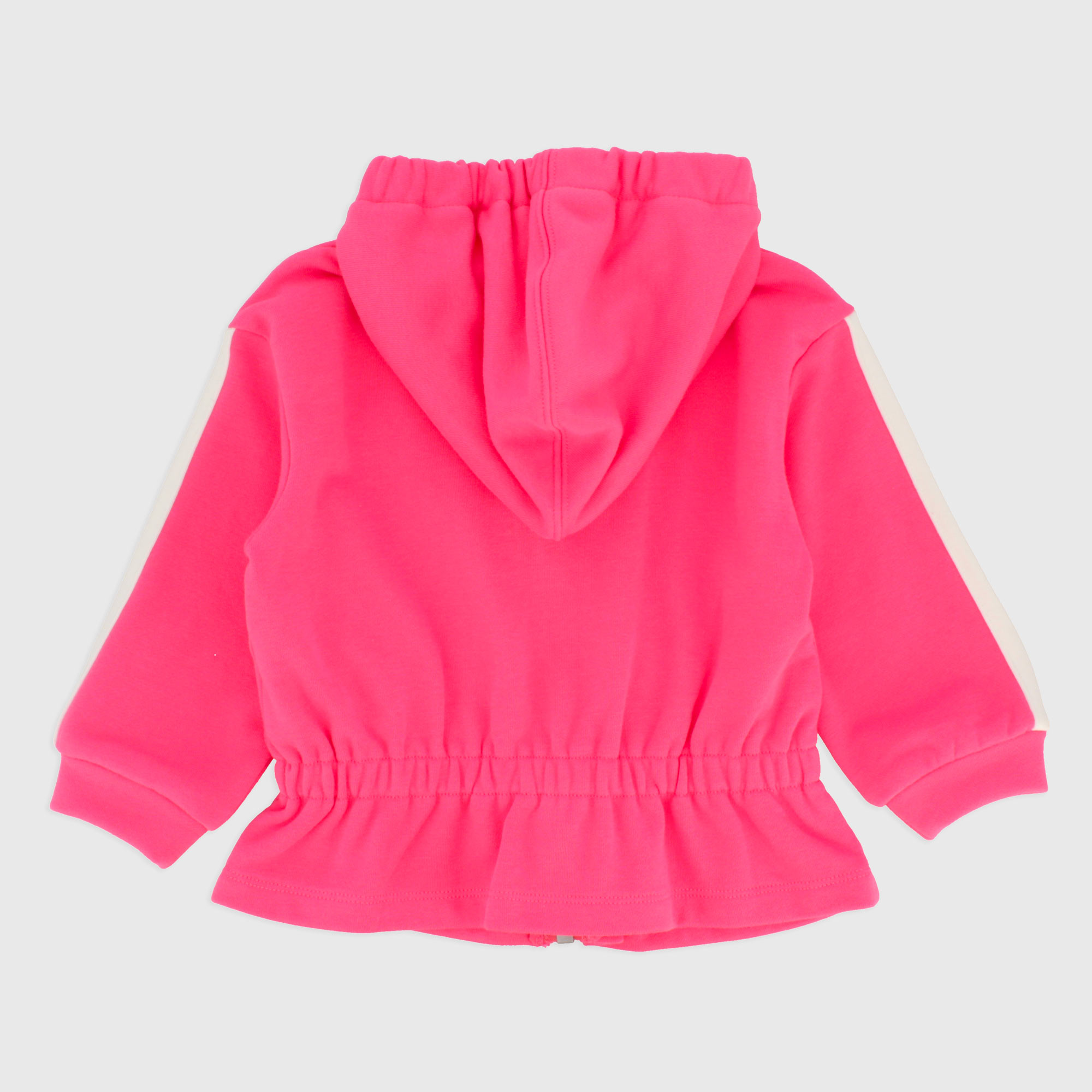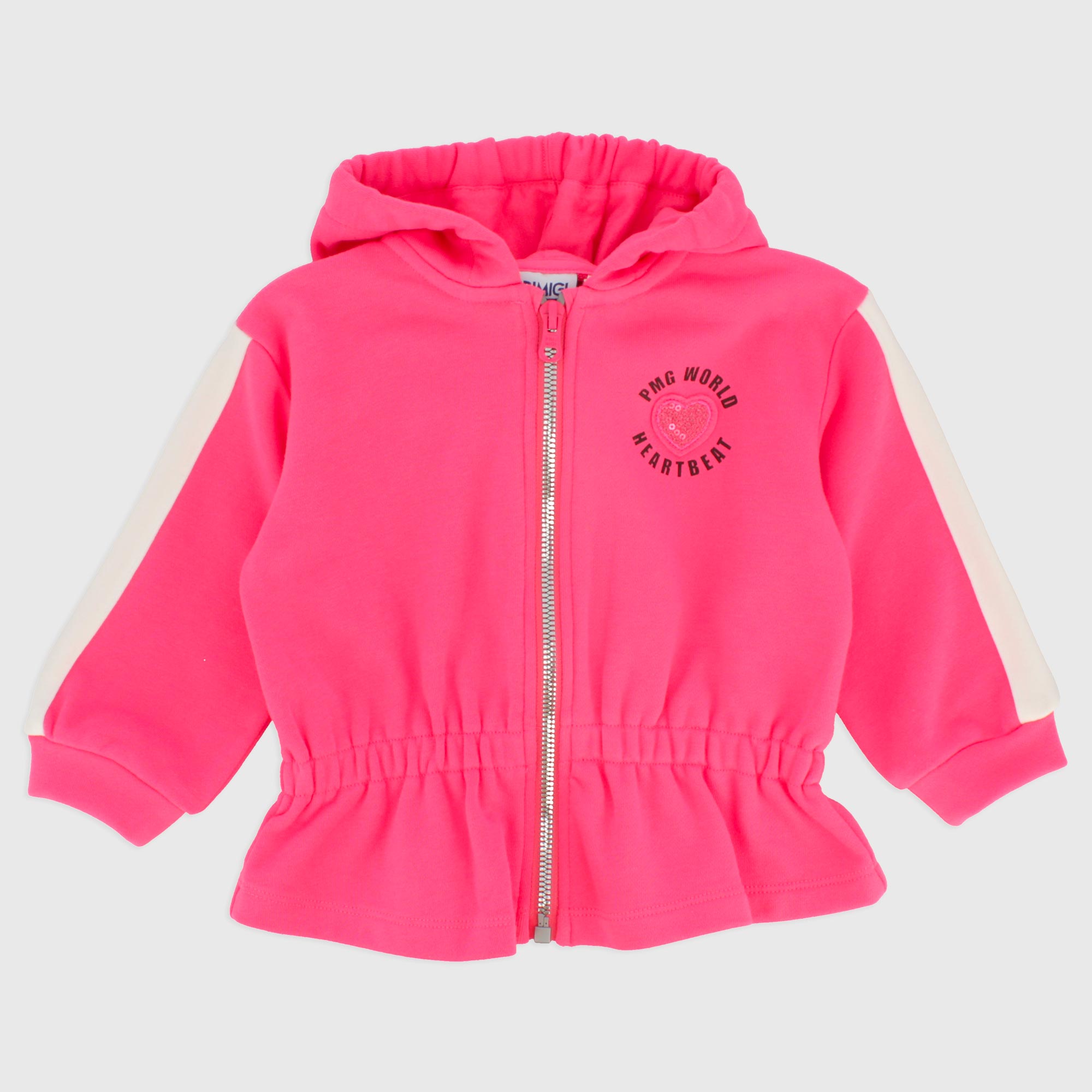Offenes Kapuzensweatshirt, lange Ärmel. Reißverschluss vorne. Kontrastierende Einsätze an den Ärmeln. Herzförmiger Patch mit Pailletten und Print auf der Vorderseite.