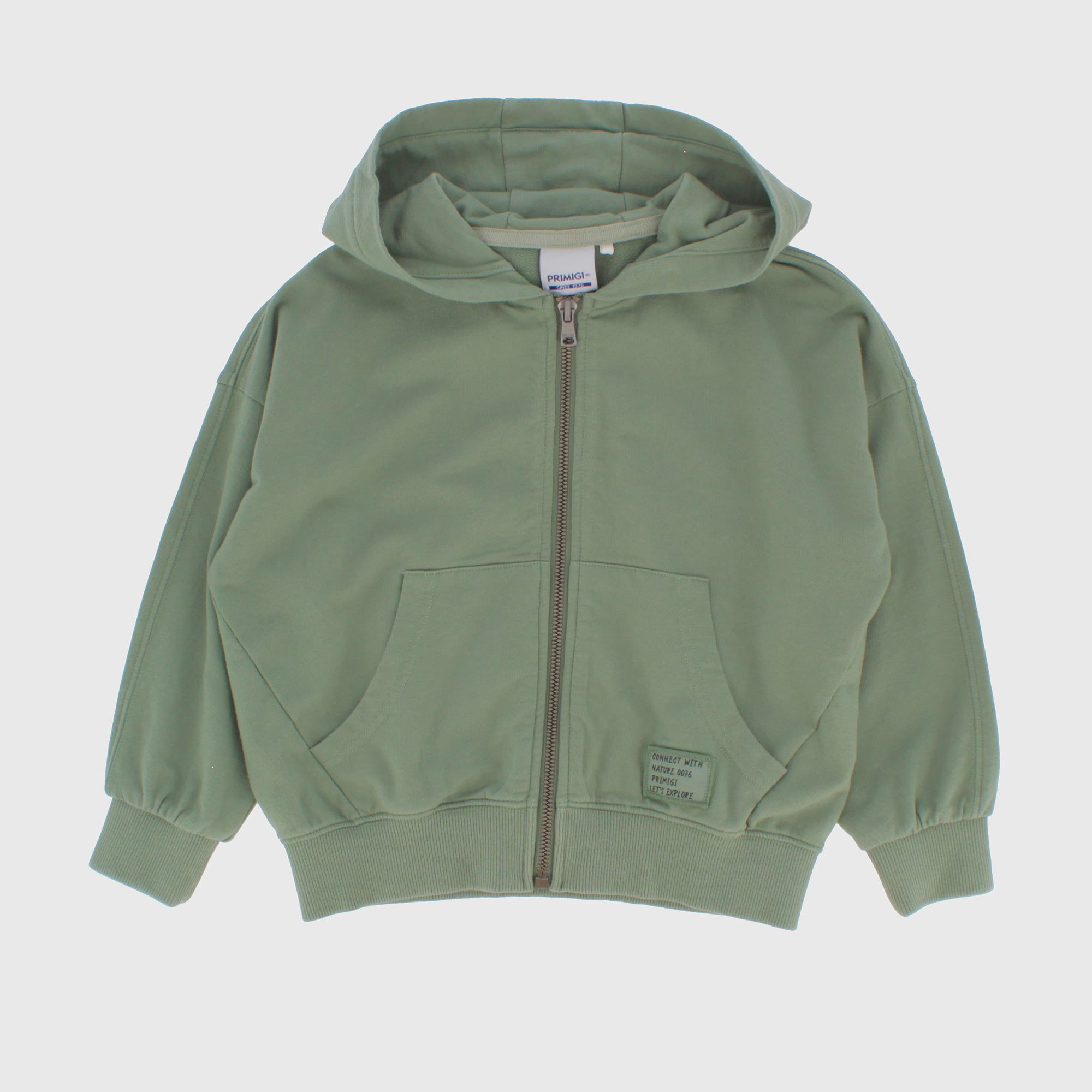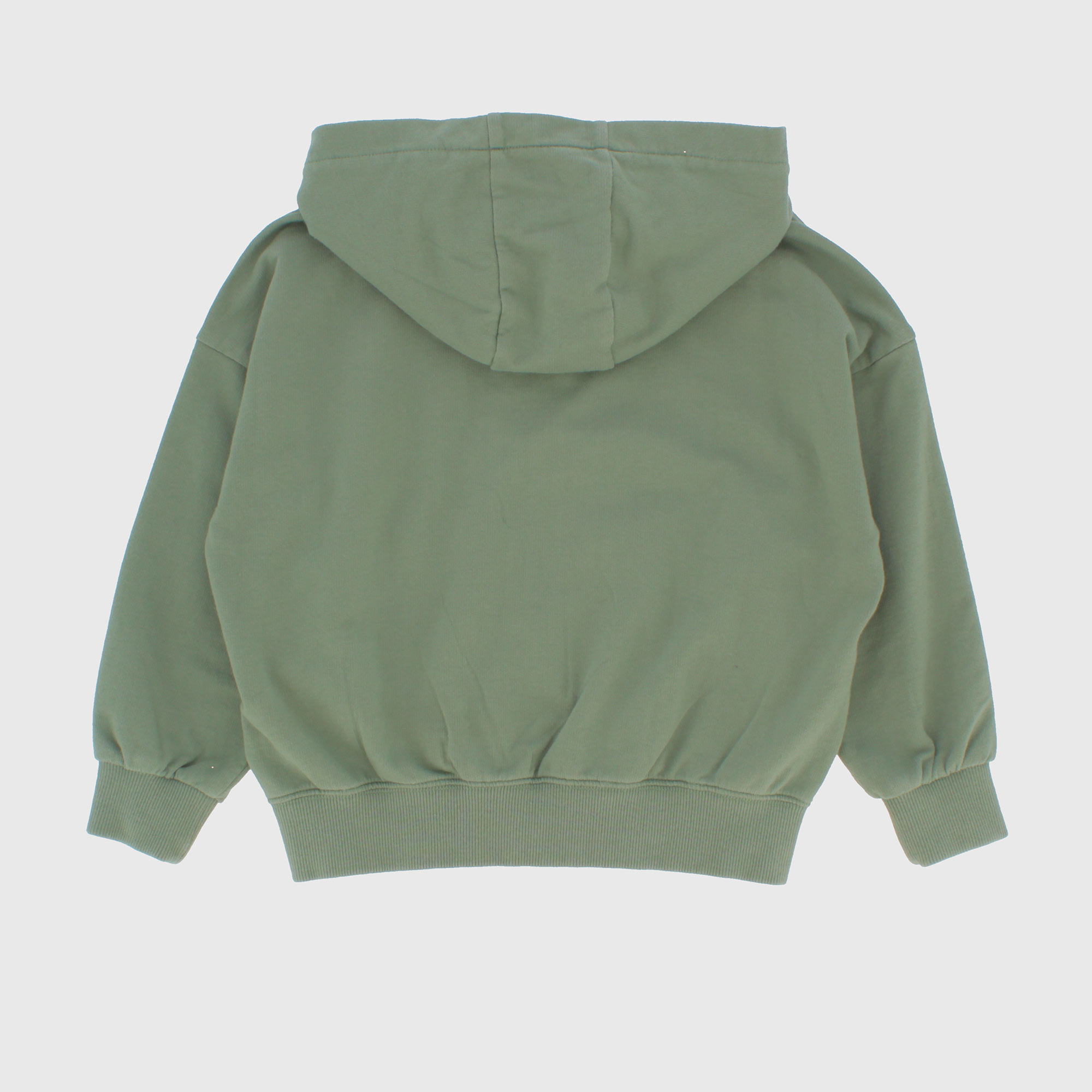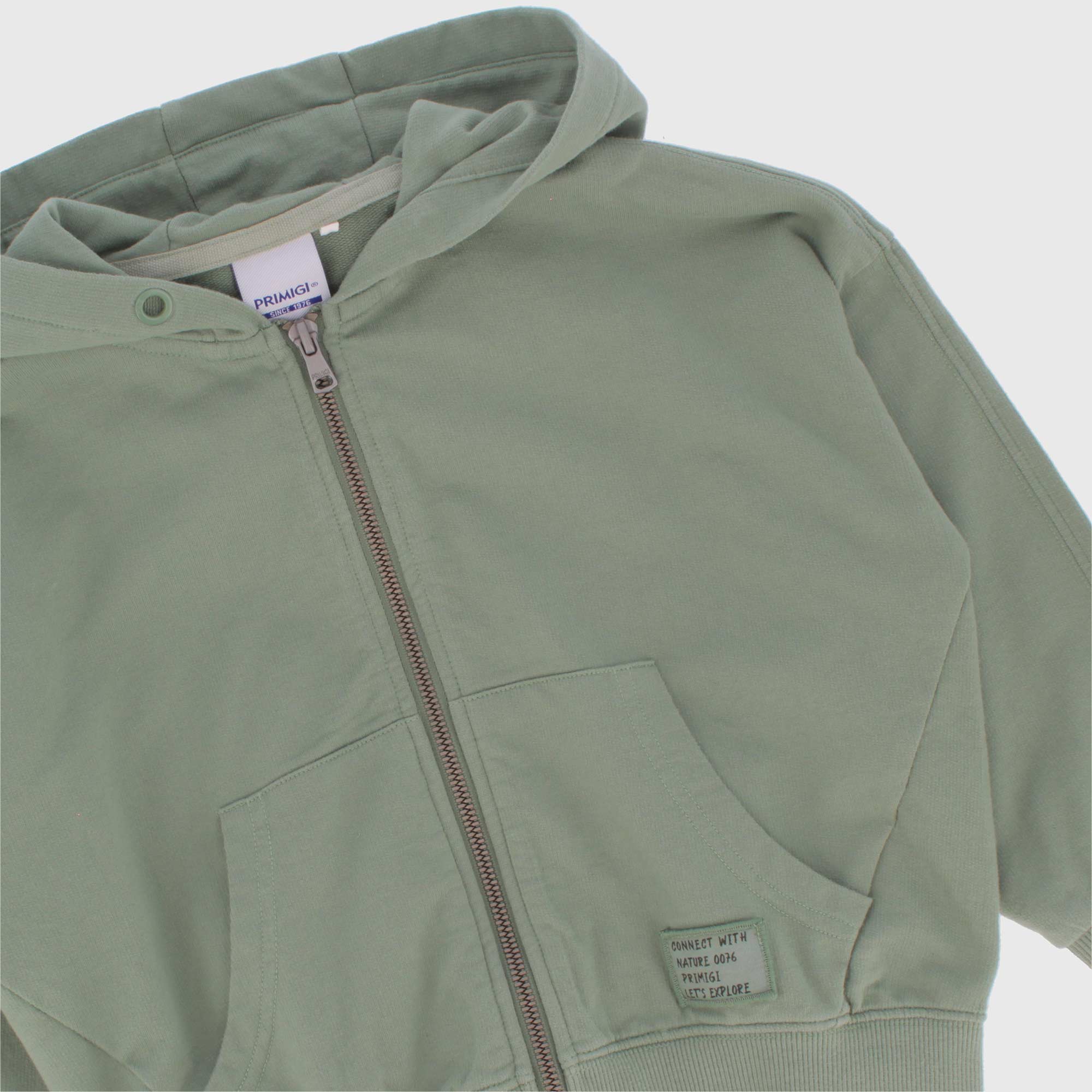 Offener Hoodie, langärmelig, "gebrauchter" Effekt. Reißverschluss vorne. Beuteltaschen vorne. Patch ton sur ton auf der Vorderseite.