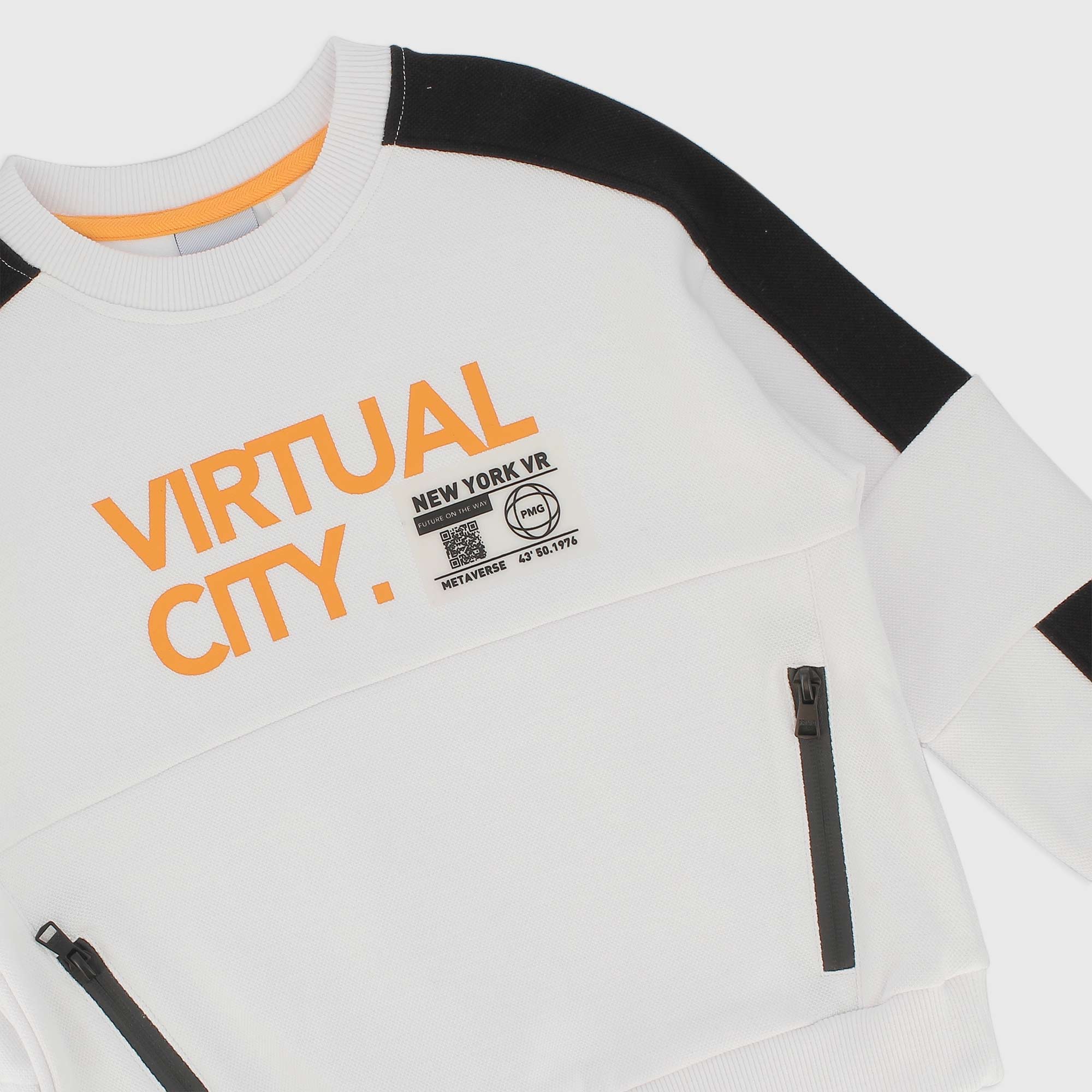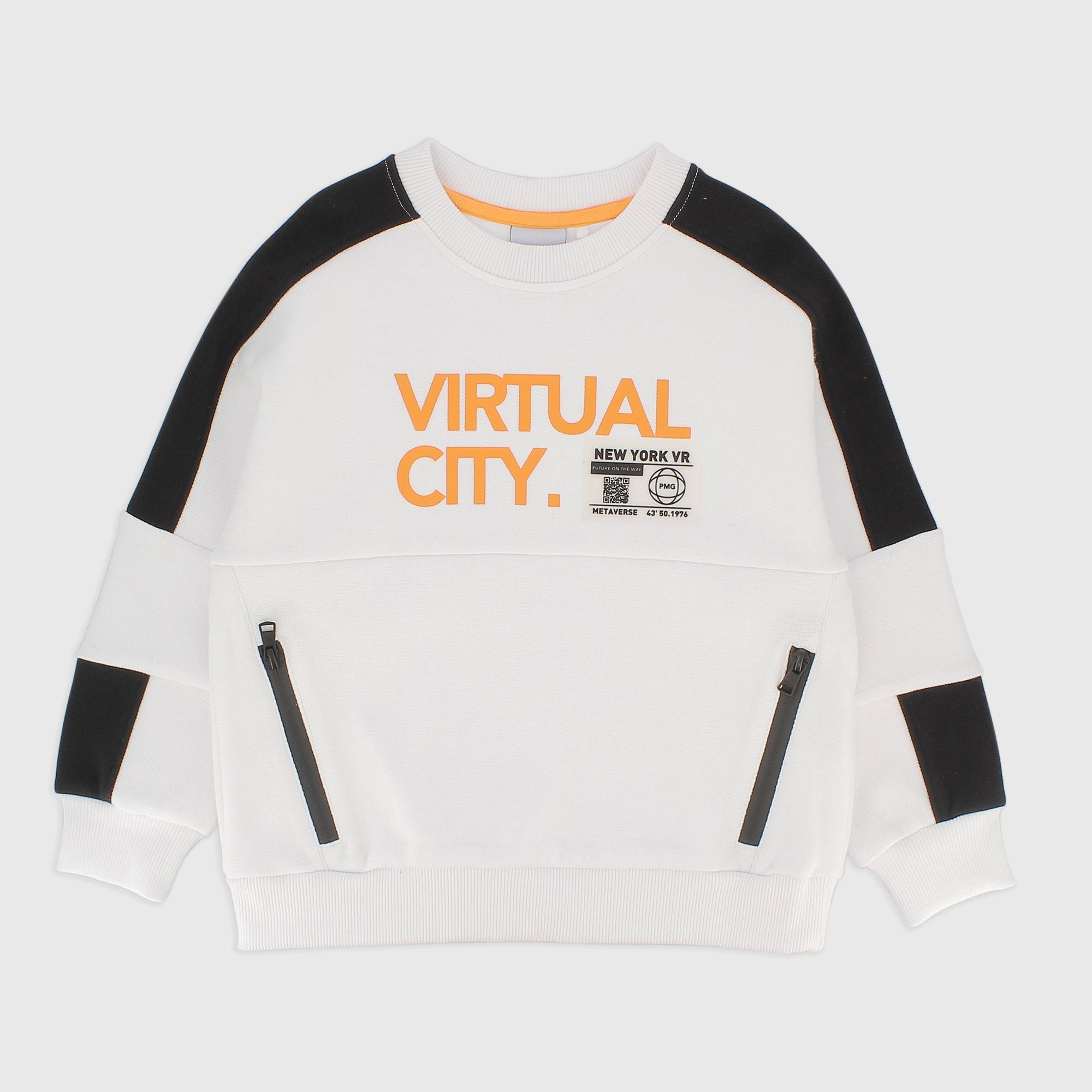 Rundhals-Sweatshirt mit langen Ärmeln und kontrastierenden Bändern. Fronttasche mit kontrastierendem Reißverschluss. Heißversiegelte gummierte Drucke.
