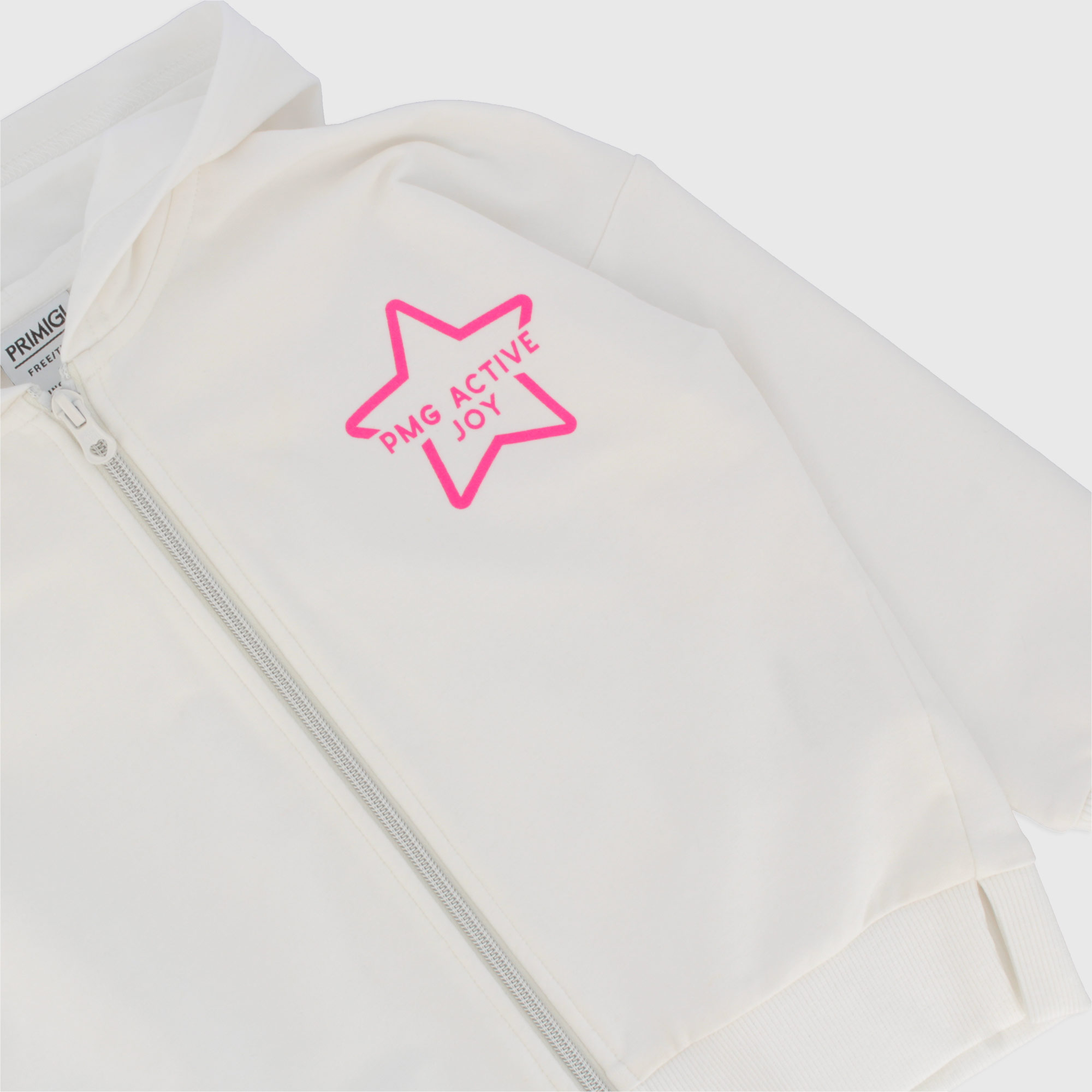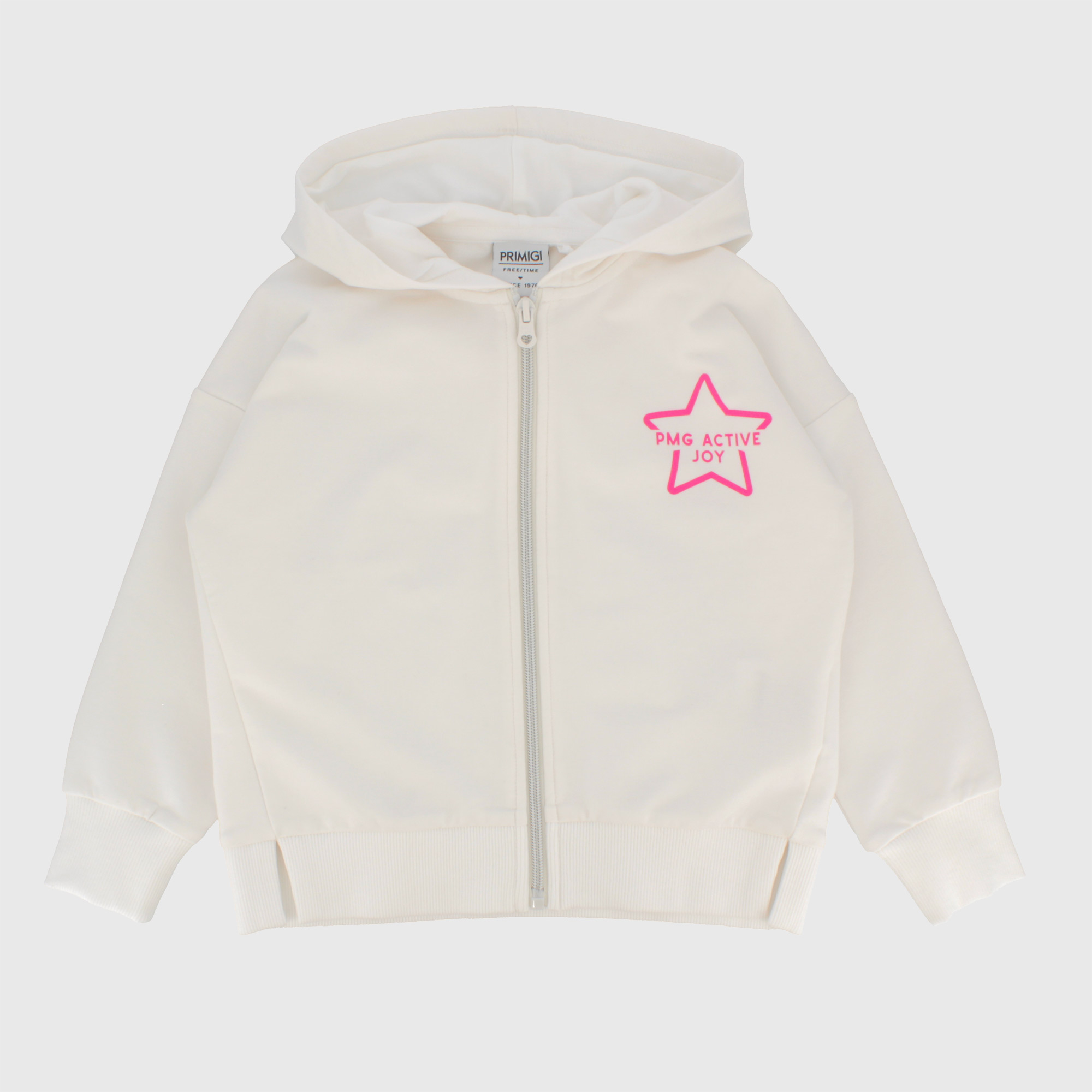 Offenes Kapuzensweatshirt, lange Ärmel. Reißverschluss vorne. Seitliche Schlitze auf der Unterseite, Druck auf der Vorderseite.