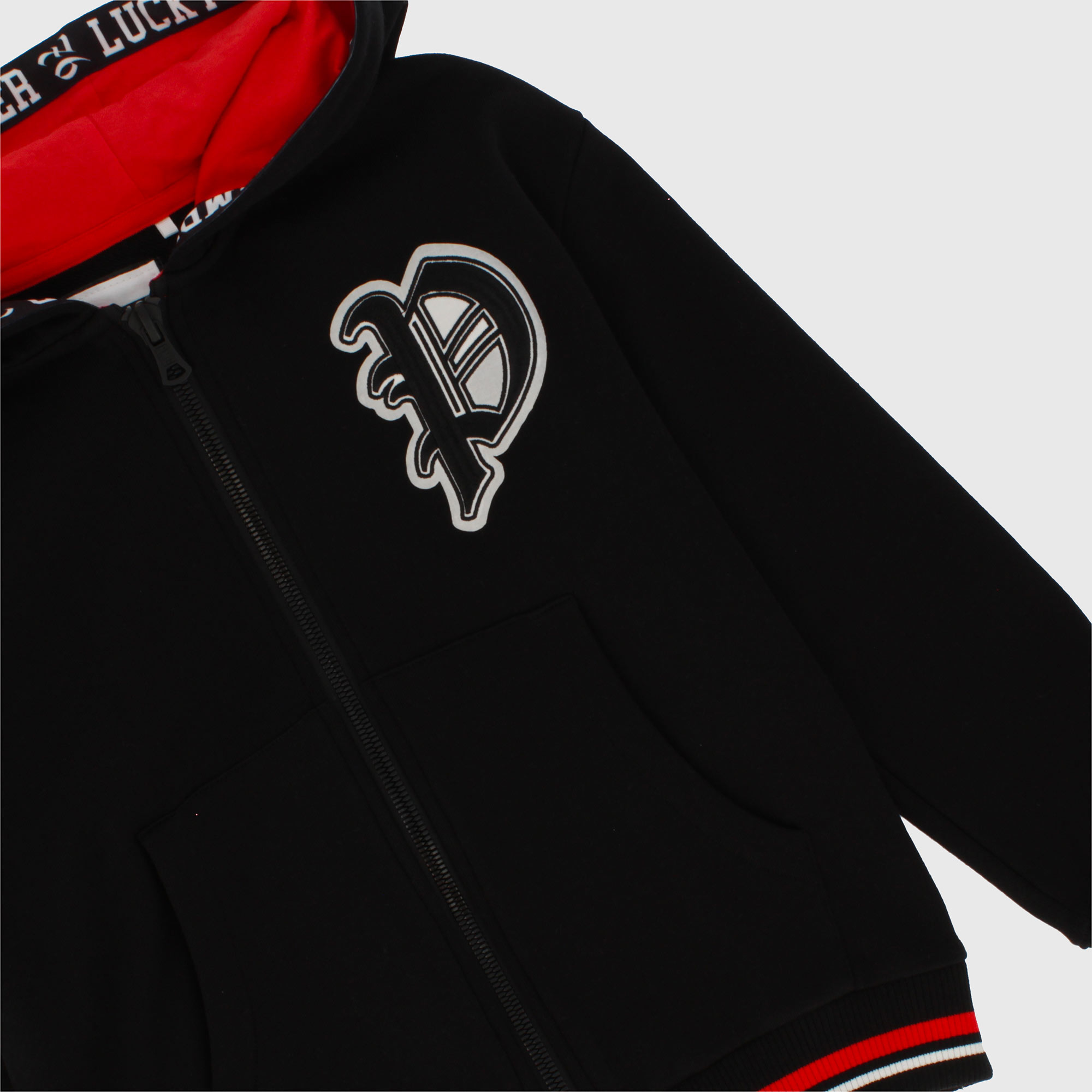 Kapuzenpullover mit kontrastierendem Futter, lange Ärmel. Reißverschluss vorne. Hüfttaschen und gestickter Patch auf der Vorderseite. Kontrastbänder und gestreifter gerippter Saum.