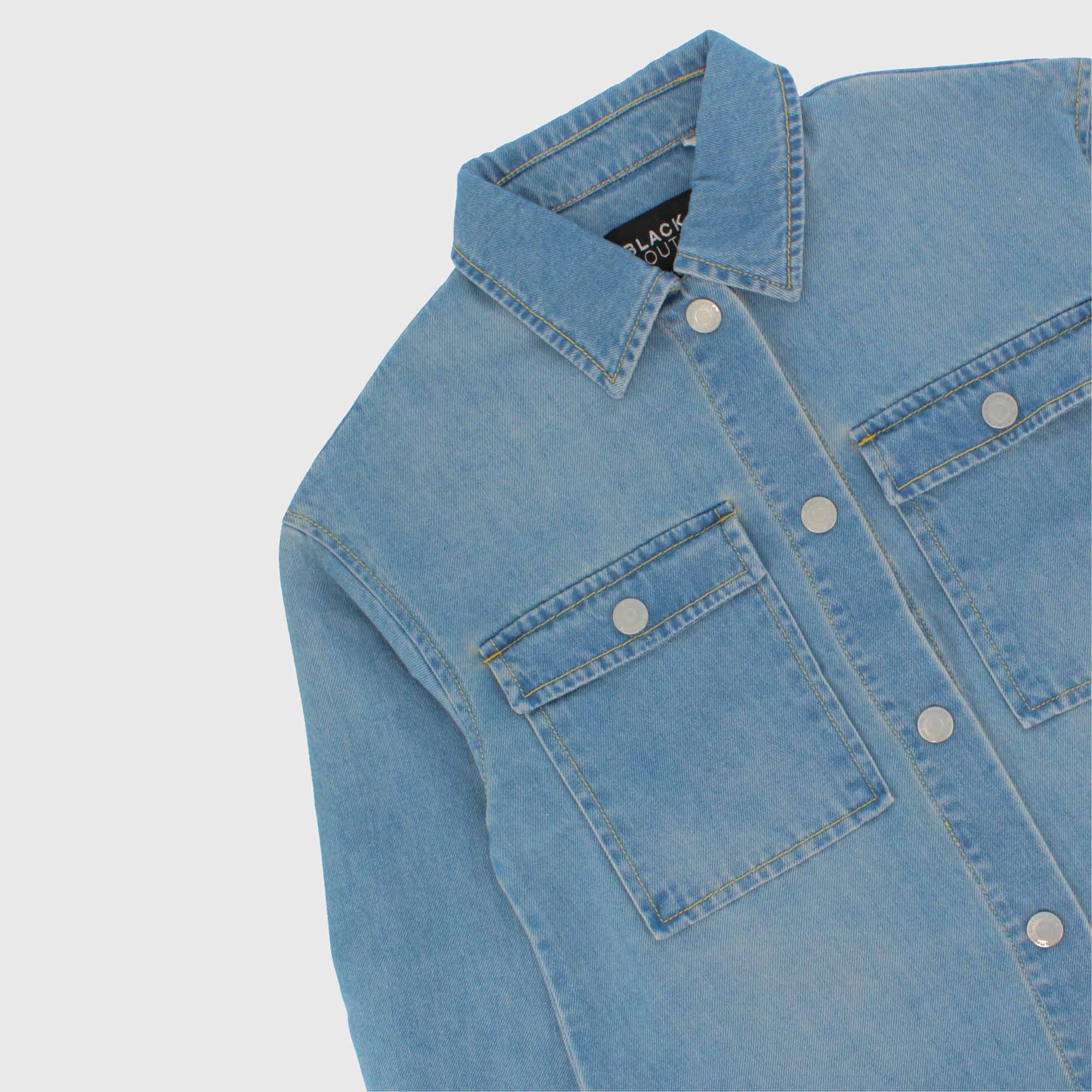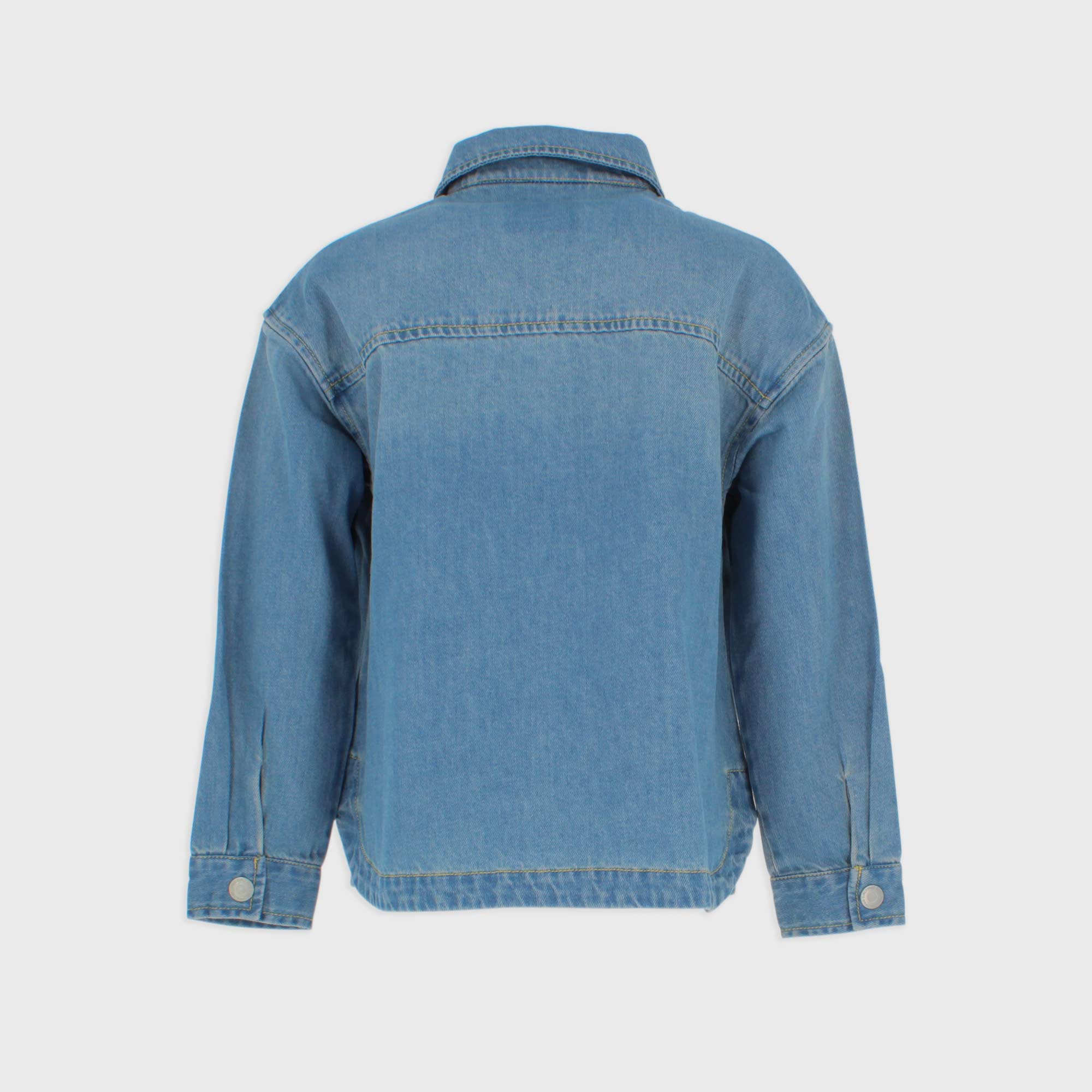 Langärmliges Jeans-Overshirt. Frontverschluss mit Druckknöpfen. Aufgesetzte Taschen auf der Vorderseite. Unten abgerundet.