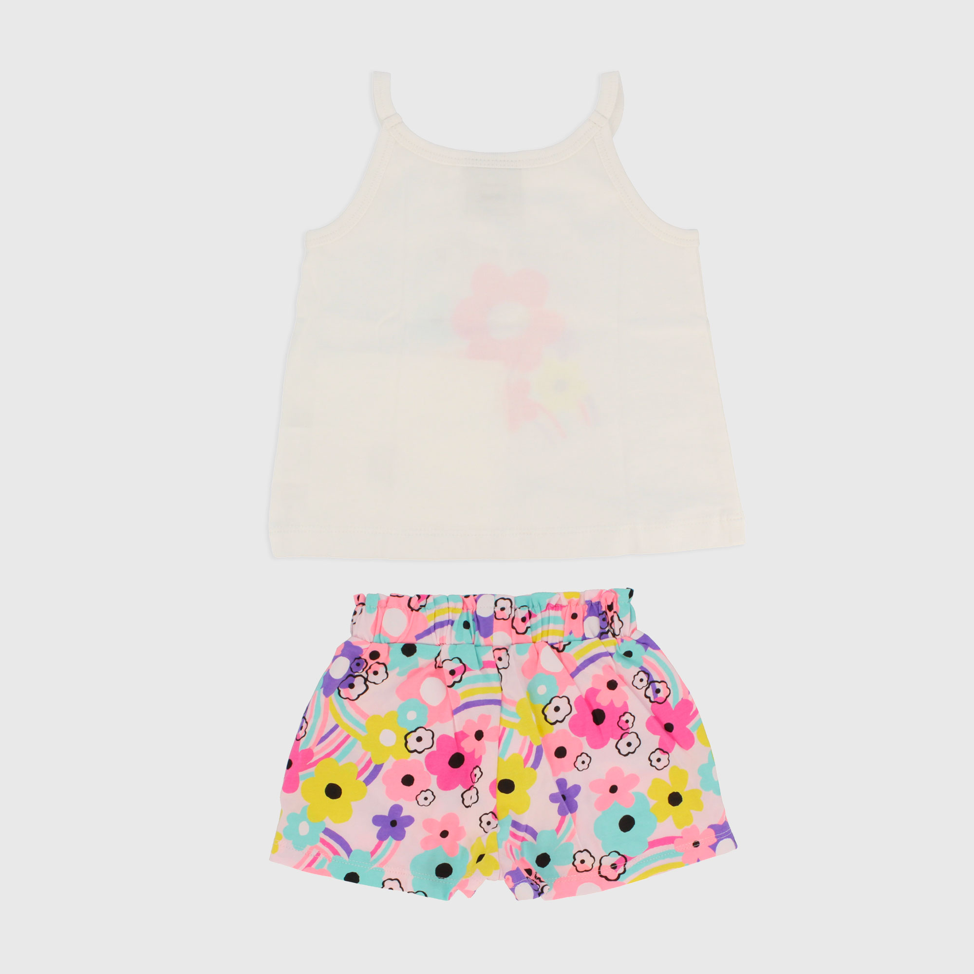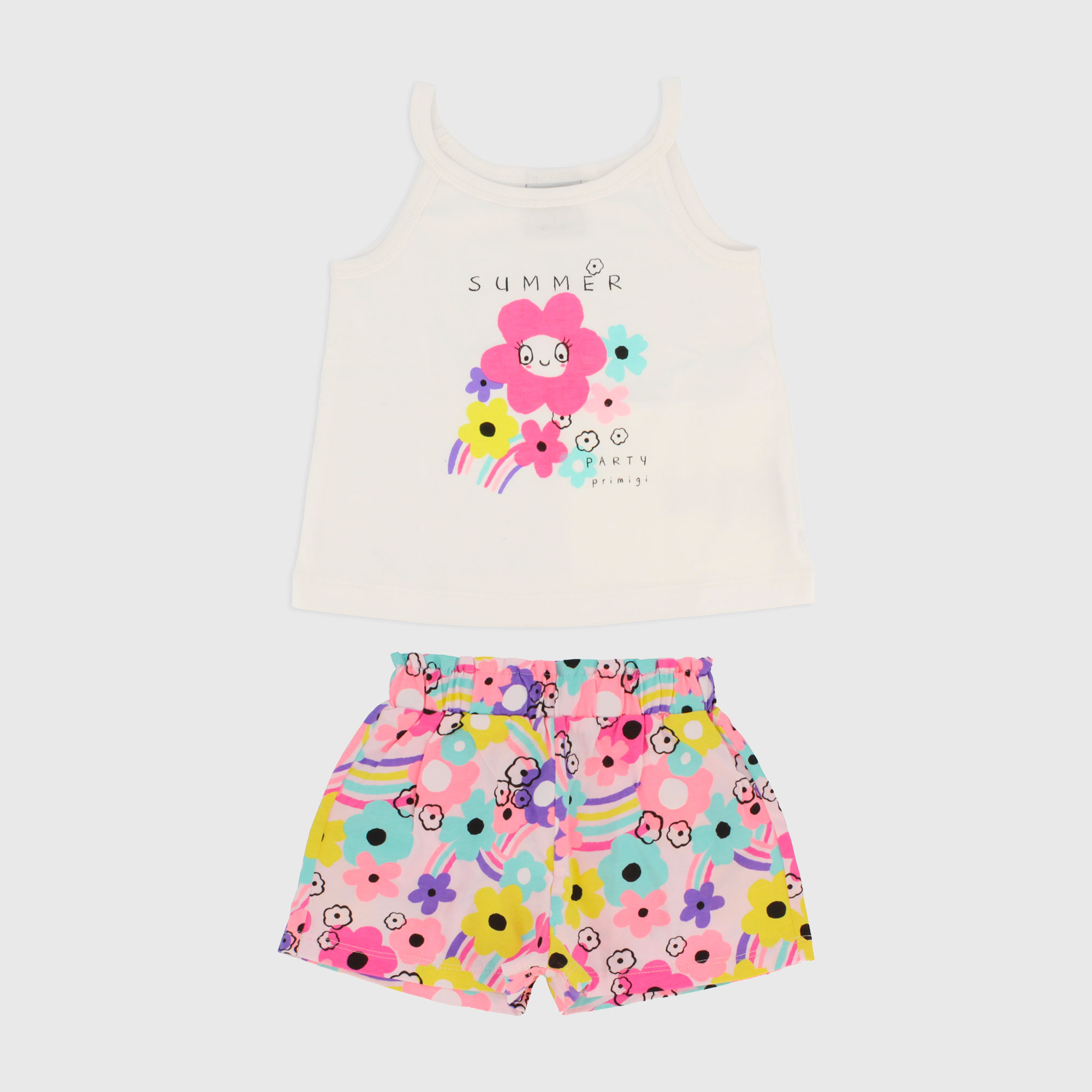 Komplett bestehend aus zwei Teilen. Jersey Tanktop mit dünnen Hosenträgern. Frontdruck. Jersey-Shorts mit elastischer Taille und Allover-Print.