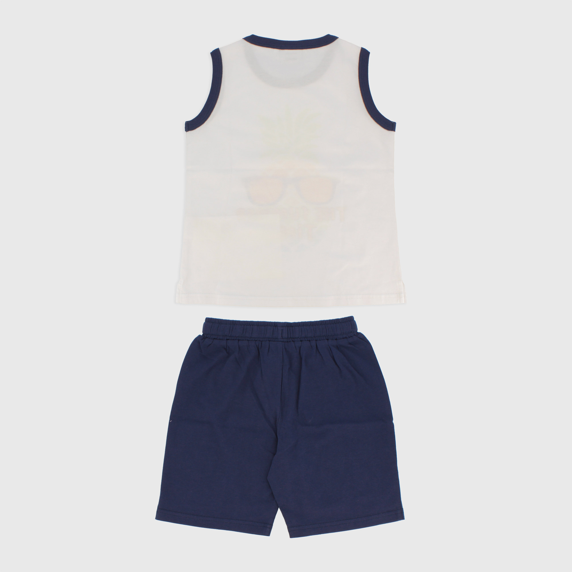 Komplett bestehend aus zwei Teilen. Jersey-Tanktop mit Rundhalsausschnitt. Frontdruck. Jersey-Shorts mit elastischer Taille und vorderen Schnürsenkeln.