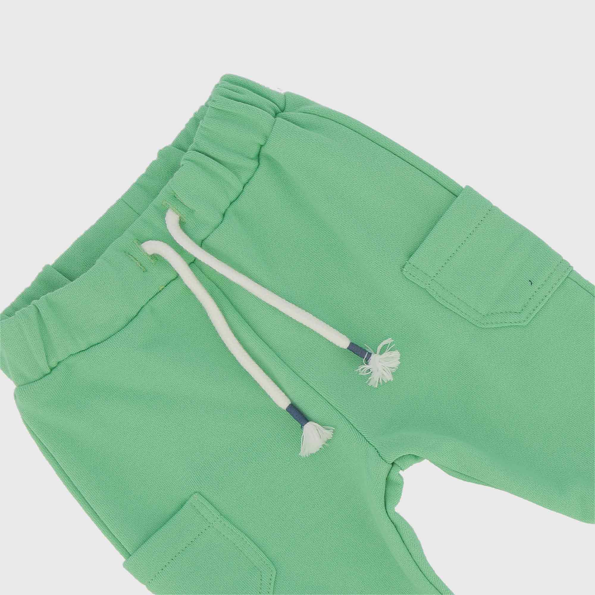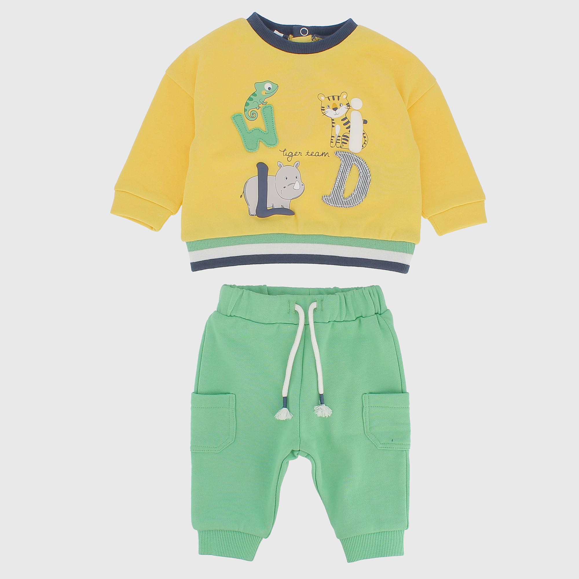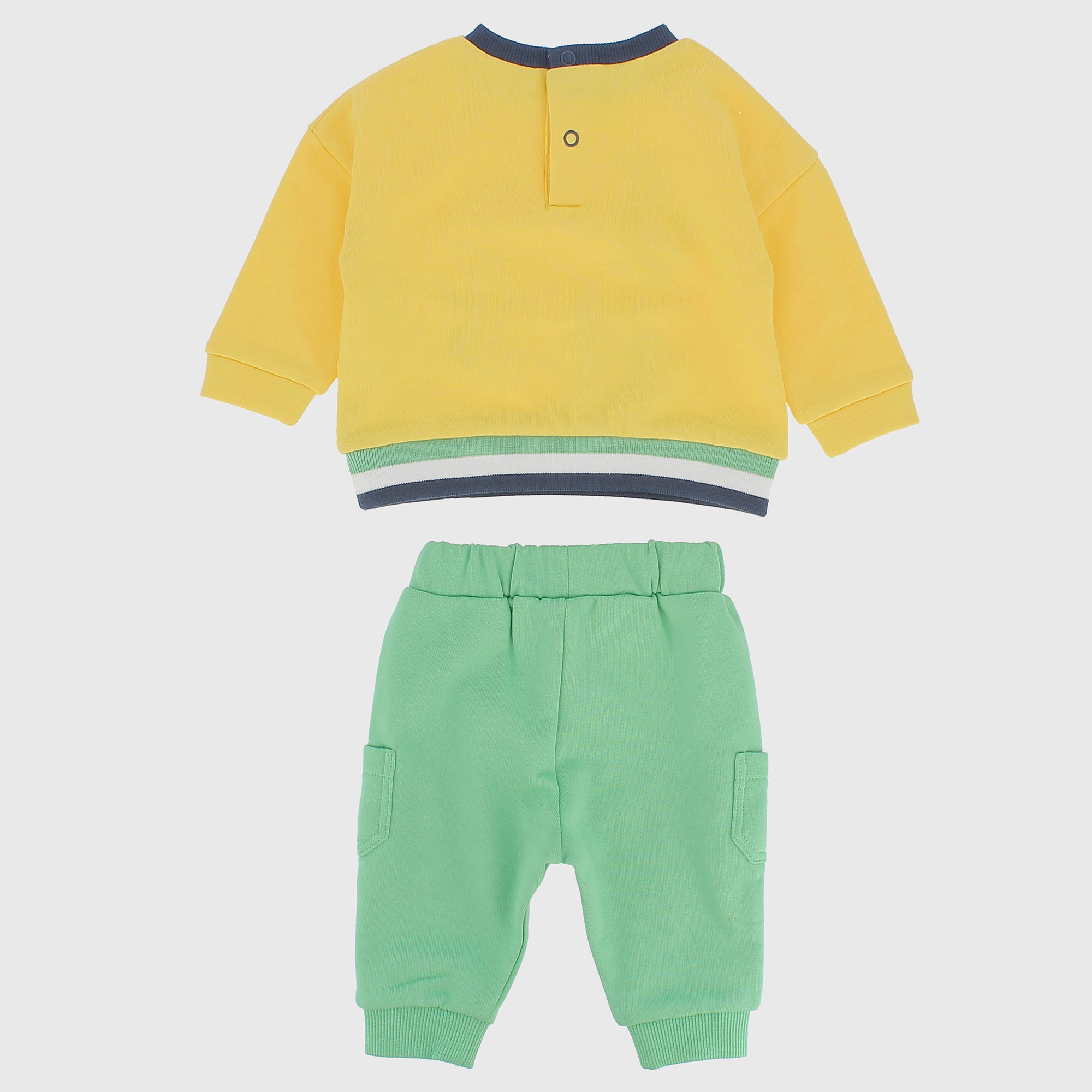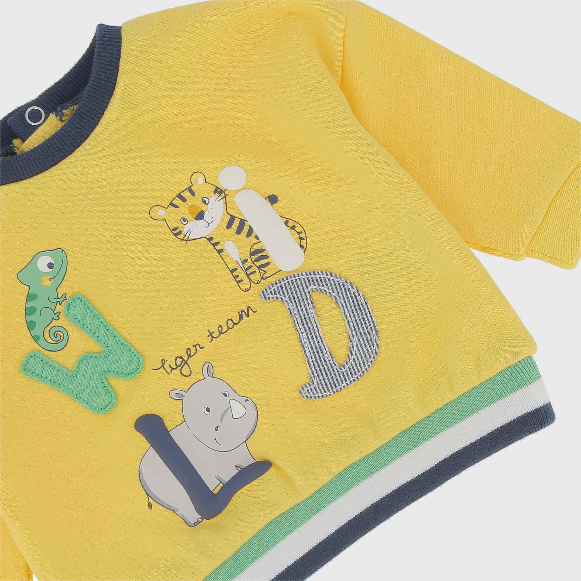 Komplett bestehend aus zwei Teilen. Langärmliges Sweatshirt mit Rundhalsausschnitt. Rückenverschluss mit Druckknöpfen. Auf der Vorderseite Druck und Patch. Fleecehose mit elastischer Taille mit Kordelzug und Seitentaschen.