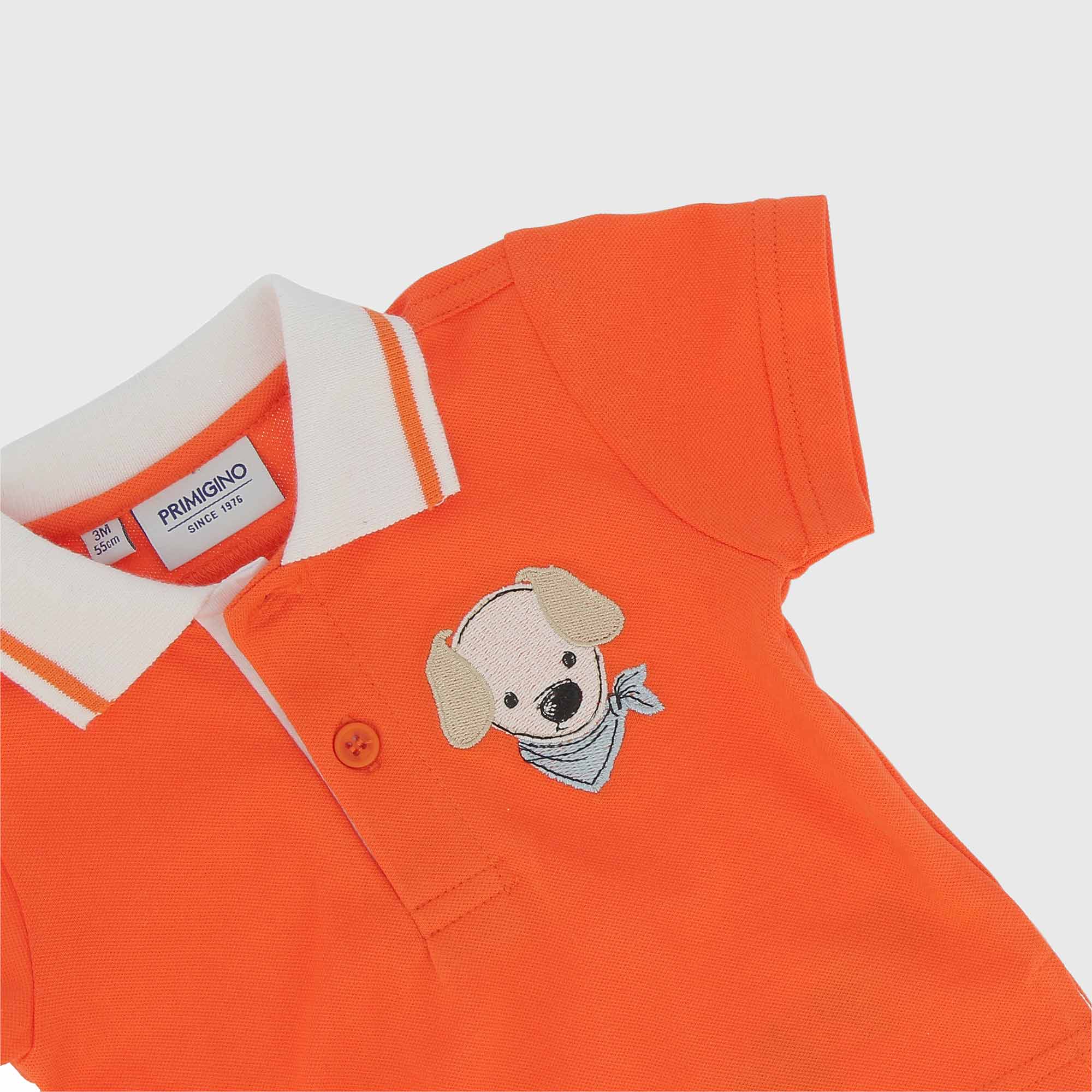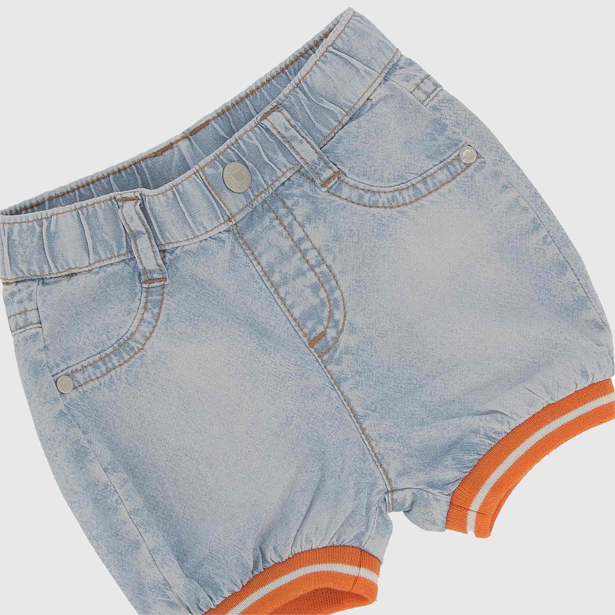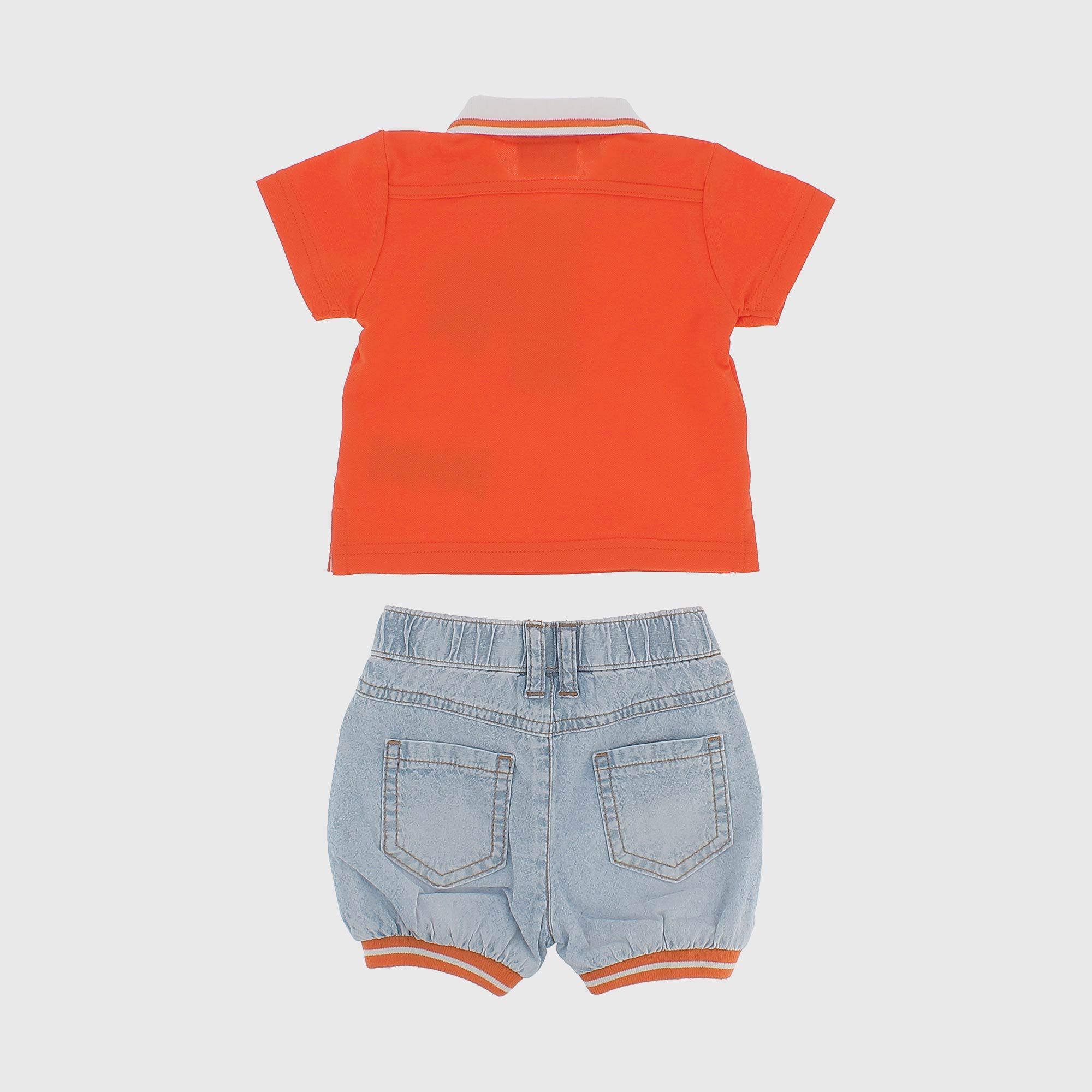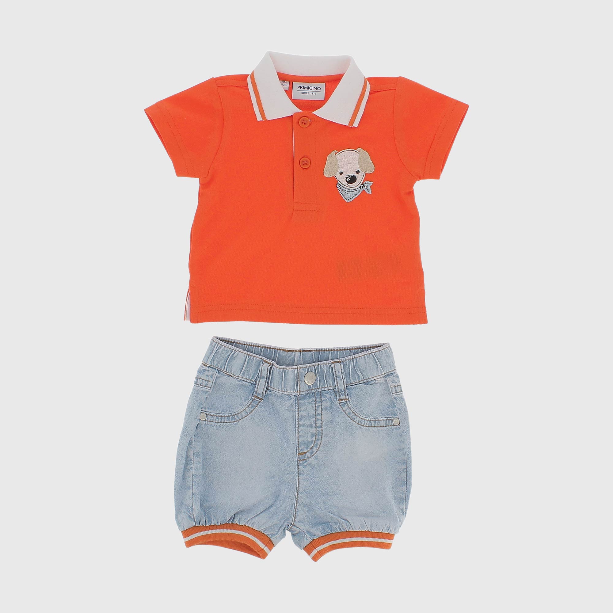 Komplett bestehend aus zwei Teilen. Jersey Poloshirt mit kurzen Ärmeln. Frontverschluss mit Knöpfen. Kleiner Hund auf der Vorderseite bestickt. Jeansshorts mit elastischer Taille und kontrastierendem geripptem Saum.