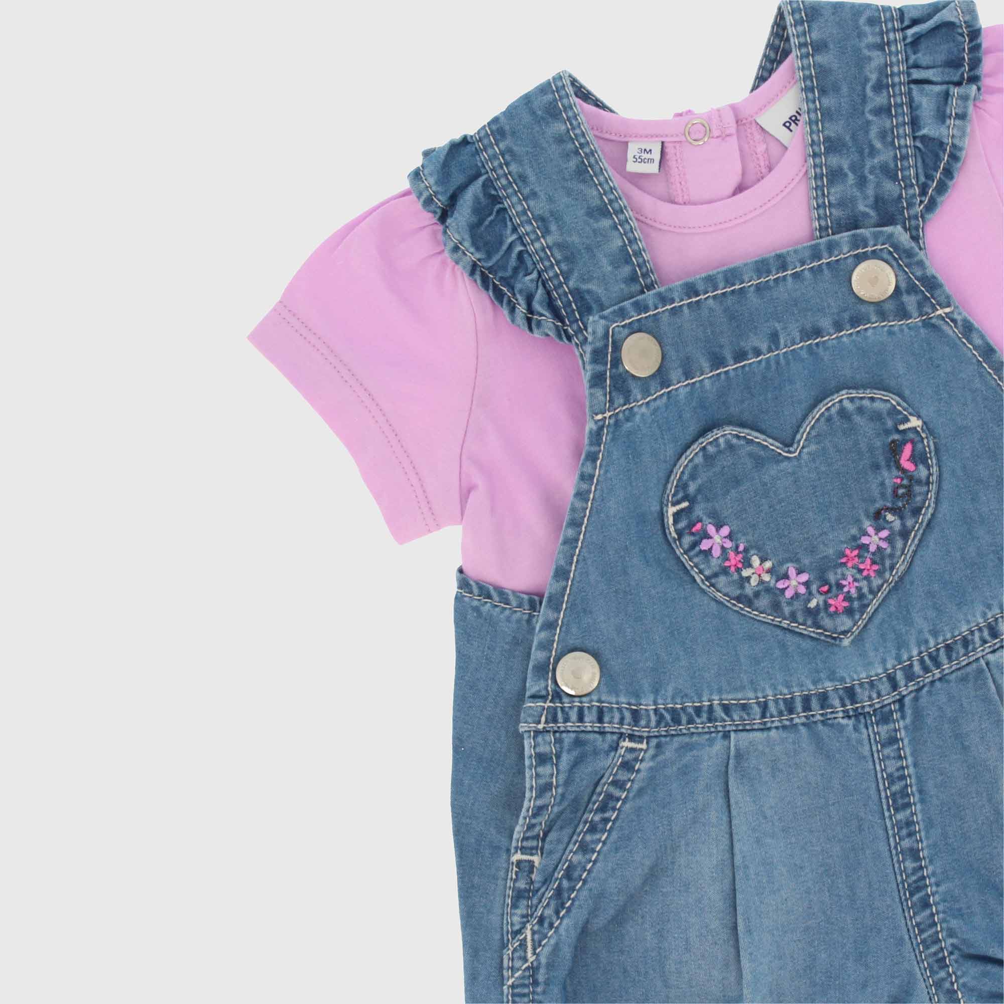 Komplett bestehend aus zwei Teilen. Kurzärmelige Trikot-Bodys. Verschluss mit Druckknopf auf der Rückseite. Denim Trägerhose. Herzförmige Tasche auf der Vorderseite.