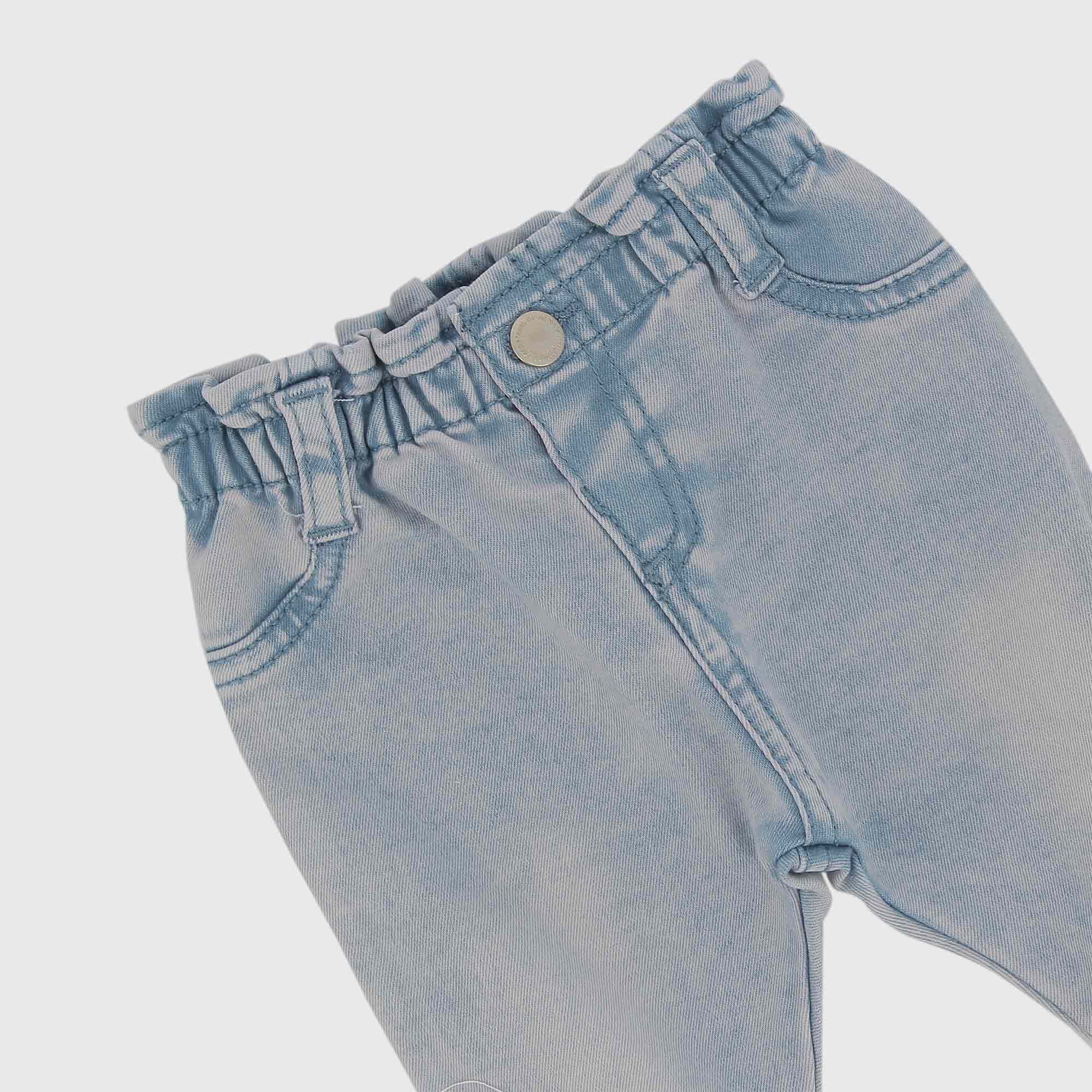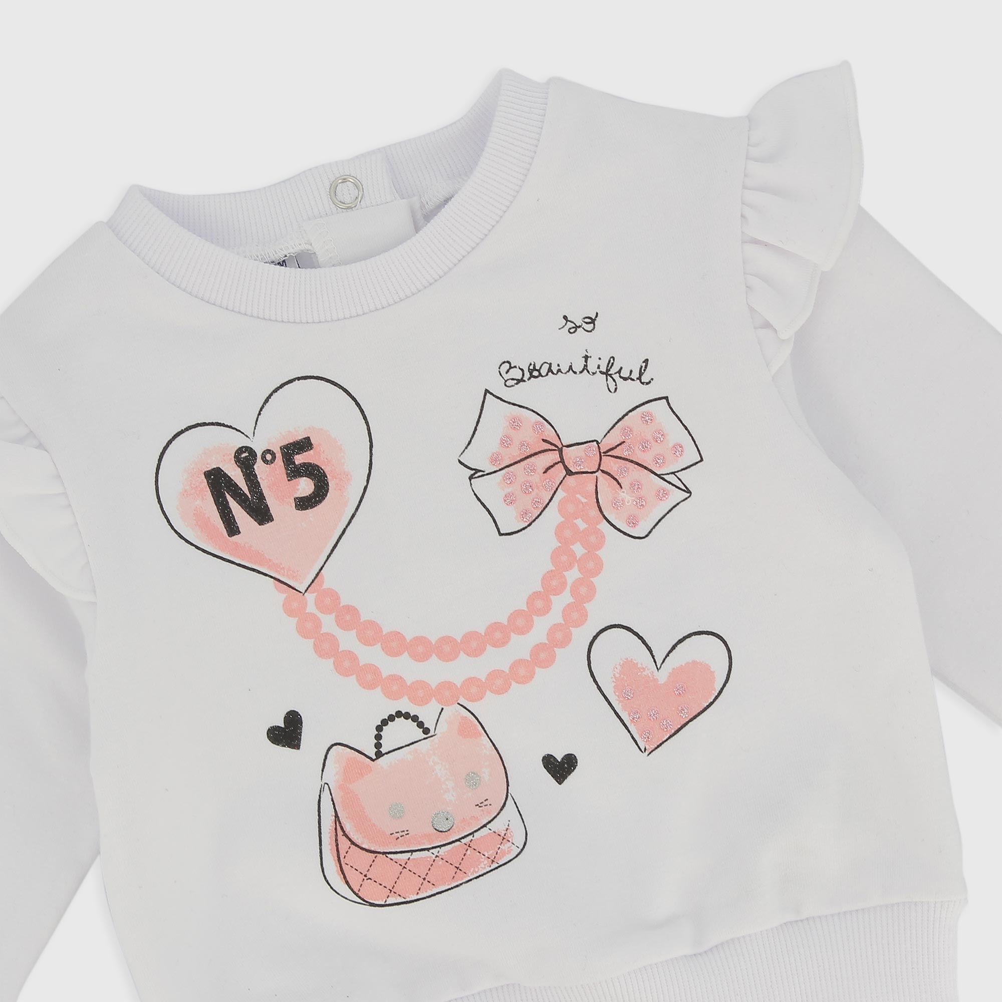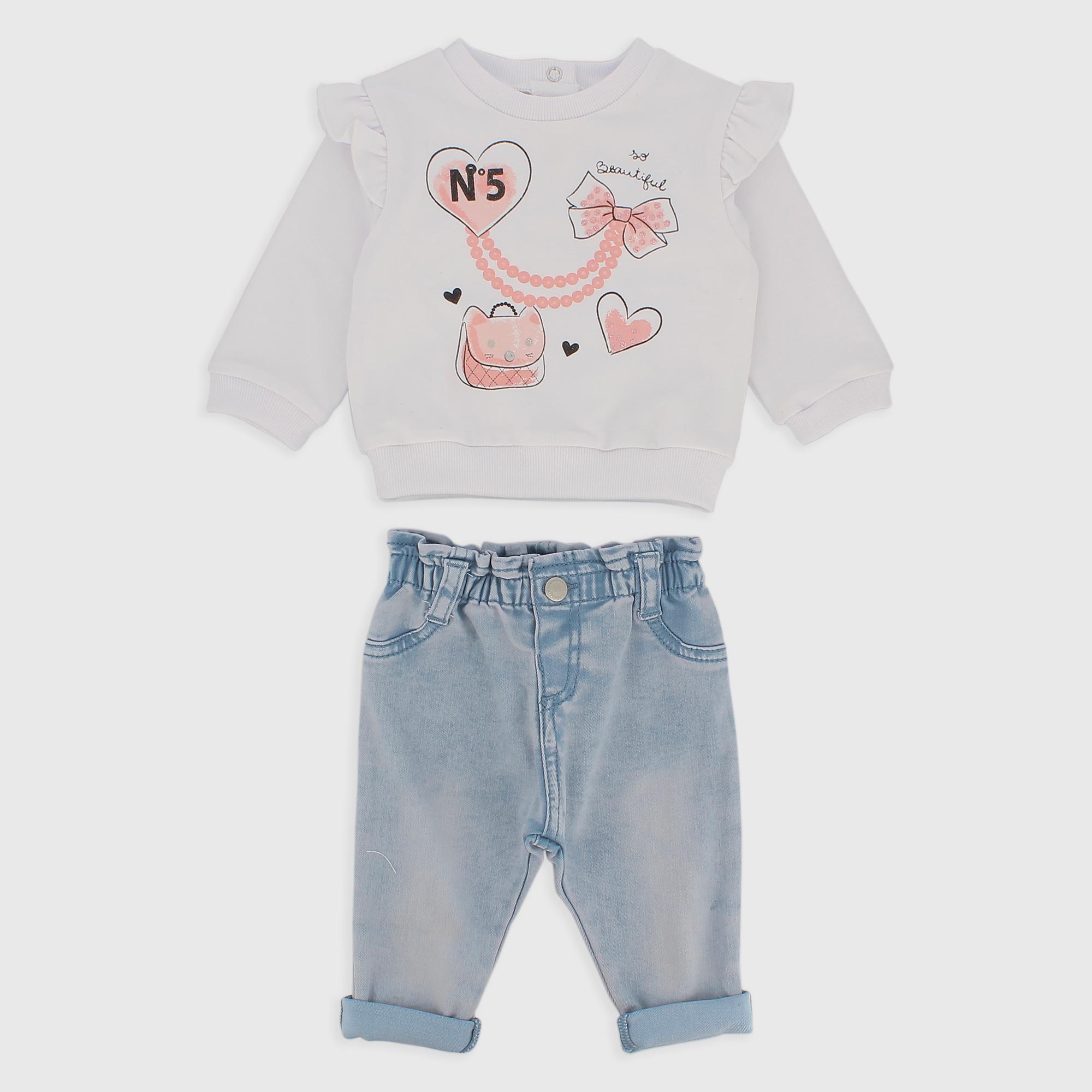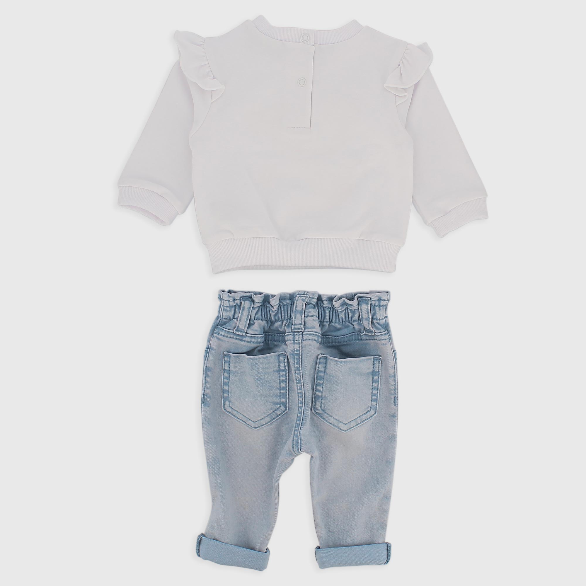 Komplett bestehend aus zwei Teilen. Sweatshirt mit Rundhalsausschnitt, lange Ärmel. Rückenverschluss mit Druckknöpfen. Frontprint mit Glitzerdetails, Rüschen auf den Schultern. Jeanshose mit elastischer Taille und Gesäßtaschen.
