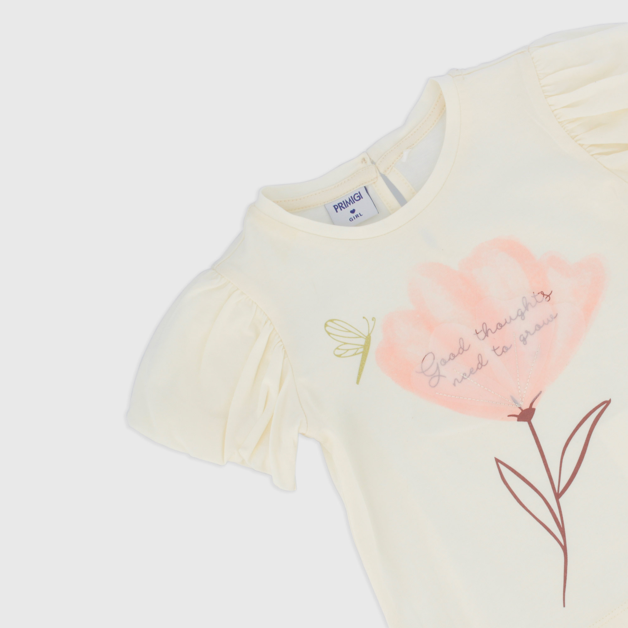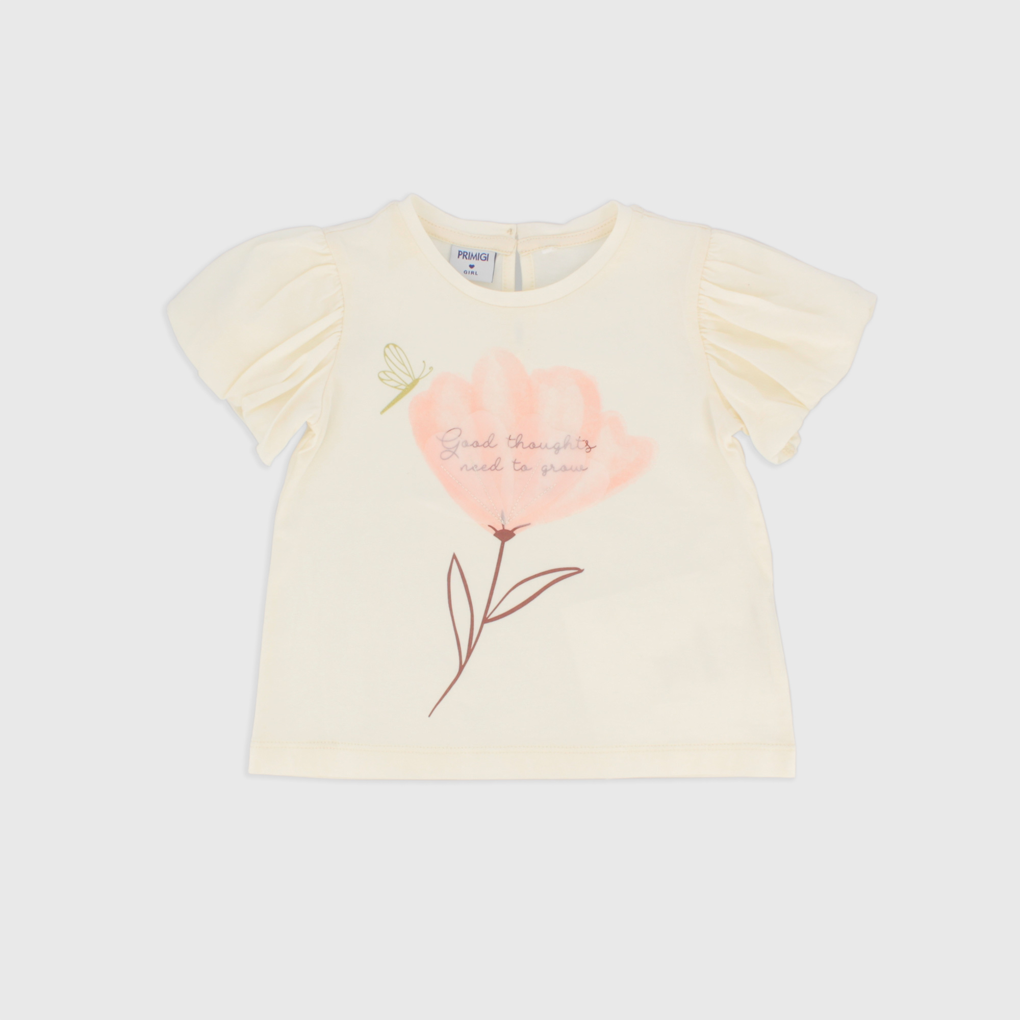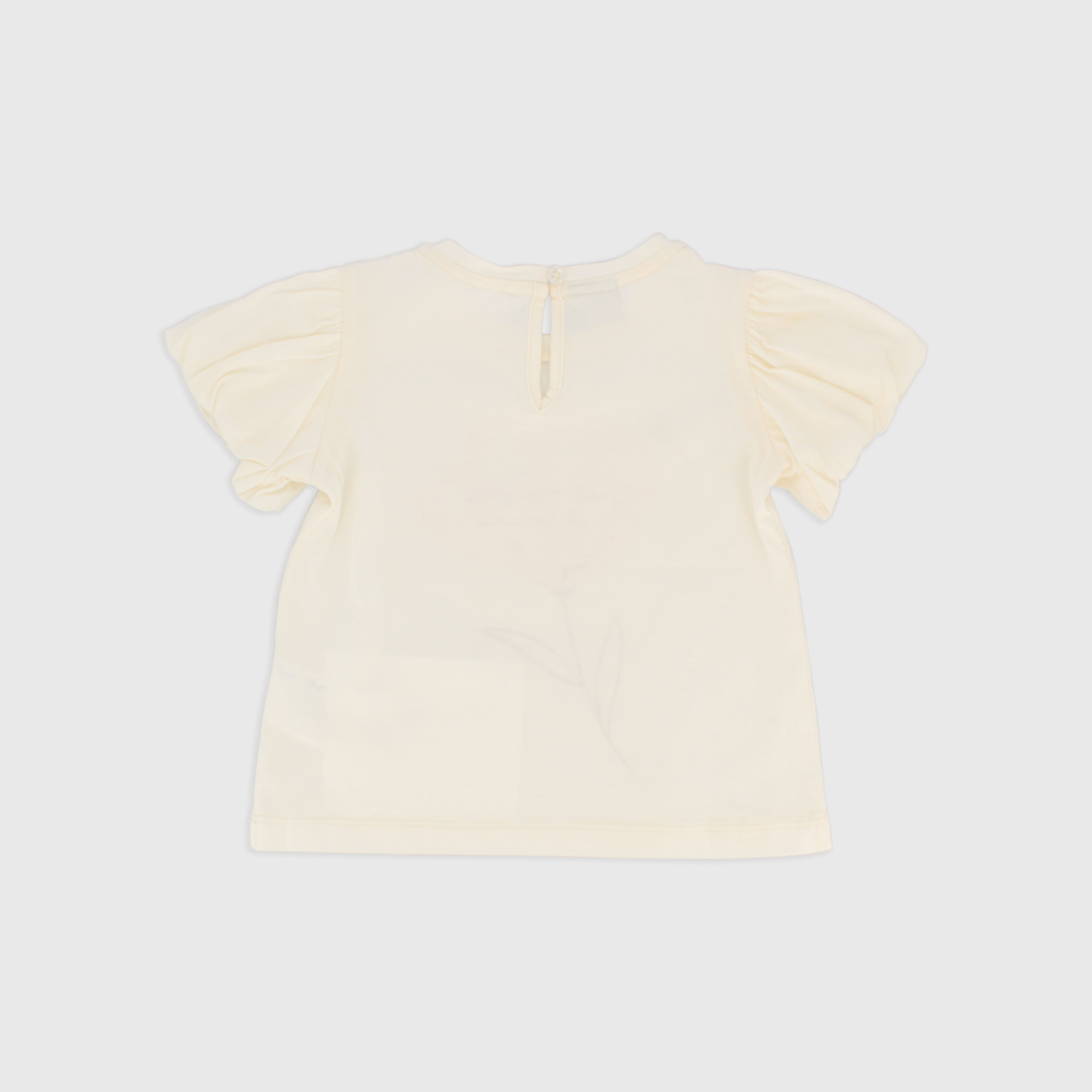 Jersey T-shirt, Rundhalsausschnitt, kurzärmeliger Ballon. Tropfenverschluss mit Rückknopf. Druck mit Tüllapplikation auf der Vorderseite.