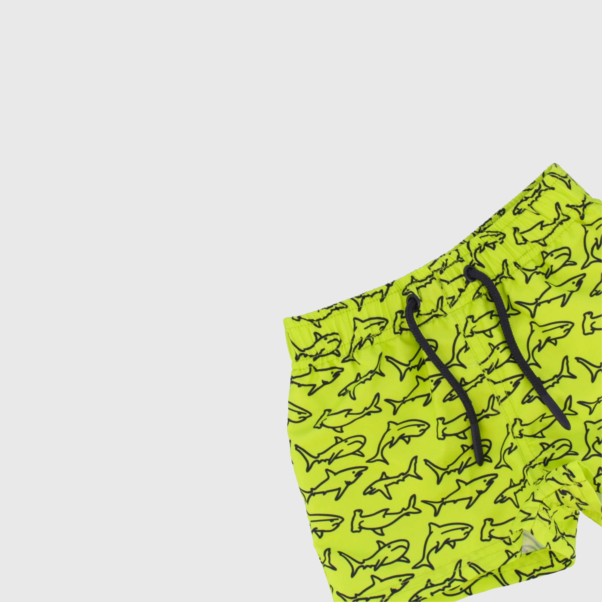 Gemusterte Strandshorts mit elastischer Taille und vorderen Schnürsenkeln. Innenhöschen aus Micro-Mesh.