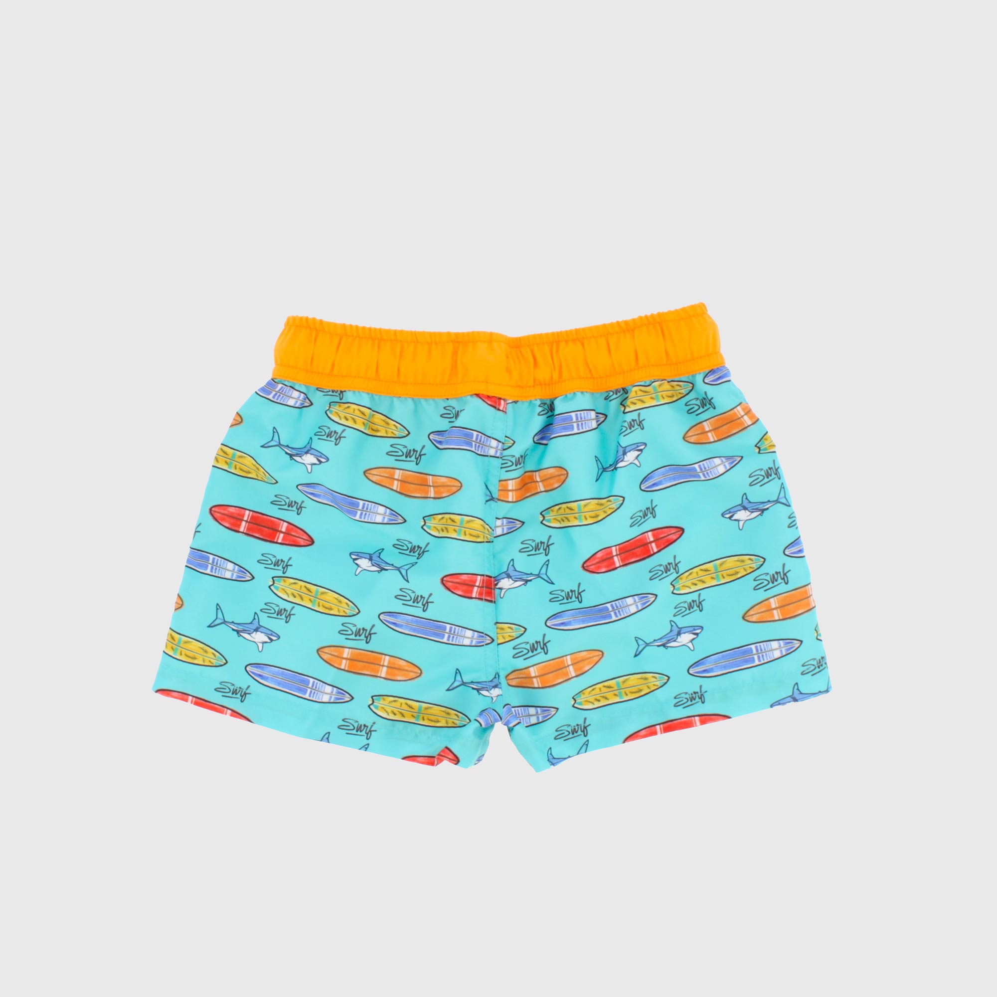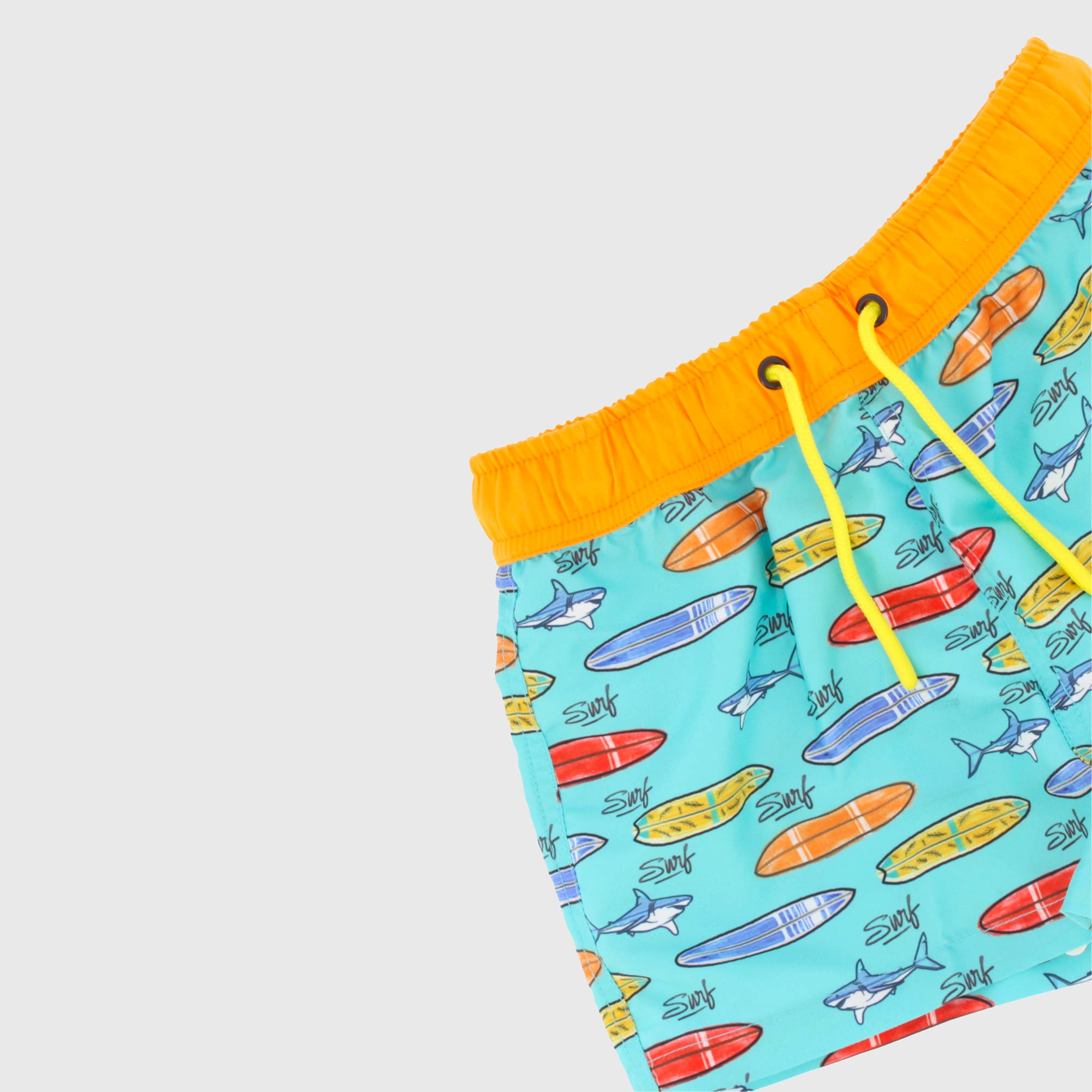 Gemusterte Strandshorts mit elastischer Taille und vorderen Schnürsenkeln. Innenhöschen aus Micro-Mesh.