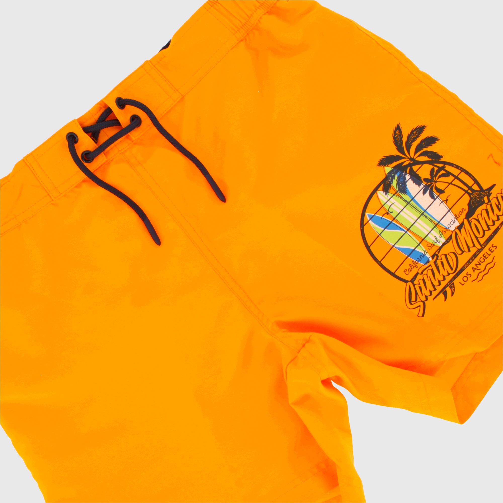 Strandshorts mit elastischer Taille und vorderen Schnürsenkeln. Druck auf der Vorderseite. Innenhöschen aus Micro-Mesh.