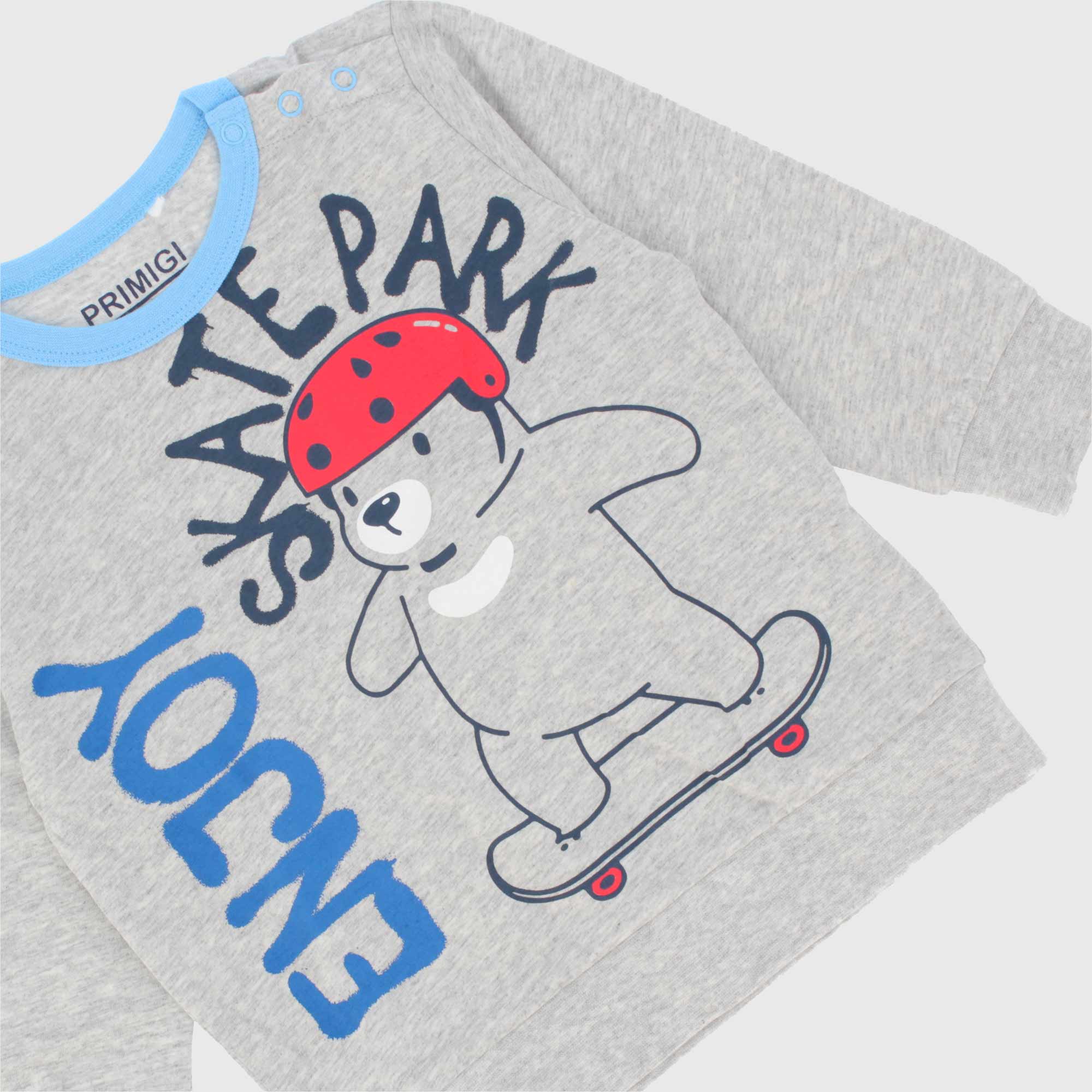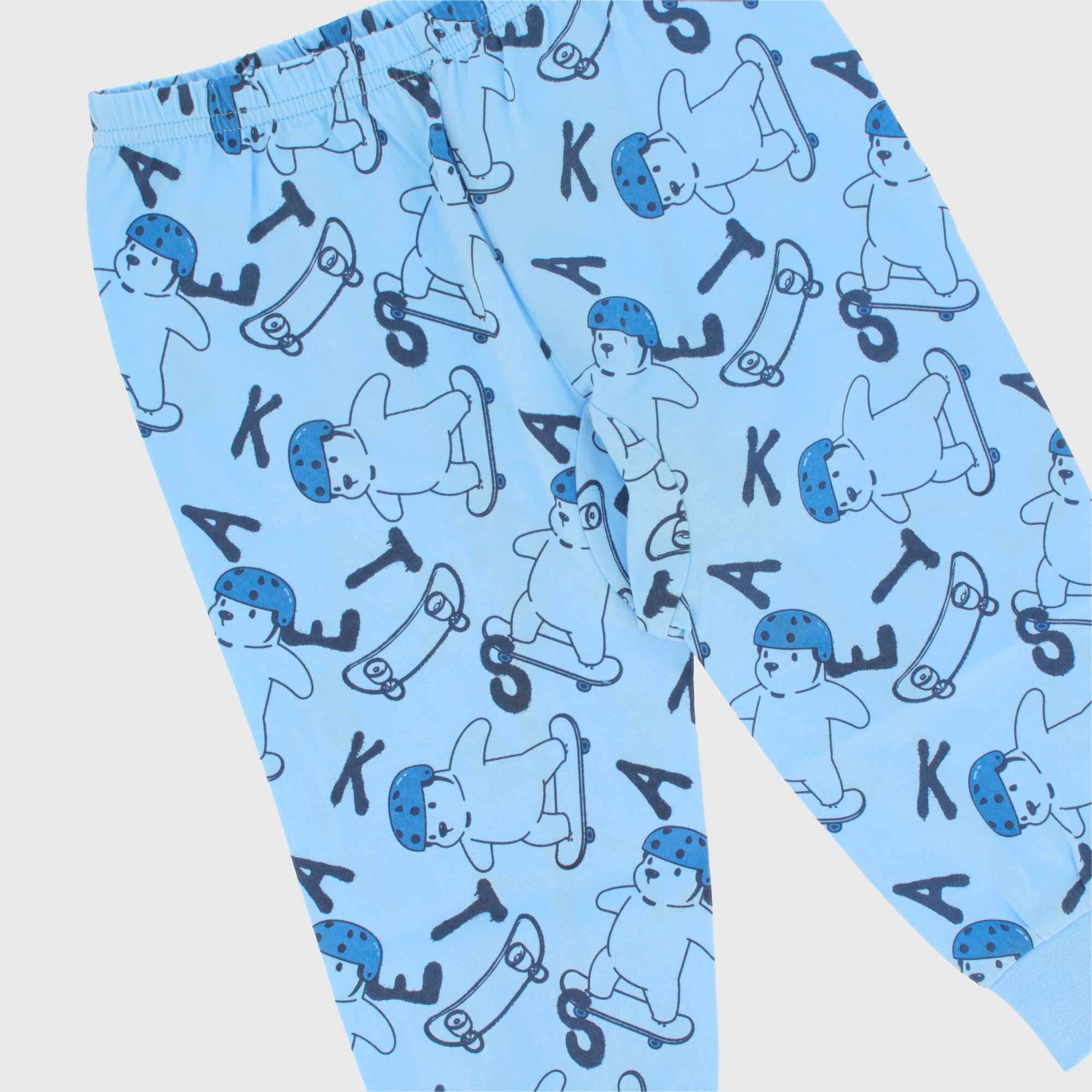 Kompletter Jersey-Pyjama. Langärmliges Hemd mit Rundhalsausschnitt, Druckknopfverschluss an der Schulter. Druck auf der Vorderseite. Hose mit elastischer Taille. Überall mit Druck.