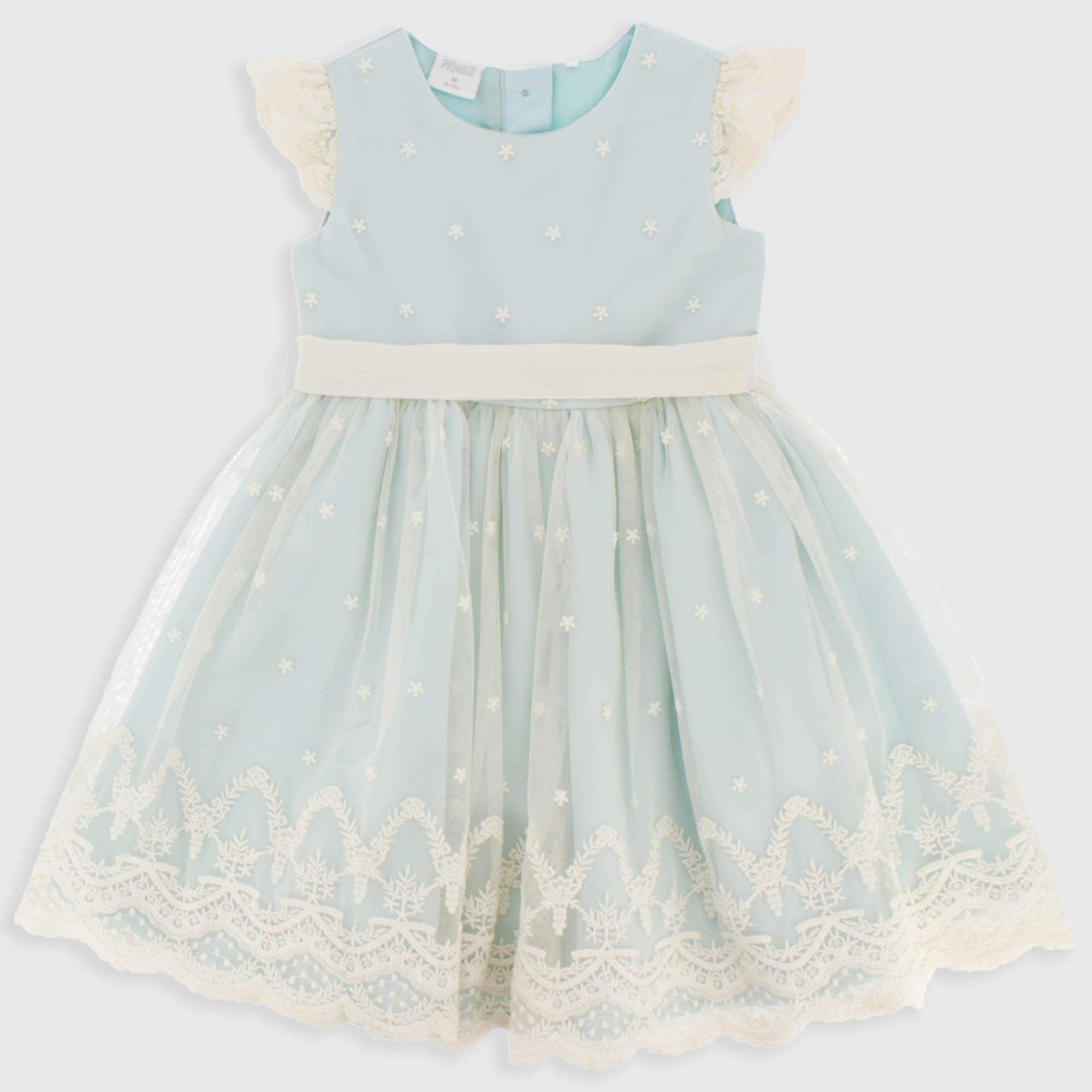 Kleid aus doppelter Satin mit bestickter Tulle, Rundhalsausschnitt, Armloch mit Rueschen aus Spitze. Hinterer Verschluss mit Knoepfe. Schnitt an der Taille mit Falten vorne und hinten. Futter aus Baumwollmusslin. Abnehmbarer Guertel aus crêpe.