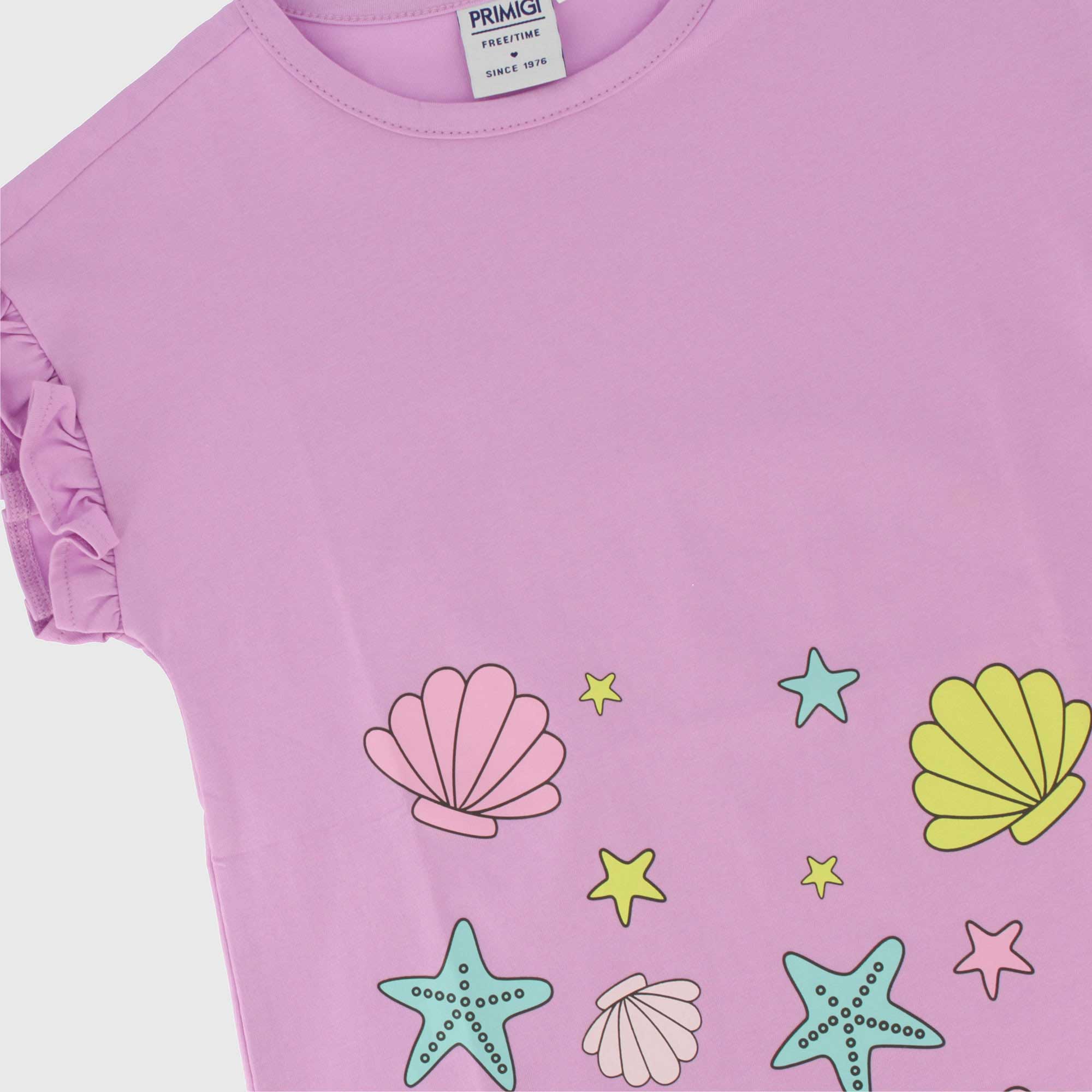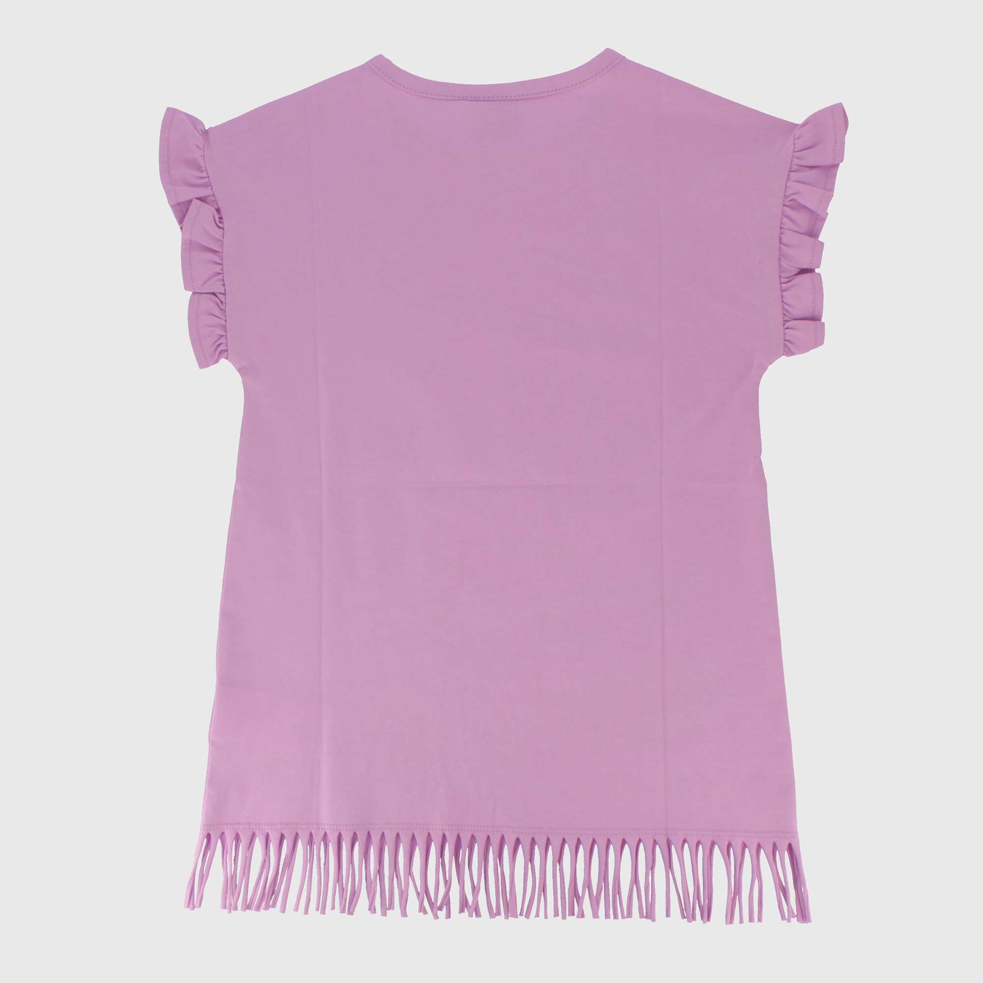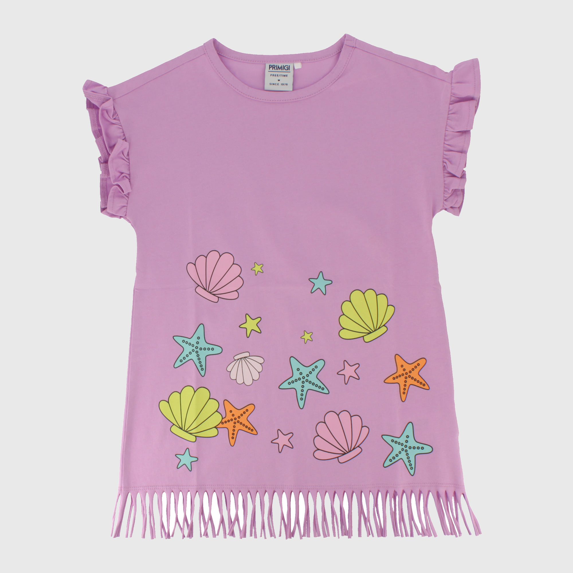 Badeanzugbedeckung aus Jersey, Rundhals, kurzarm mit Volants. Frontdruck. Unten mit Franzen.