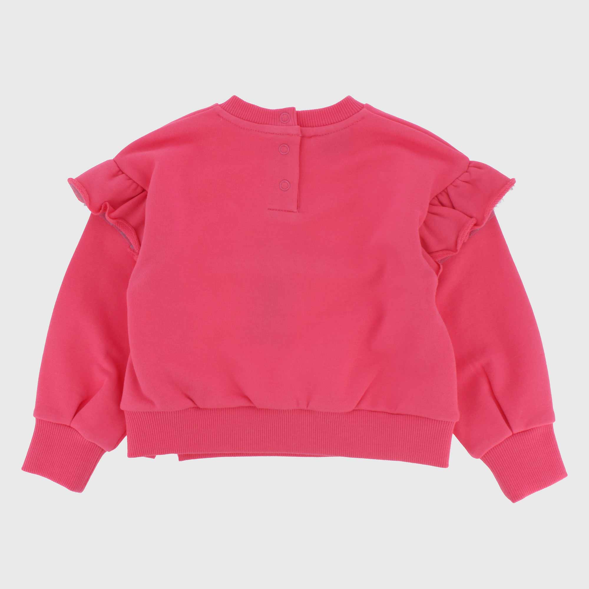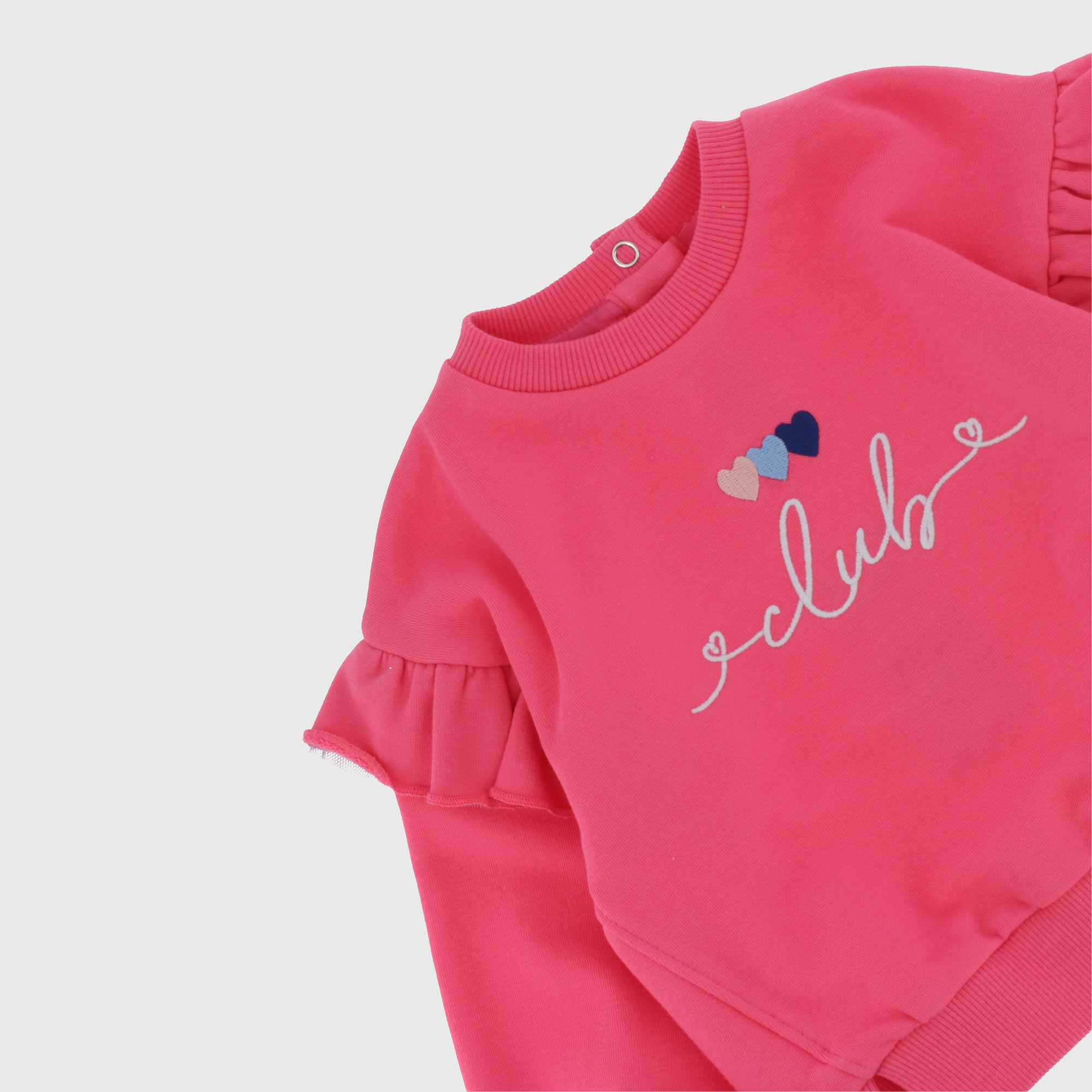 Rundhals Fleece Sweat-shirt Langarm. Hinterer Verschluss mit automatische Knoepfe. Rueschen auf der Schulter. Stickerei vorne. Kragen, Manschetten und unten gerippt. Schlitze vorne unten.