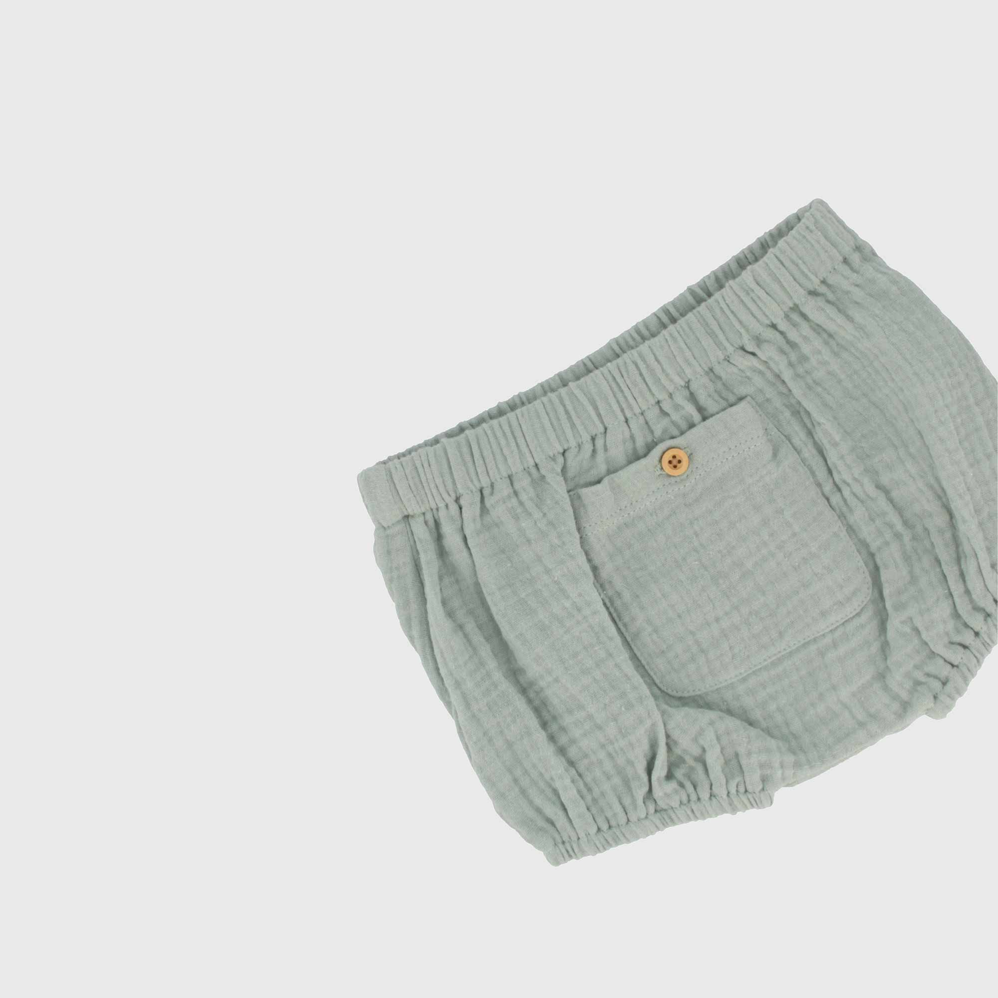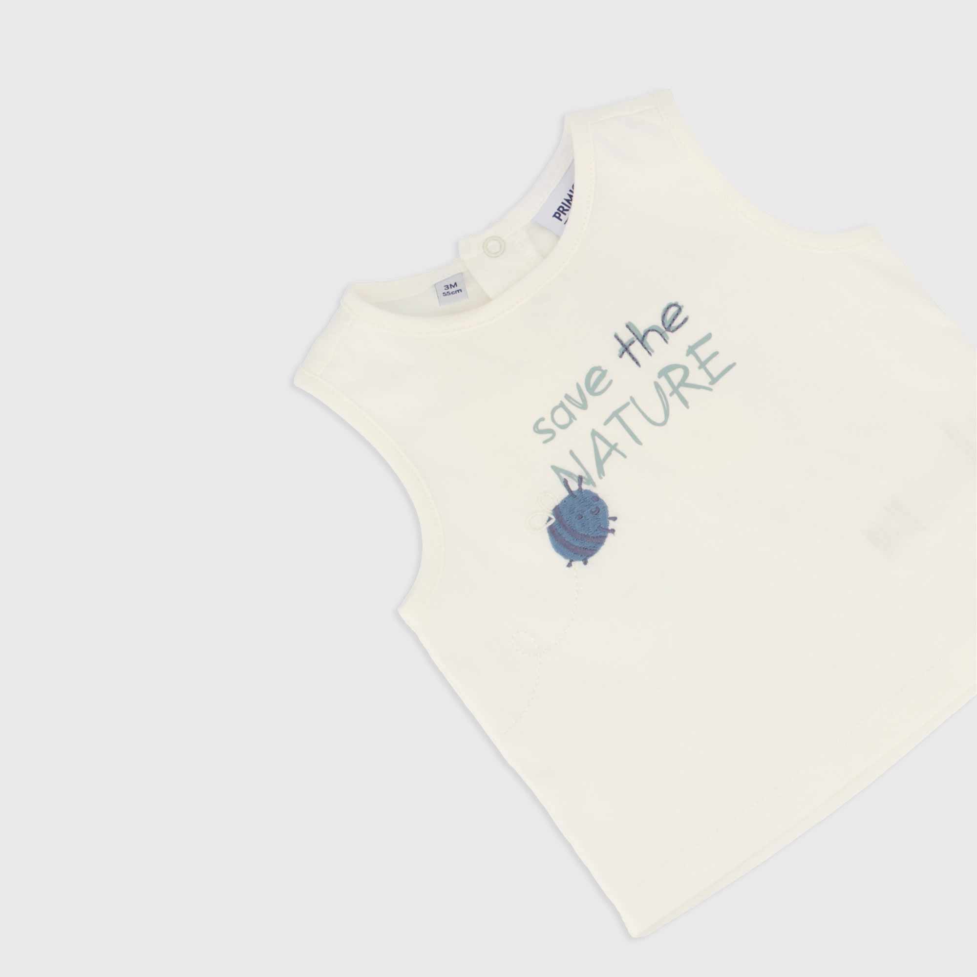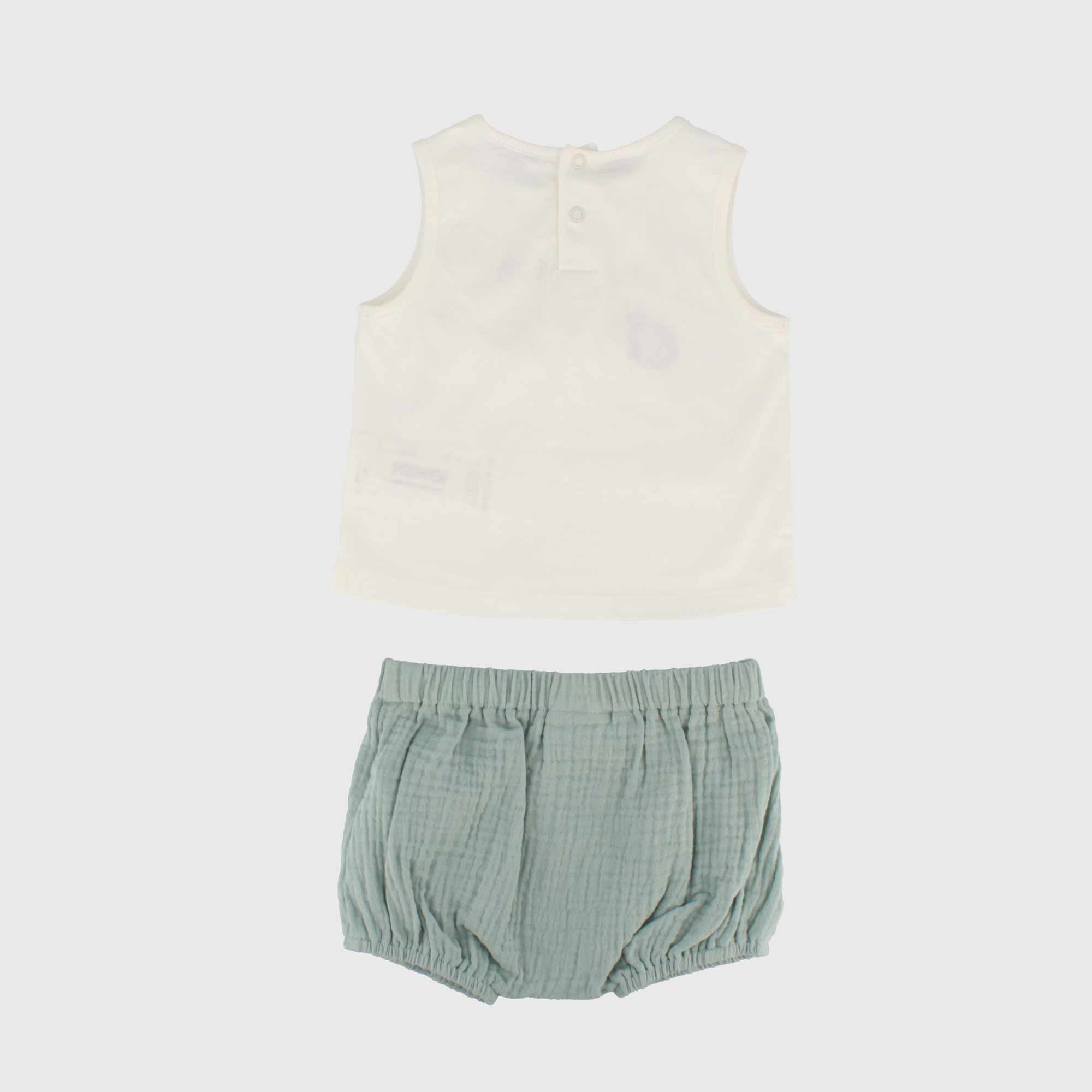 Set bestehend aus zwei Teile. Tank top aus Jersey round-neck. Hinterer Verschluss mit automatischen Knoepfe. Druck und Stickerei vorne. Bermuda aus Baumwolle-Gaze mit elastische Taille und aufgesetzte Taschen, vorne mit Knopf.
