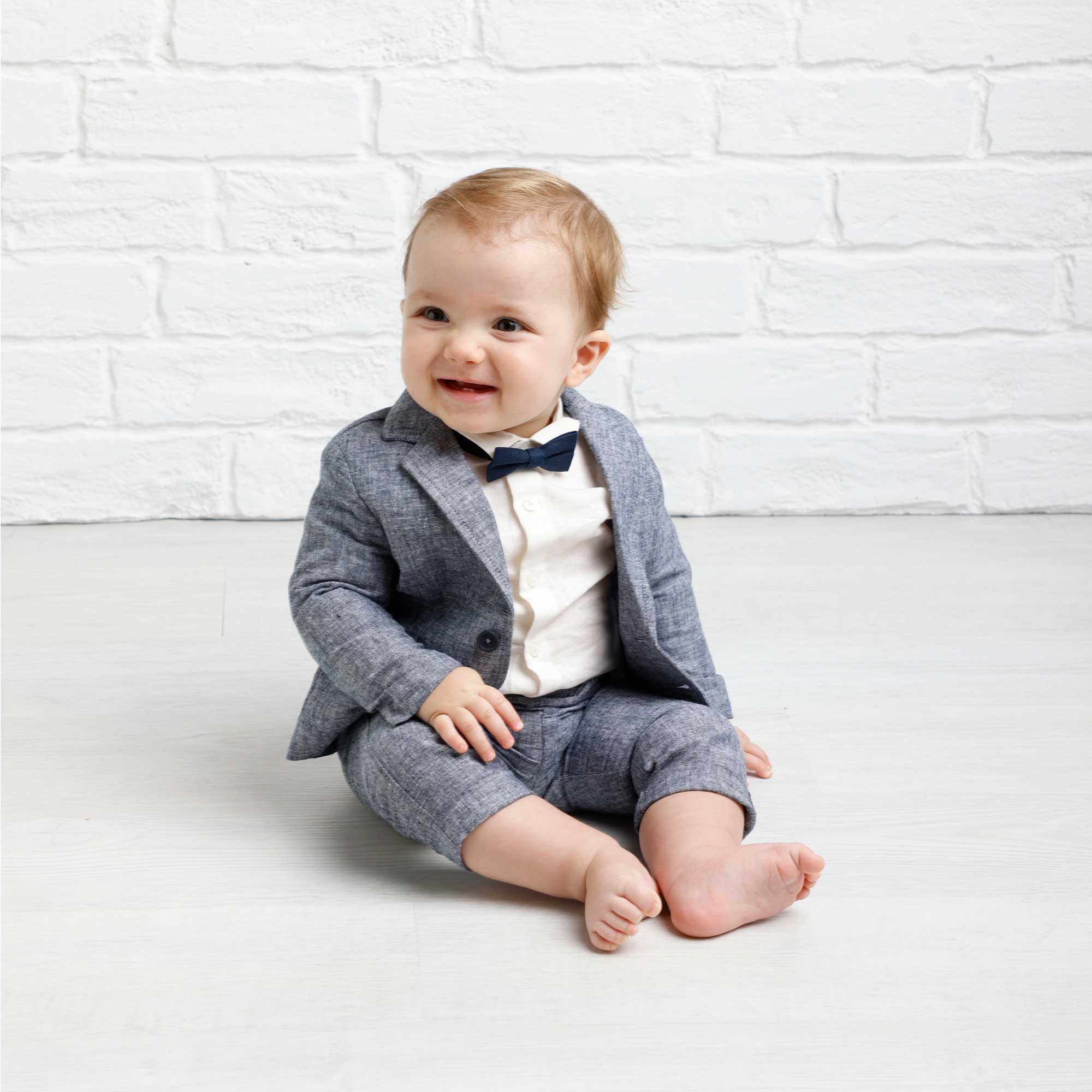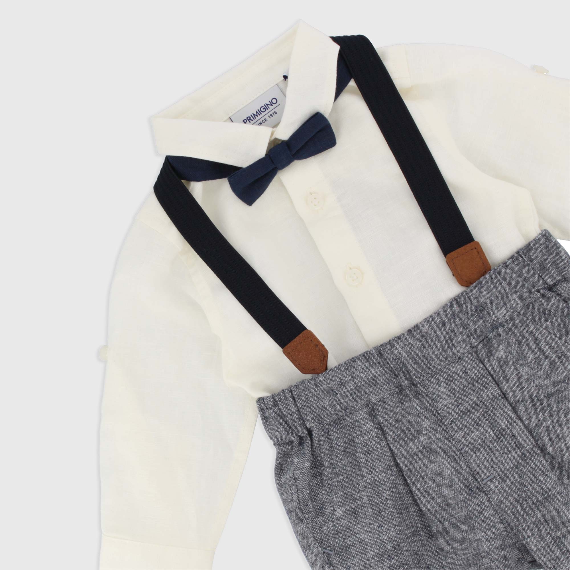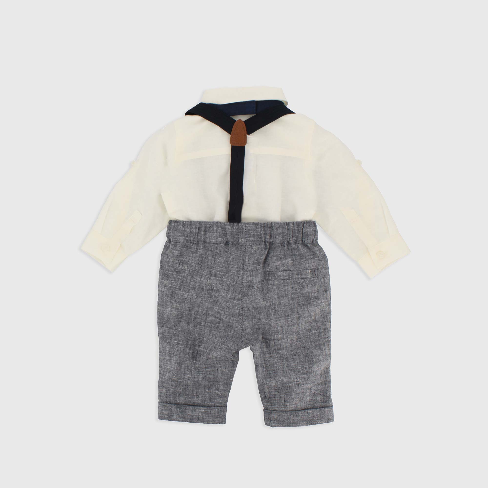 Set aus Linen / Baumwolle bestehend aus vier Teile. Hemd langaermel, mit einstellbare Laenge dank des Knopfes auf den Aermeln. Verschluss vorne mit Knoepfe . Hose mit abnehmbare Traeger. Elastische Taille und unten mit Revers. Papillon mit Verschluss und Velcro.